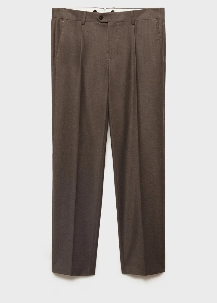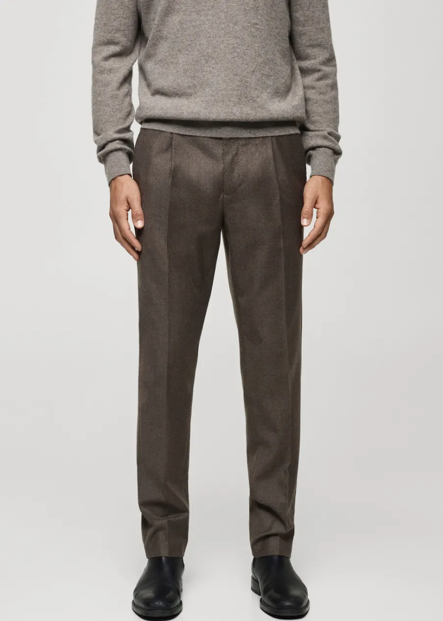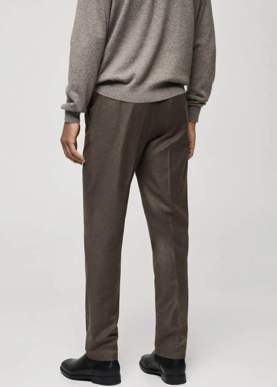 Kolekcja Selection. Tkanina z 100% włoskiej wełny dziewiczej marki LANEROSSI BY MARZOTTO. Wyprodukowano w Portugalii. Zakładki z przodu. Zaprasowany kant z przodu i z tyłu. Zapięcie z przodu na guzik, haftkę i zamek. Guziki na szelki po wewnętrznej stronie pasa. Szlufki na pasek. Dwie wpuszczane kieszenie boczne. Dwie kieszenie z obszyciem i guzikiem z tyłu. Model ma 185 cm wzrostu i nosi rozmiar 42.