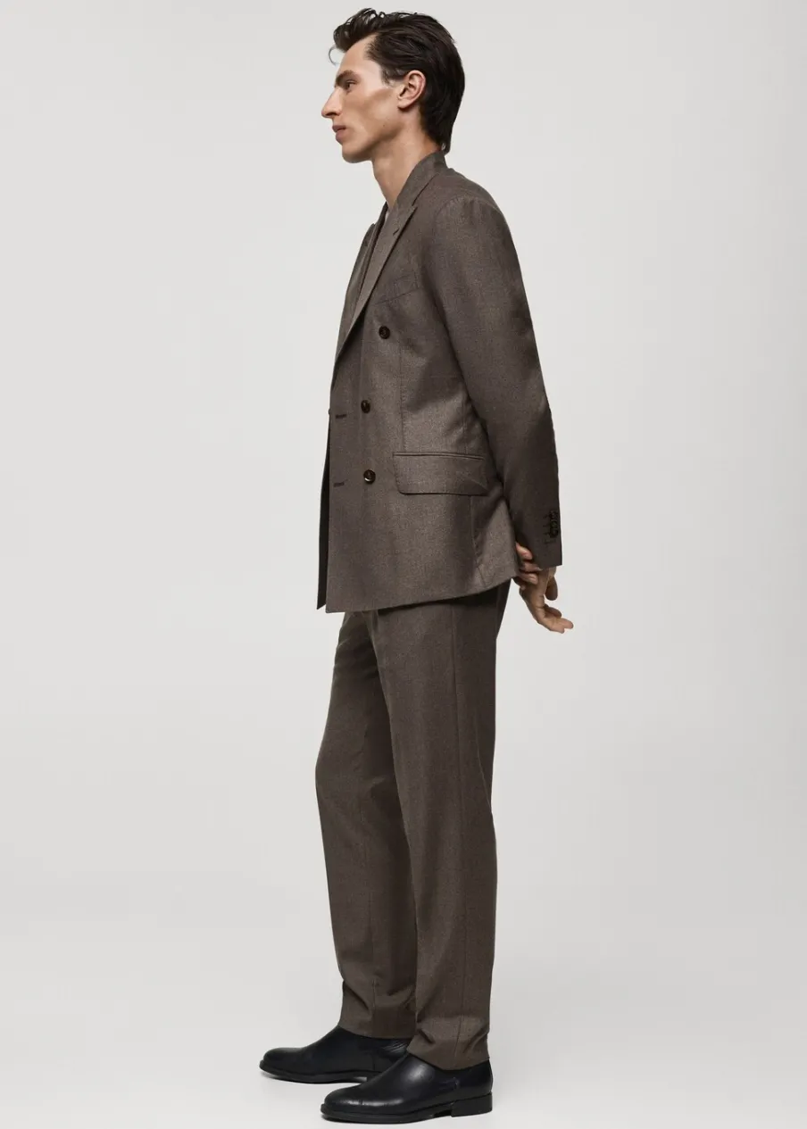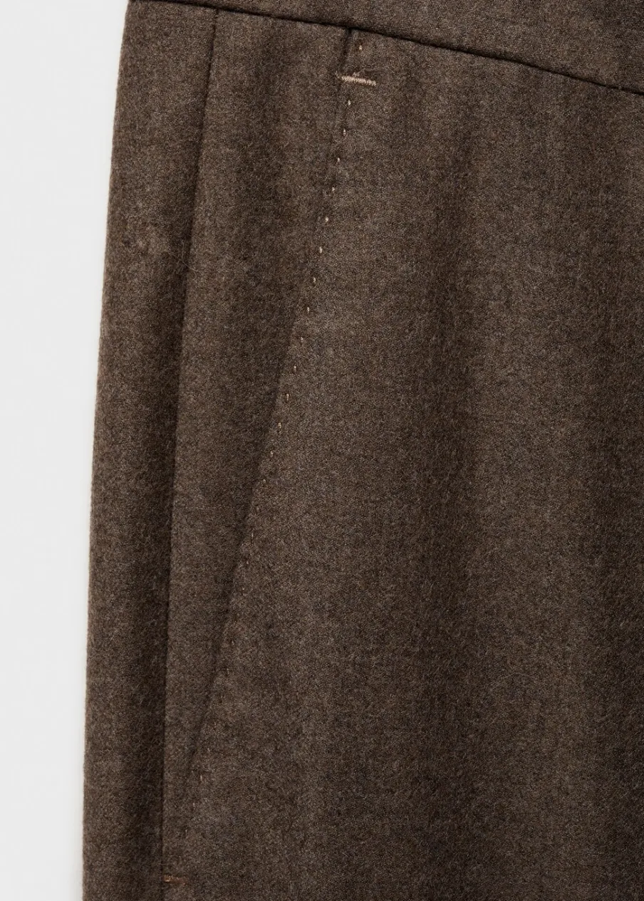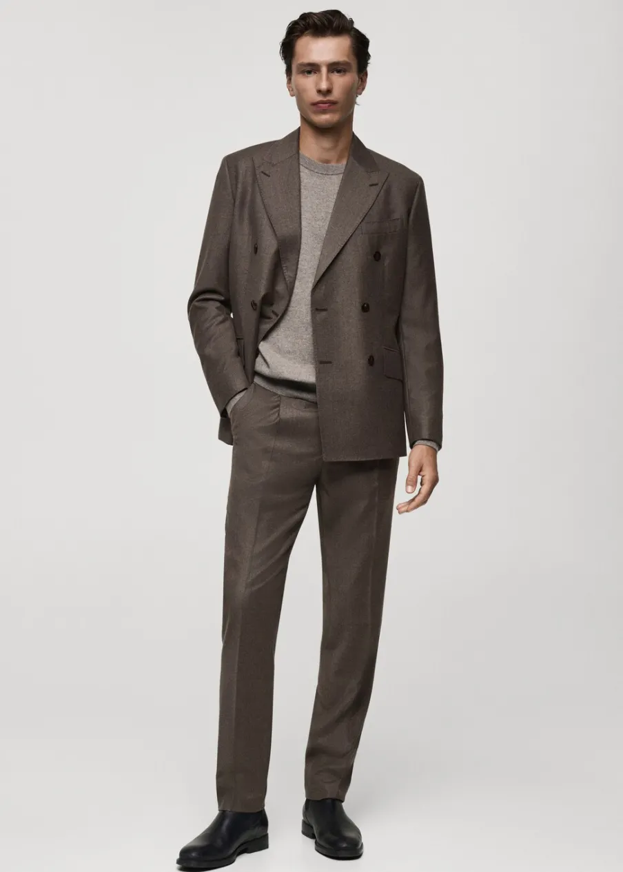 Kolekcja Selection. Tkanina z 100% włoskiej wełny dziewiczej marki LANEROSSI BY MARZOTTO. Wyprodukowano w Portugalii. Zakładki z przodu. Zaprasowany kant z przodu i z tyłu. Zapięcie z przodu na guzik, haftkę i zamek. Guziki na szelki po wewnętrznej stronie pasa. Szlufki na pasek. Dwie wpuszczane kieszenie boczne. Dwie kieszenie z obszyciem i guzikiem z tyłu. Model ma 185 cm wzrostu i nosi rozmiar 42.