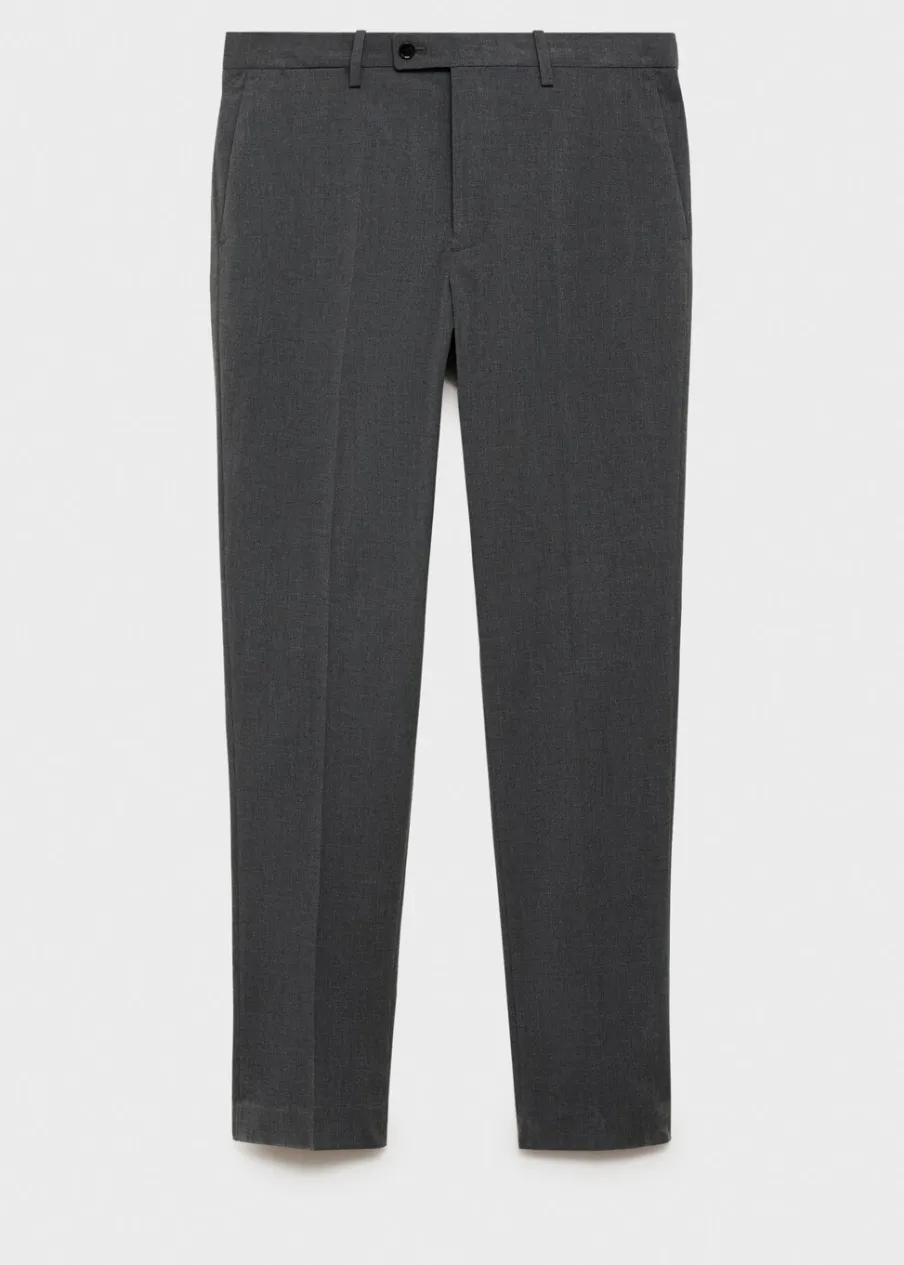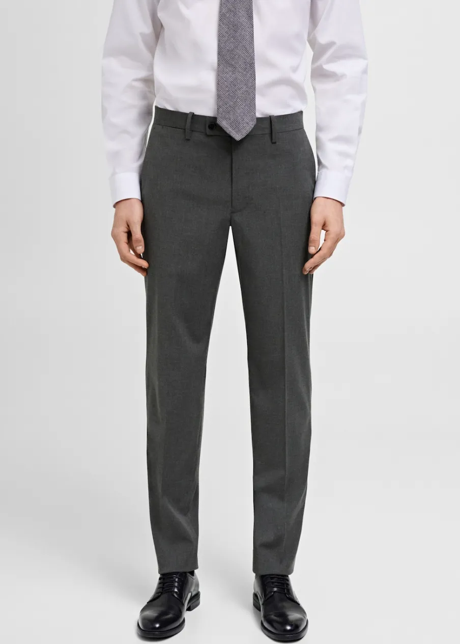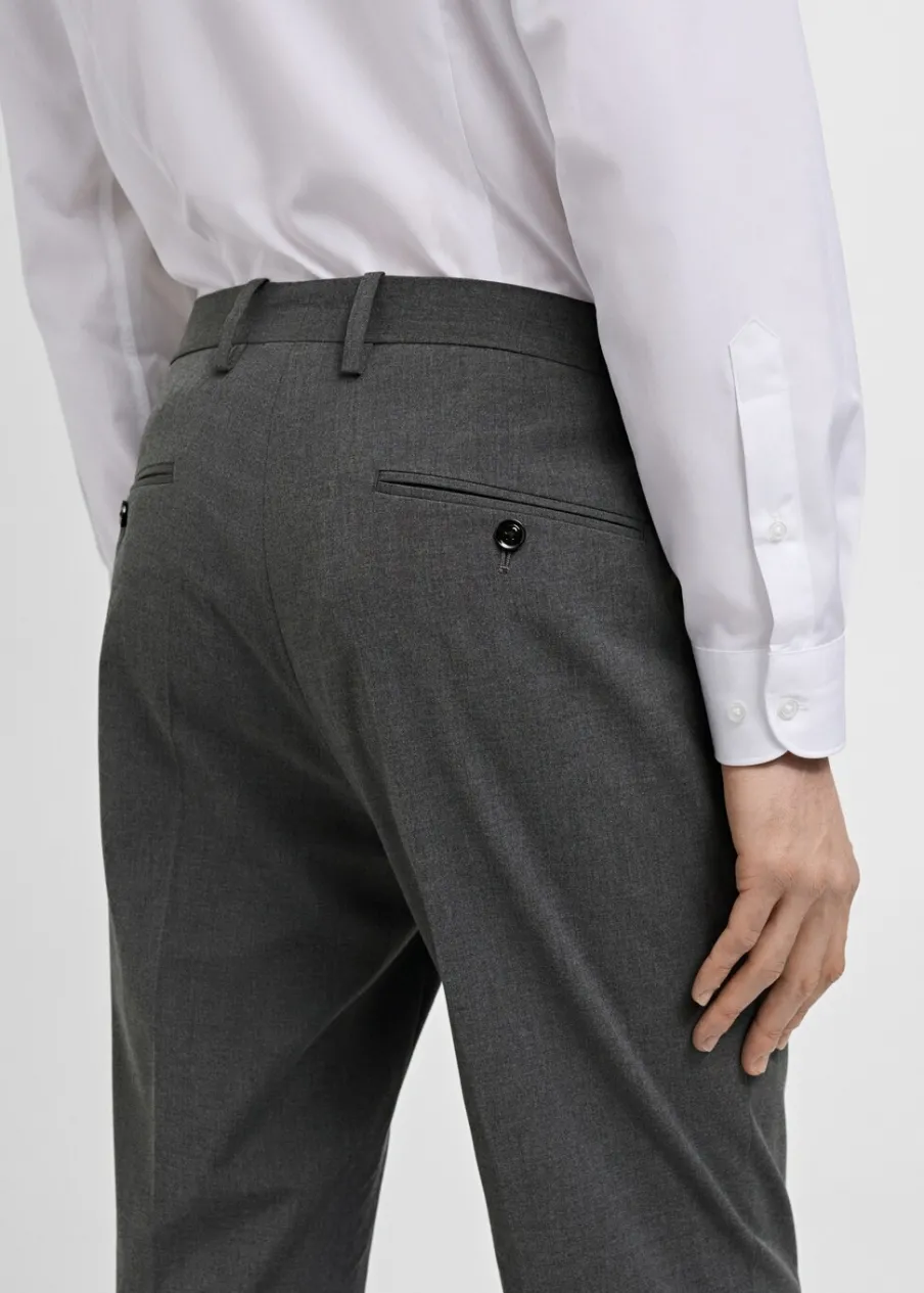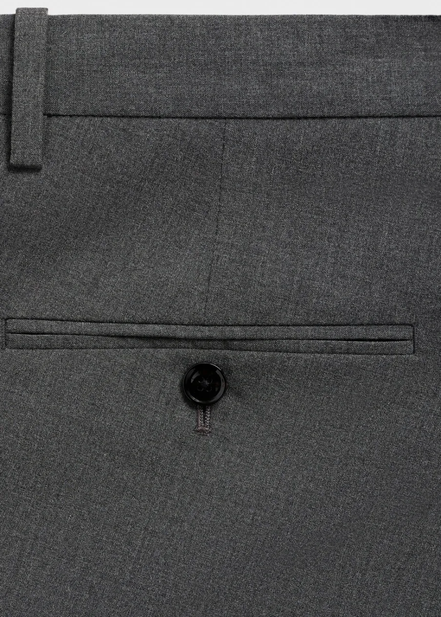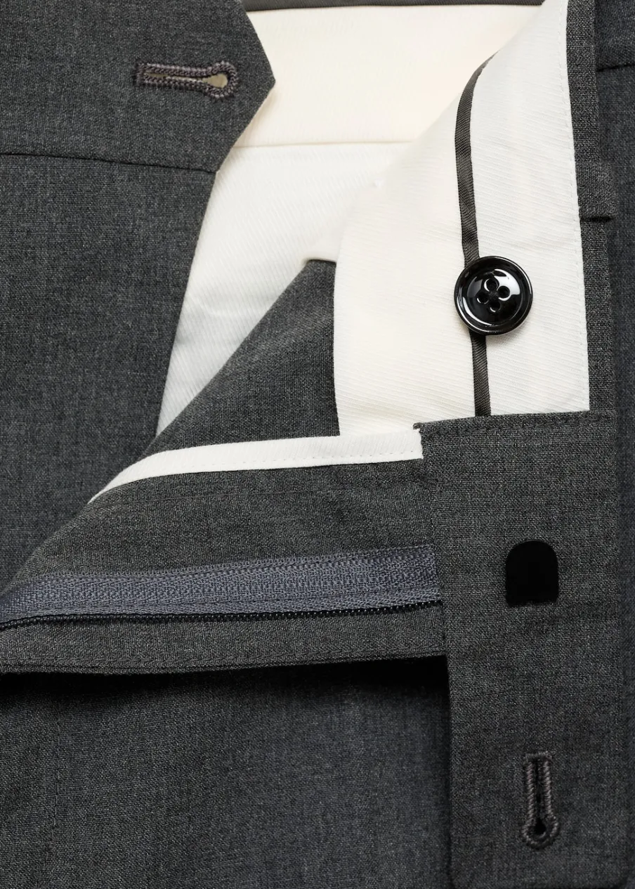 Slim-fit. Zapięcie na zamek z przodu, z dwiema haftkami i guzikiem od wewnątrz. Zaprasowany kant z przodu i z tyłu. Kieszonka biletowa. Dwie kieszenie z przodu. Dwie kieszenie z obszyciem i guzikiem z tyłu. Szlufki na pasek. Model ma 190 cm wzrostu i nosi rozmiar 42.