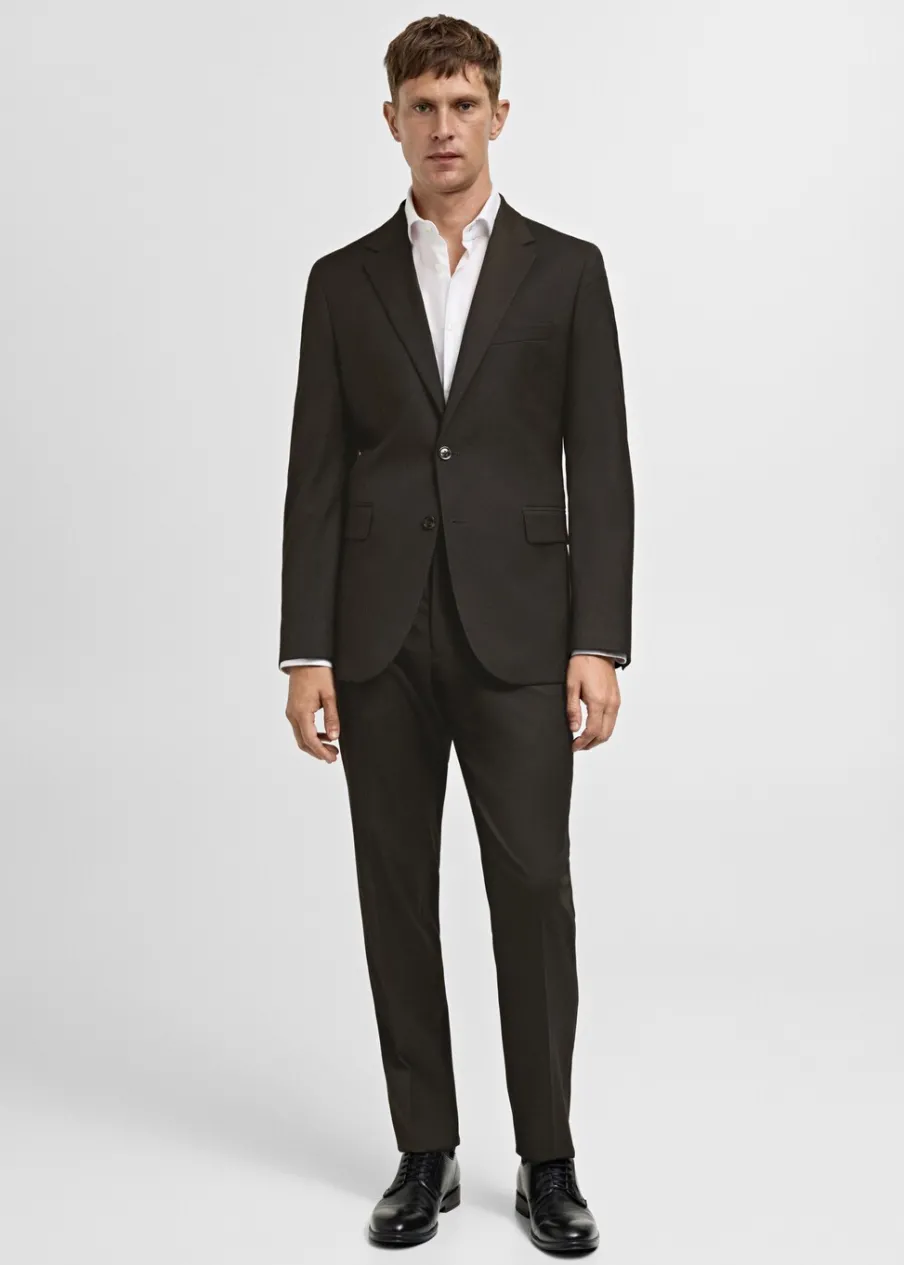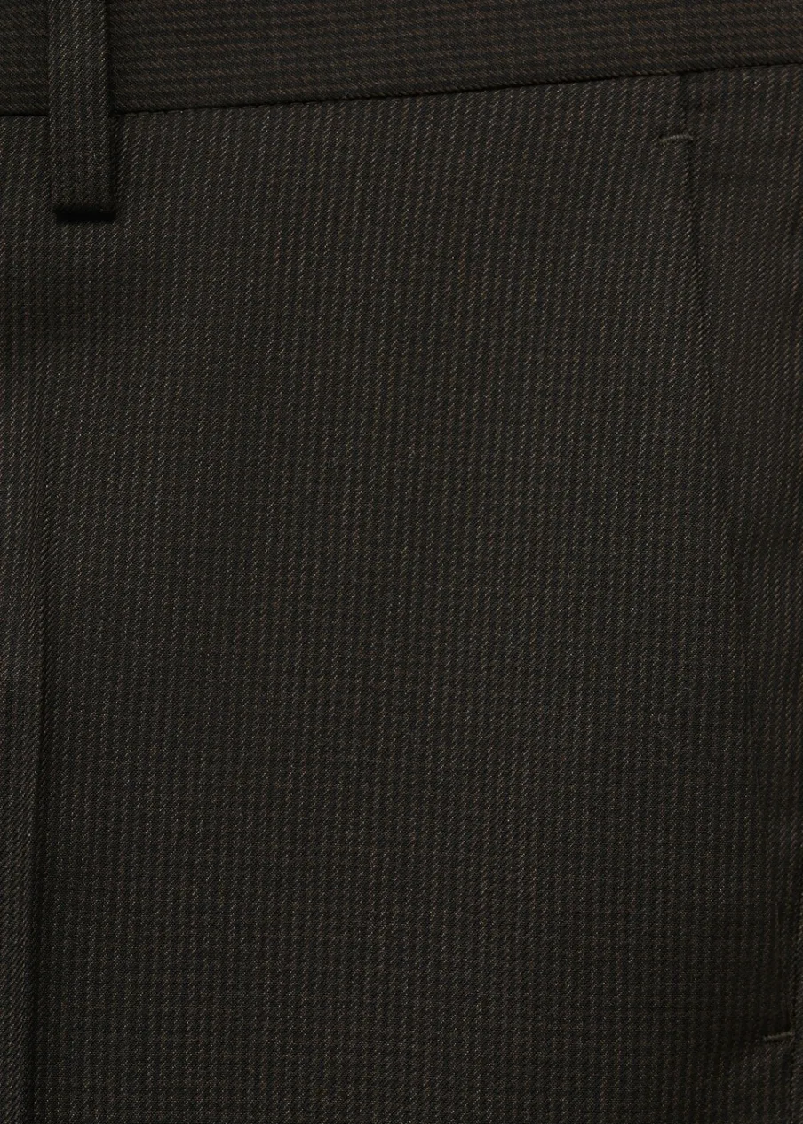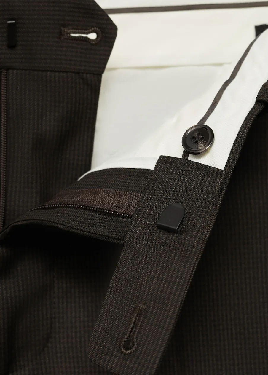 Slim-fit. Comfort stretch: elastyczna tkanina dla większego komfortu. Wzór w drobną kurzą stopkę. Średni stan. Szlufki na pasek. Kryte zapięcie na guzik, haftkę i suwak. Dwie kieszenie boczne. Ukryta kieszonka na monety na wysokości biodra. Dwie wpuszczane kieszenie z guzikiem z tyłu. Model ma 185 cm wzrostu i nosi rozmiar 42. Zaprasowany kant z przodu i z tyłu. Komfort: to ubranie zapewnia pełną swobodę ruchu i odzyskuje swój pierwotny kształt.