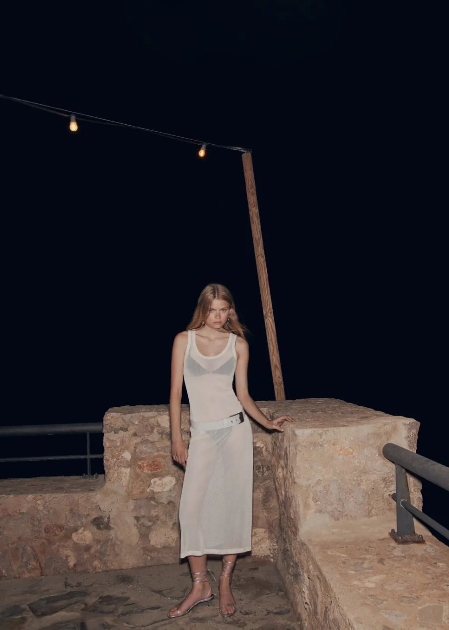 Tkanina mieszanka bawełny. Model długi. Model prosty. Ażurowy model. Okrągły dekolt. Bez rękawów. Szerokie ramiączka. Bez zapięcia.