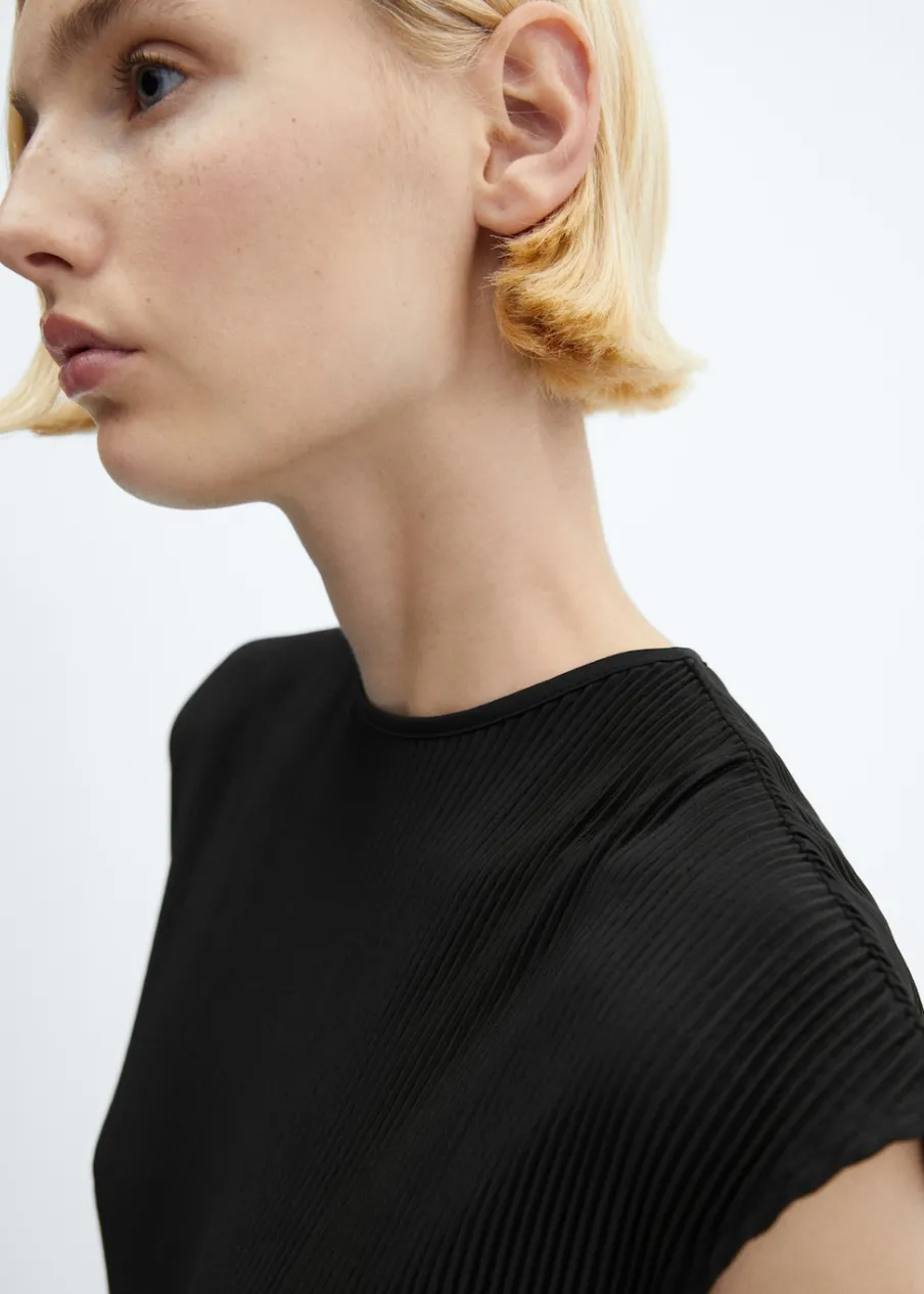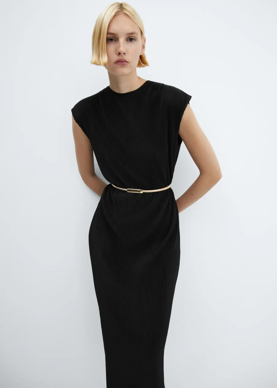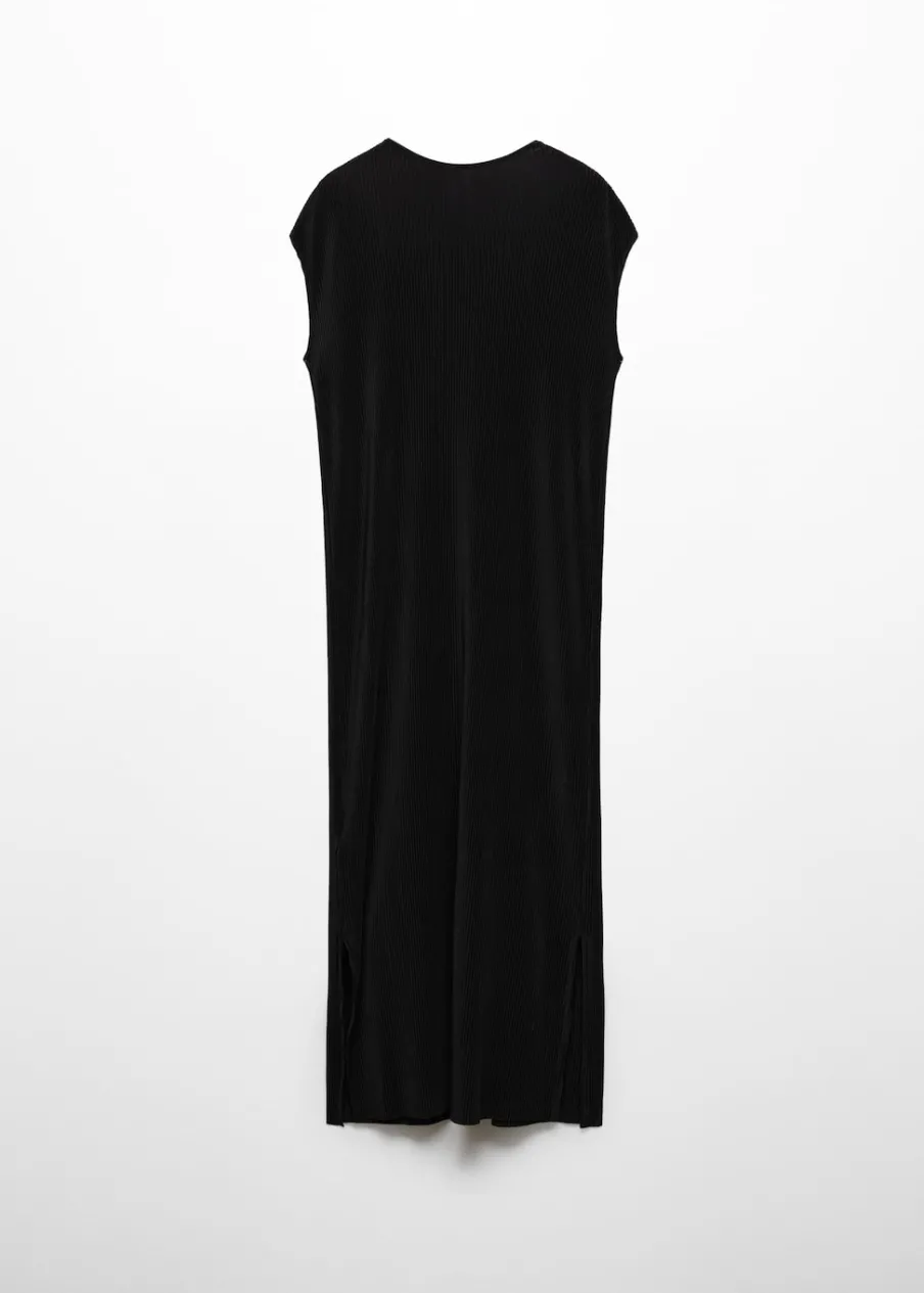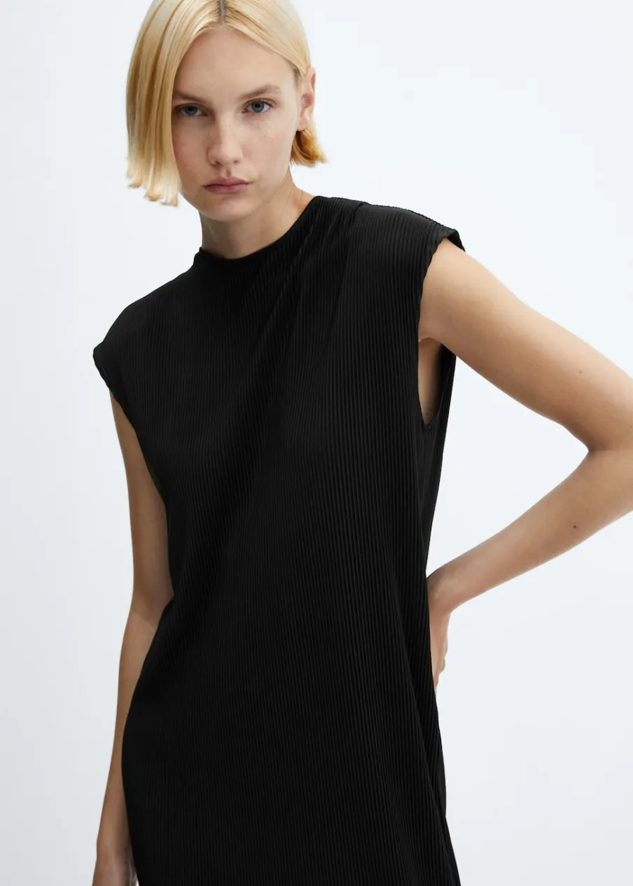 Lejąca tkanina. Plisowana tkanina. Model długi. Model prosty. Dekolt w kształcie łódki. Krótki rękaw. Zapięcie na guzik z tyłu. Dół z rozcięciem po bokach. Kolekcja wizytowa.