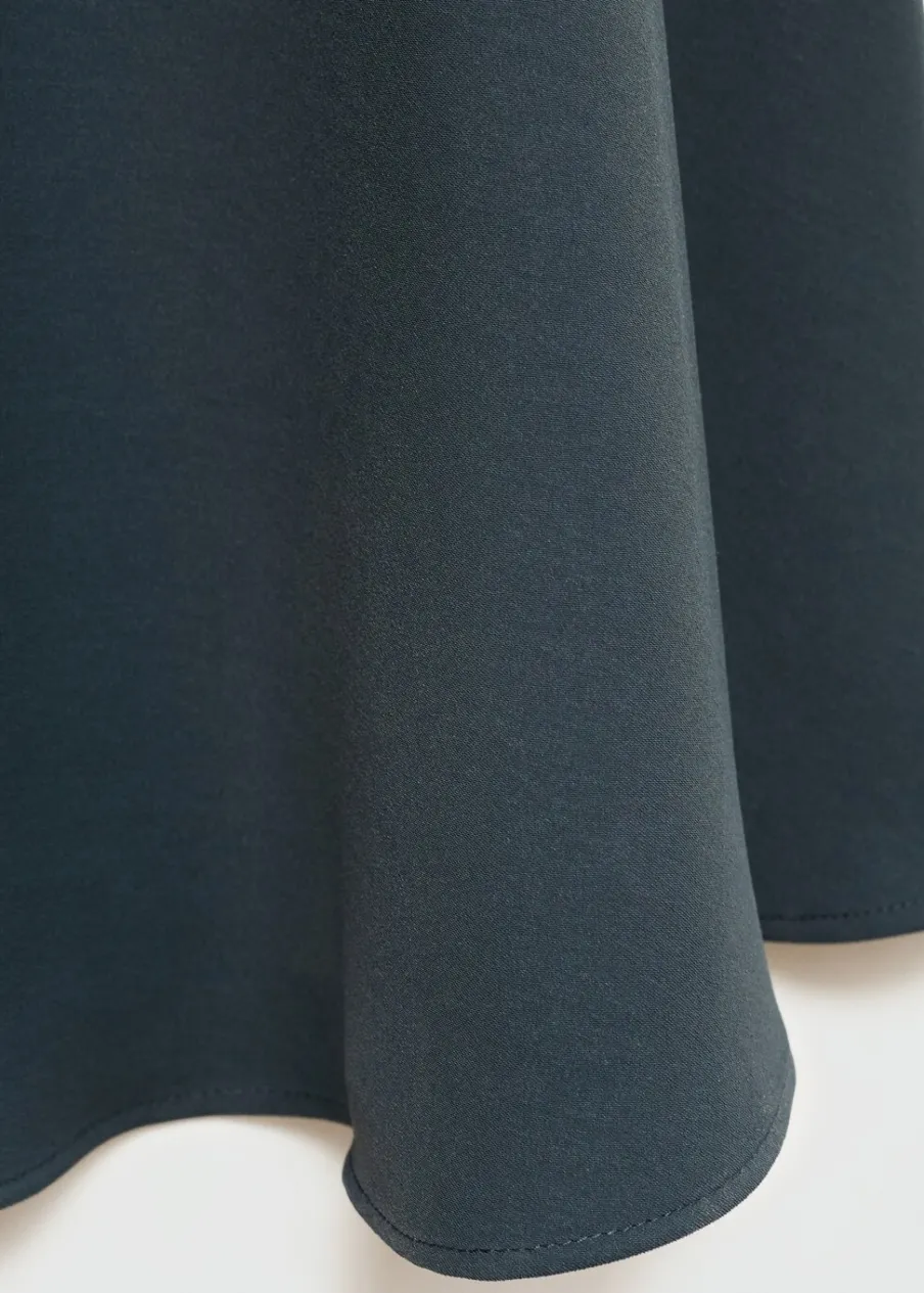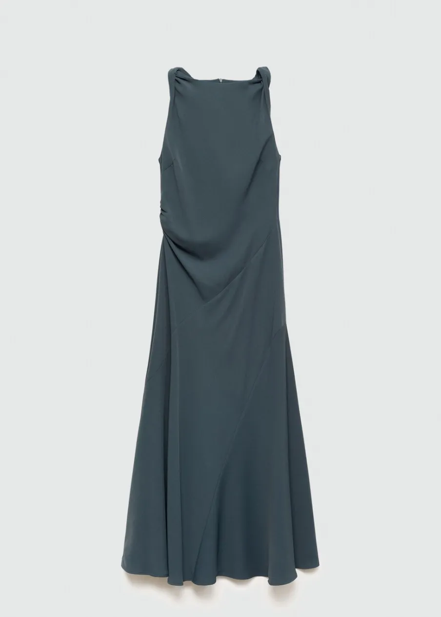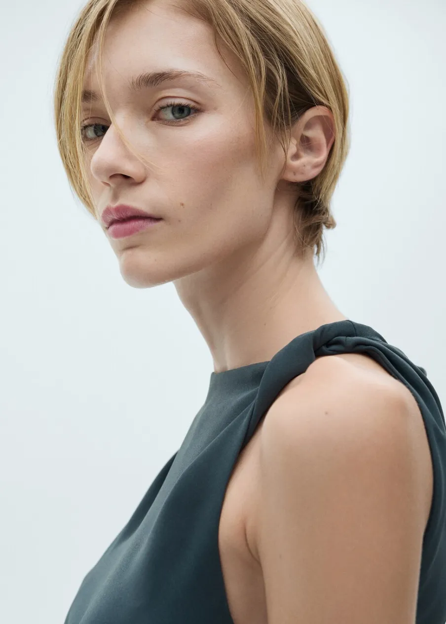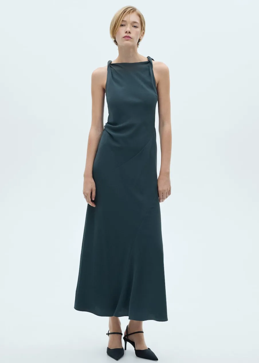 Lejąca tkanina. Model długi. Model evasé. Okrągły dekolt. Bez rękawów. Plecione szelki. Zapięcie z tyłu na kryty suwak. Modelka ma 181 cm wzrostu i nosi rozmiar S/36.