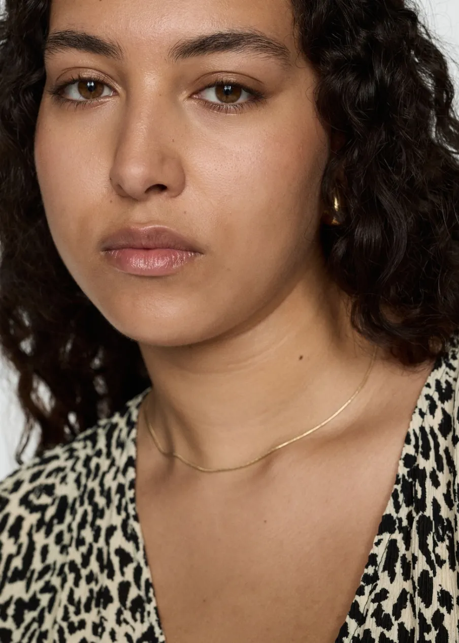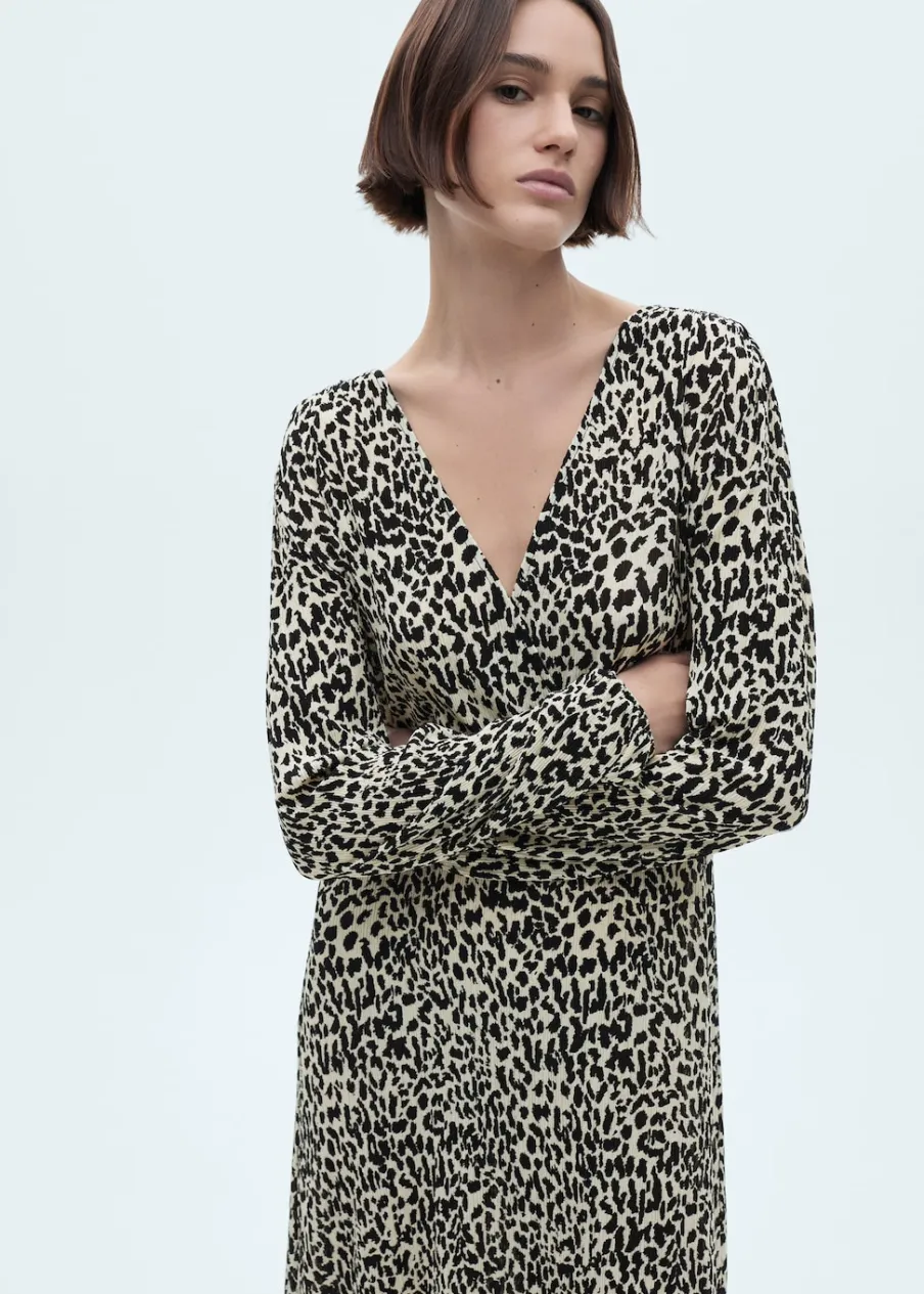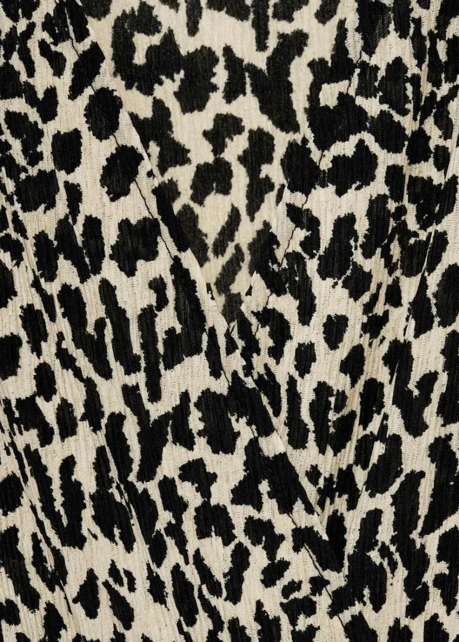 Lejąca tkanina. Model długi. Model prosty. Wzór w lamparcie cętki. Zwierzęcy wzór. Dekolt V. Długi rękaw. Bez zapięcia. Modelka ma 179 cm wzrostu i nosi rozmiar S/36.