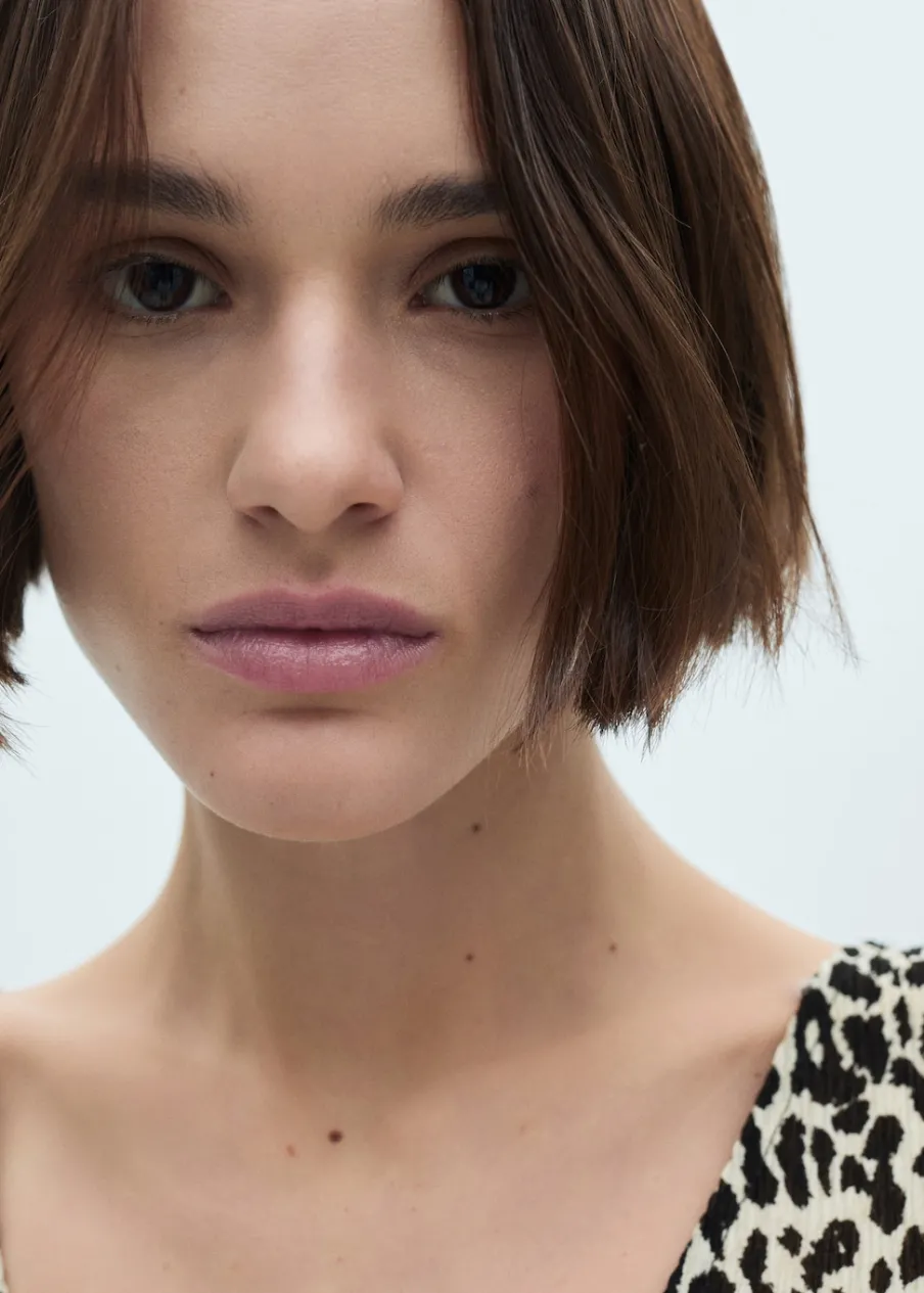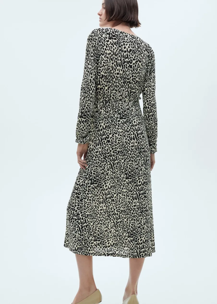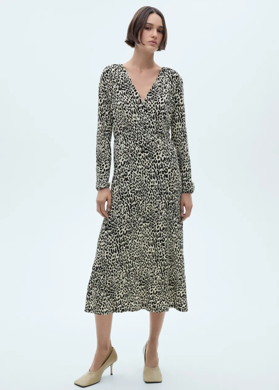 OpisLejąca tkanina. Model długi. Model prosty. Wzór w lamparcie cętki. Zwierzęcy wzór. Dekolt V. Długi rękaw. Be…