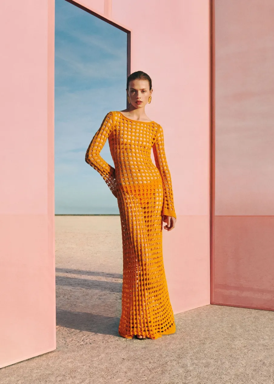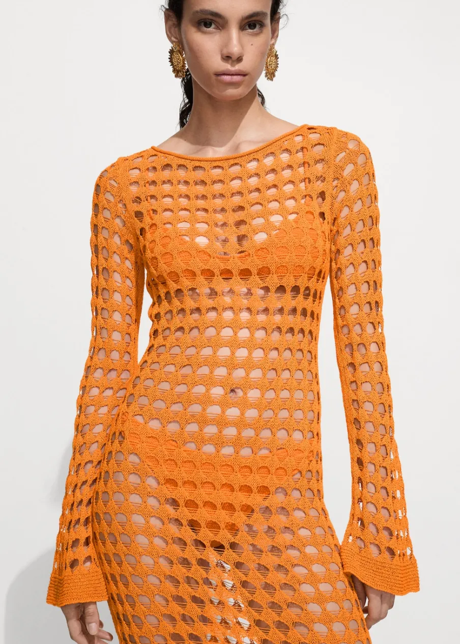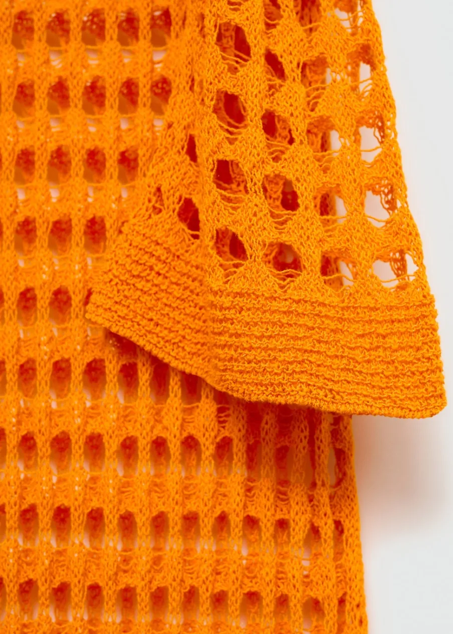 OpisTkanina mieszanka bawełny. Dzianina średniej grubości. Model długi. Model prosty. Ażurowy model. Okrągły deko…