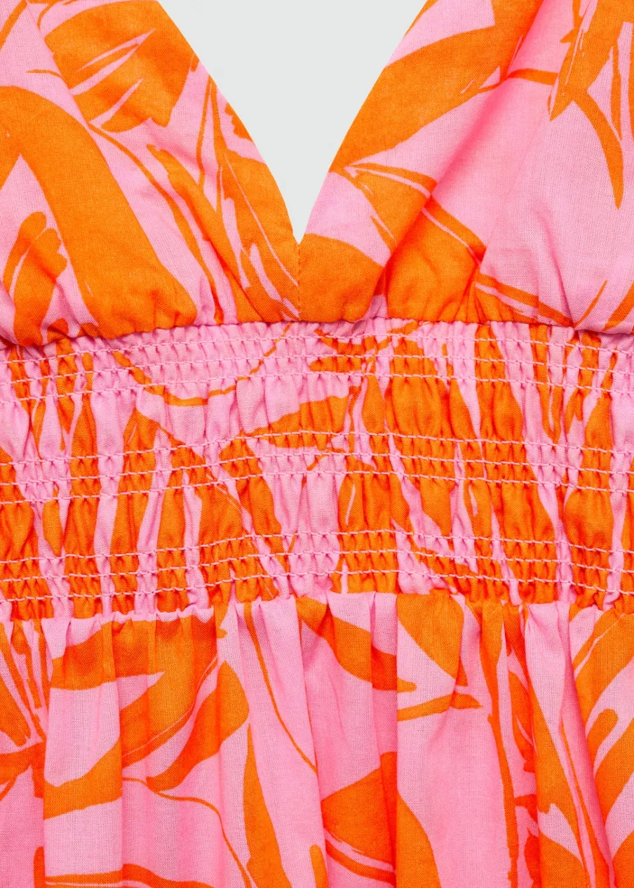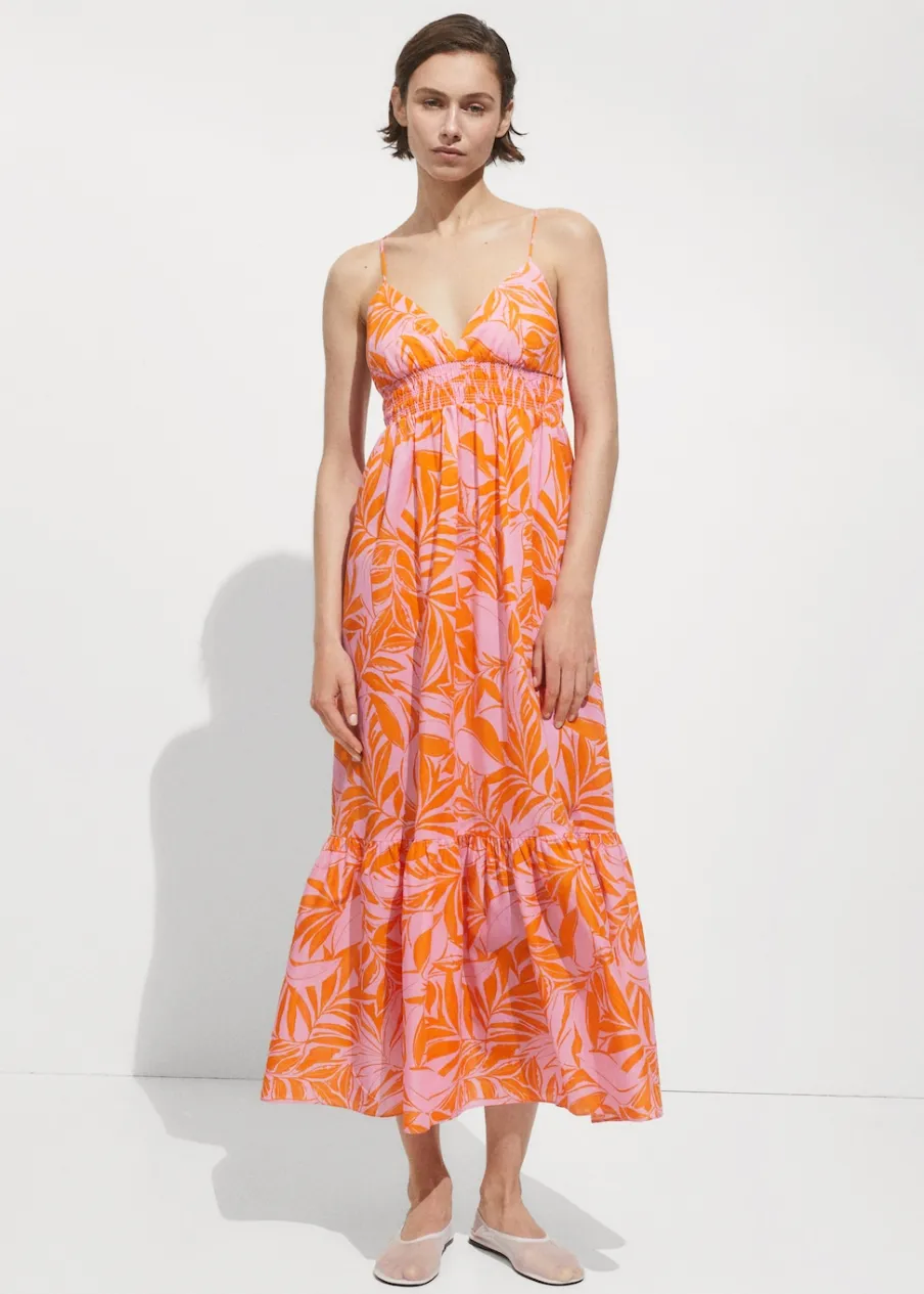 Model długi. Model evasé. Dekolt V. Cienkie ramiączka. Falbana u dołu. Elastyczna wstawka. Nadruk. Tkanina z 100% bawełny.