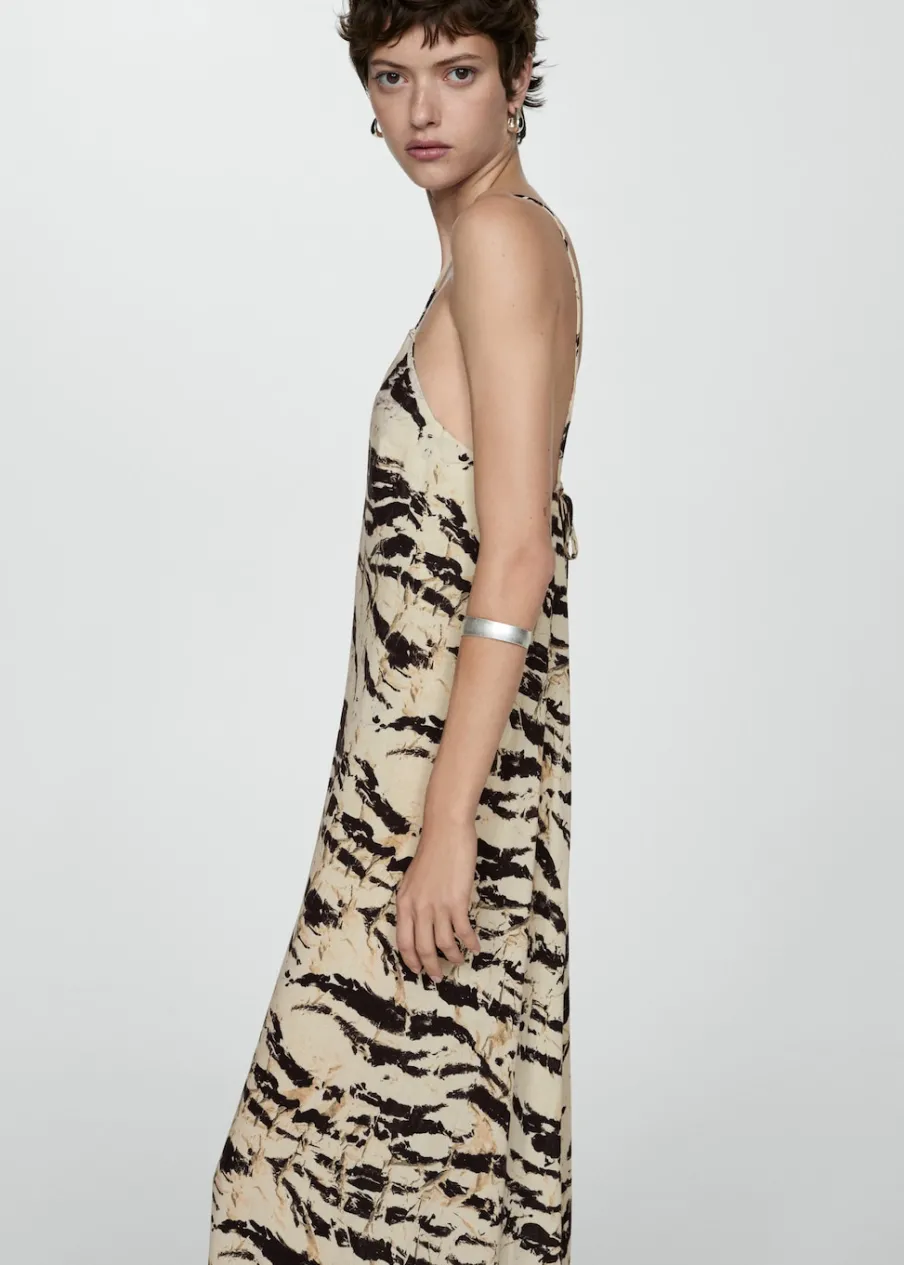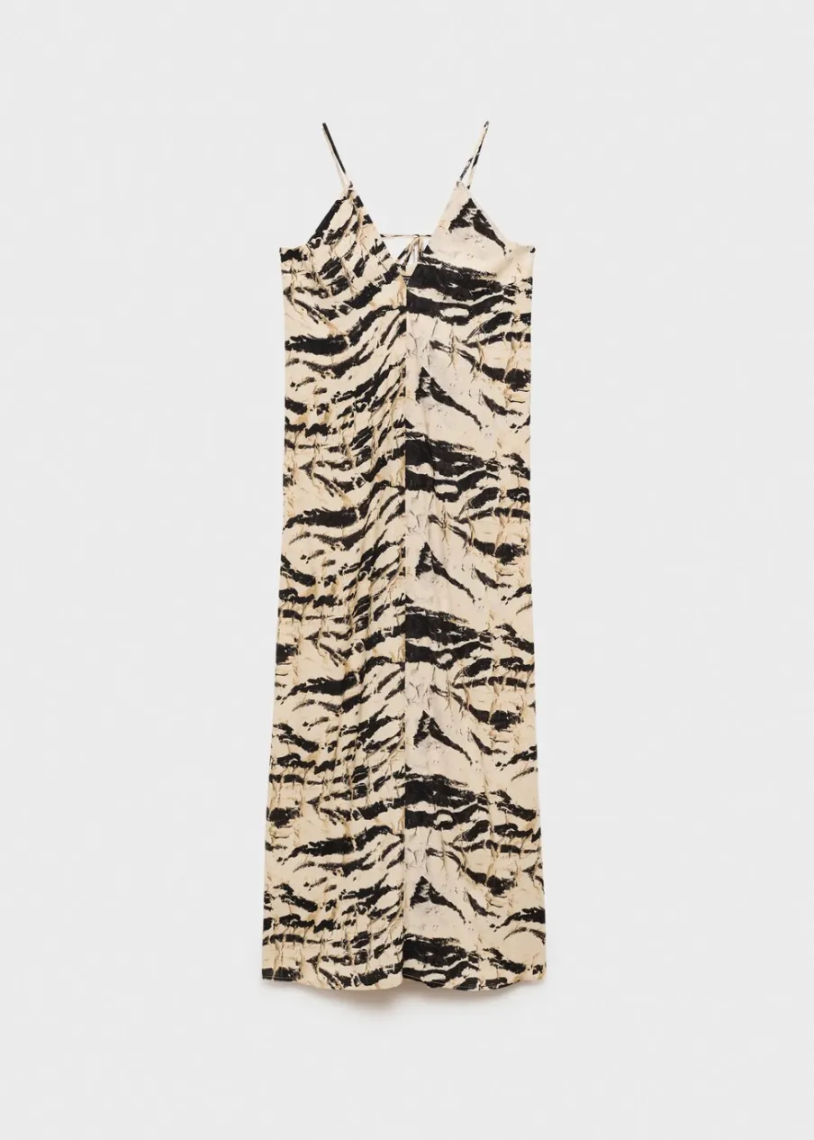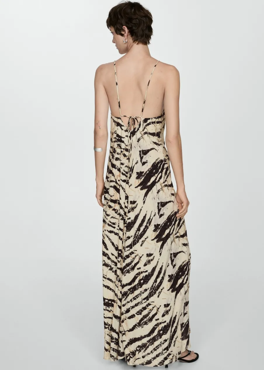 Lejąca tkanina. Model evasé. Model długi. Zwierzęcy wzór. Dekolt V. Bez rękawów. Cienkie ramiączka. Wiązanie z tyłu.