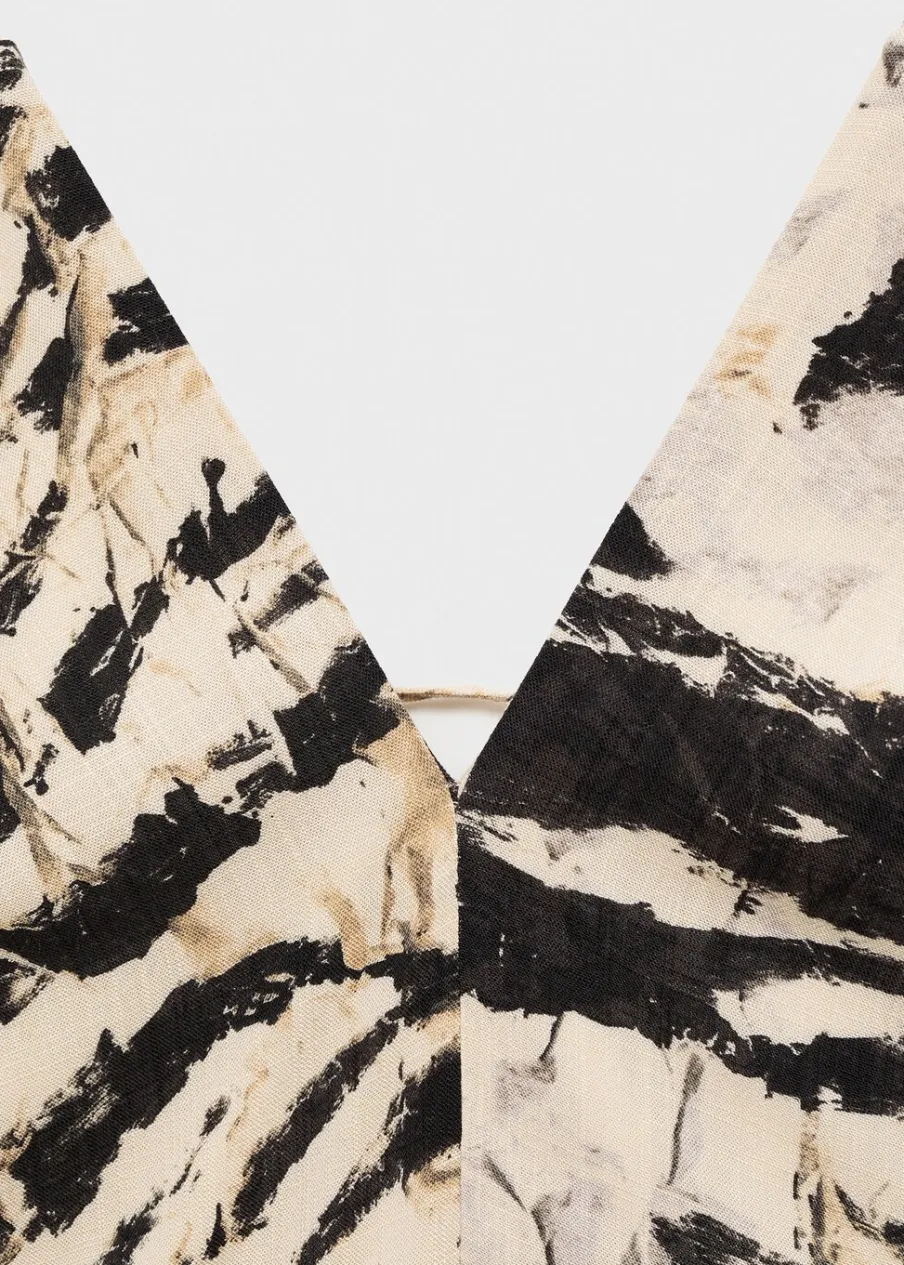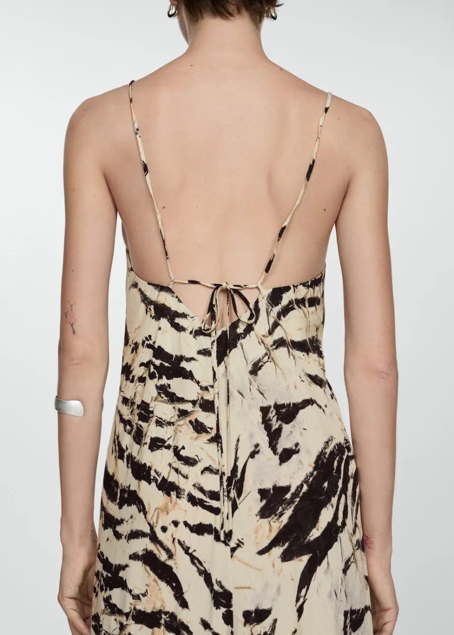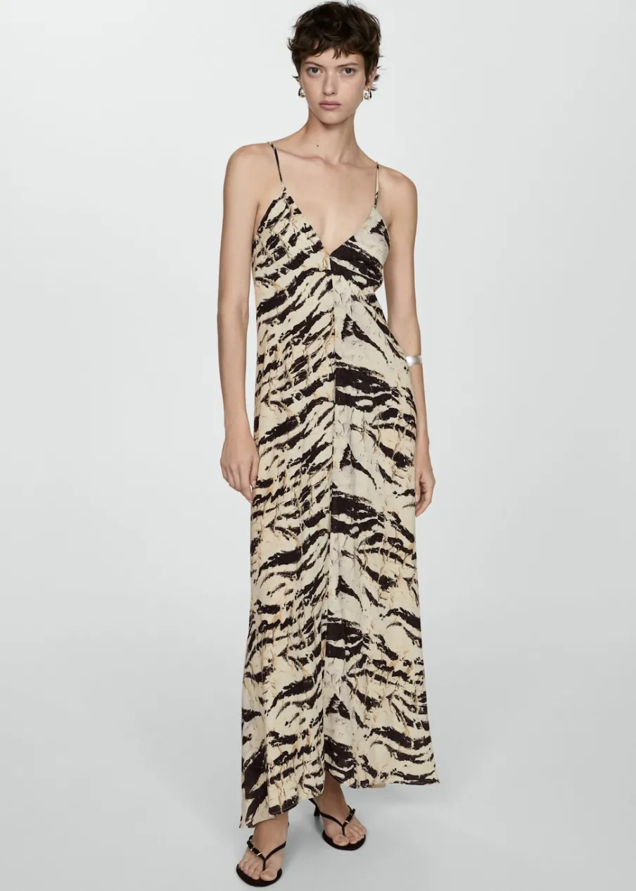 Lejąca tkanina. Model evasé. Model długi. Zwierzęcy wzór. Dekolt V. Bez rękawów. Cienkie ramiączka. Wiązanie z tyłu.
