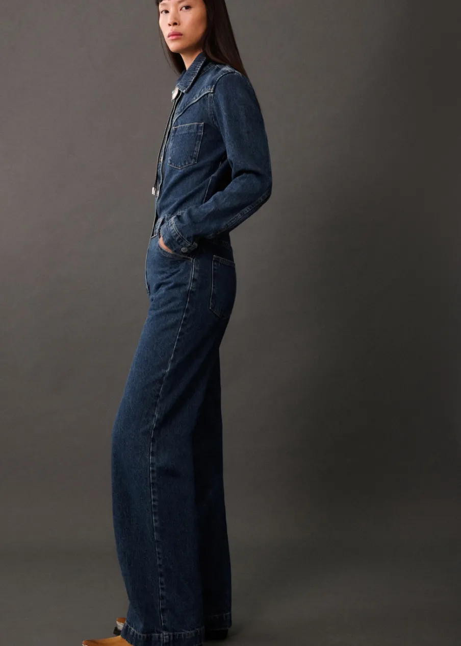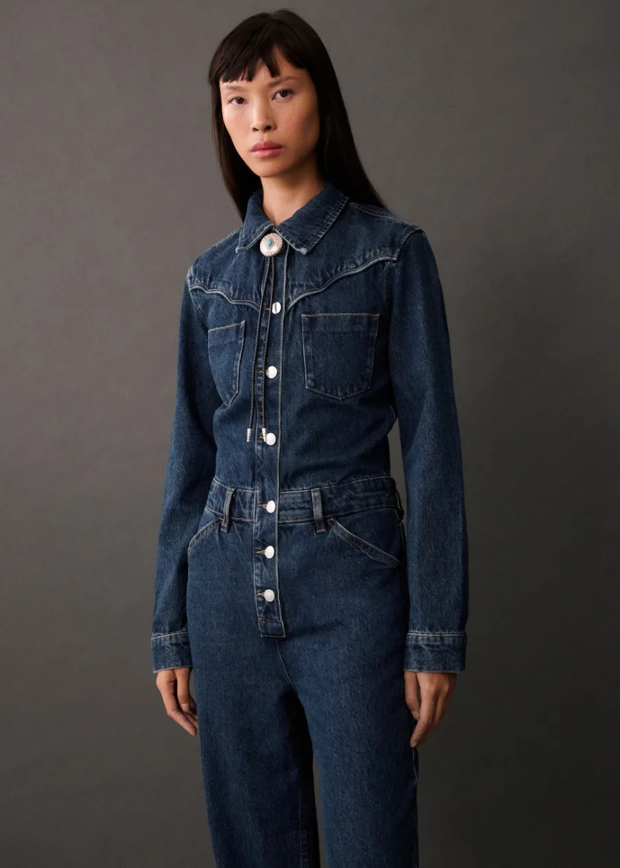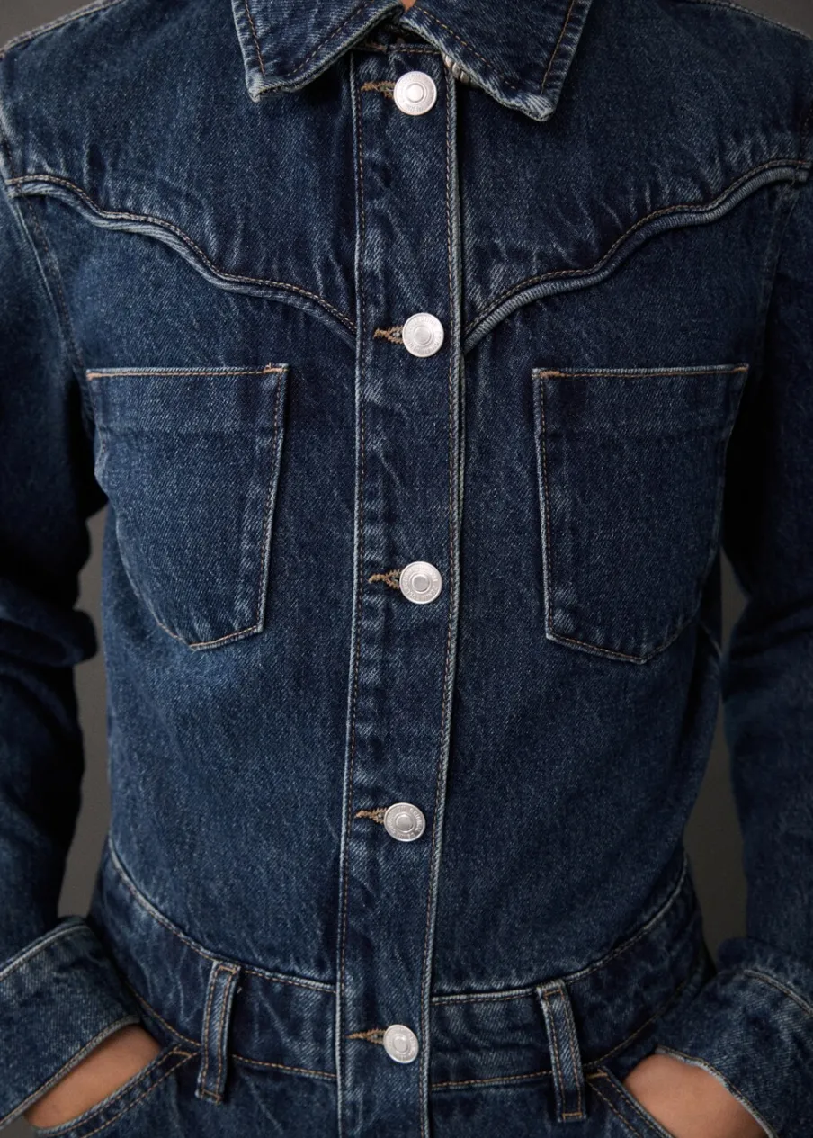 Tkanina bawełniana w dżinsowym stylu. Model długi. Model prosty. Koszulowy kołnierz. Długi rękaw z guzikami na mankietach. Dwie kieszenie naszyte na piersi. Dwie kieszenie boczne. Dwie kieszenie na guzik z tyłu. Szlufki. Zapięcie na guziki z przodu. Modelka ma 177 cm wzrostu i nosi rozmiar S/36.