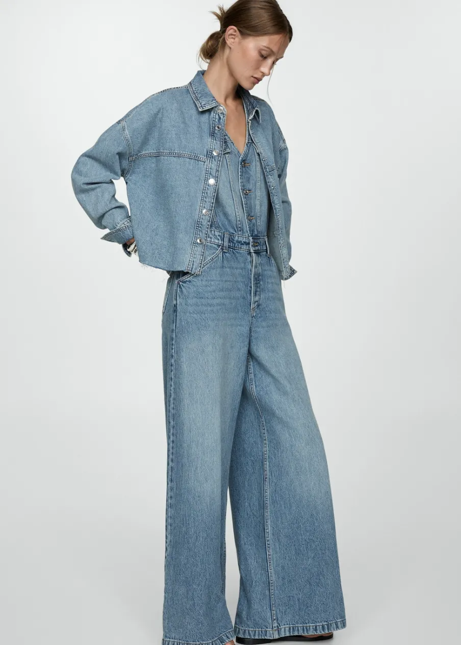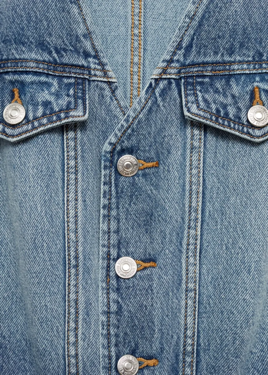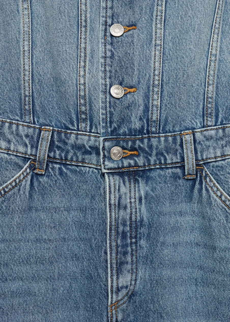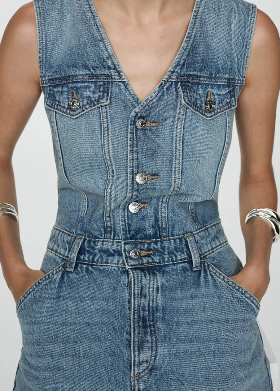 Tkanina bawełniana w dżinsowym stylu. Model długi. Fason wideleg. Dekolt V. Bez rękawów. Dwie kieszenie z patką na piersi. Dwie kieszenie boczne. Szlufki. Zapięcie na guziki z przodu. Model wcięty.