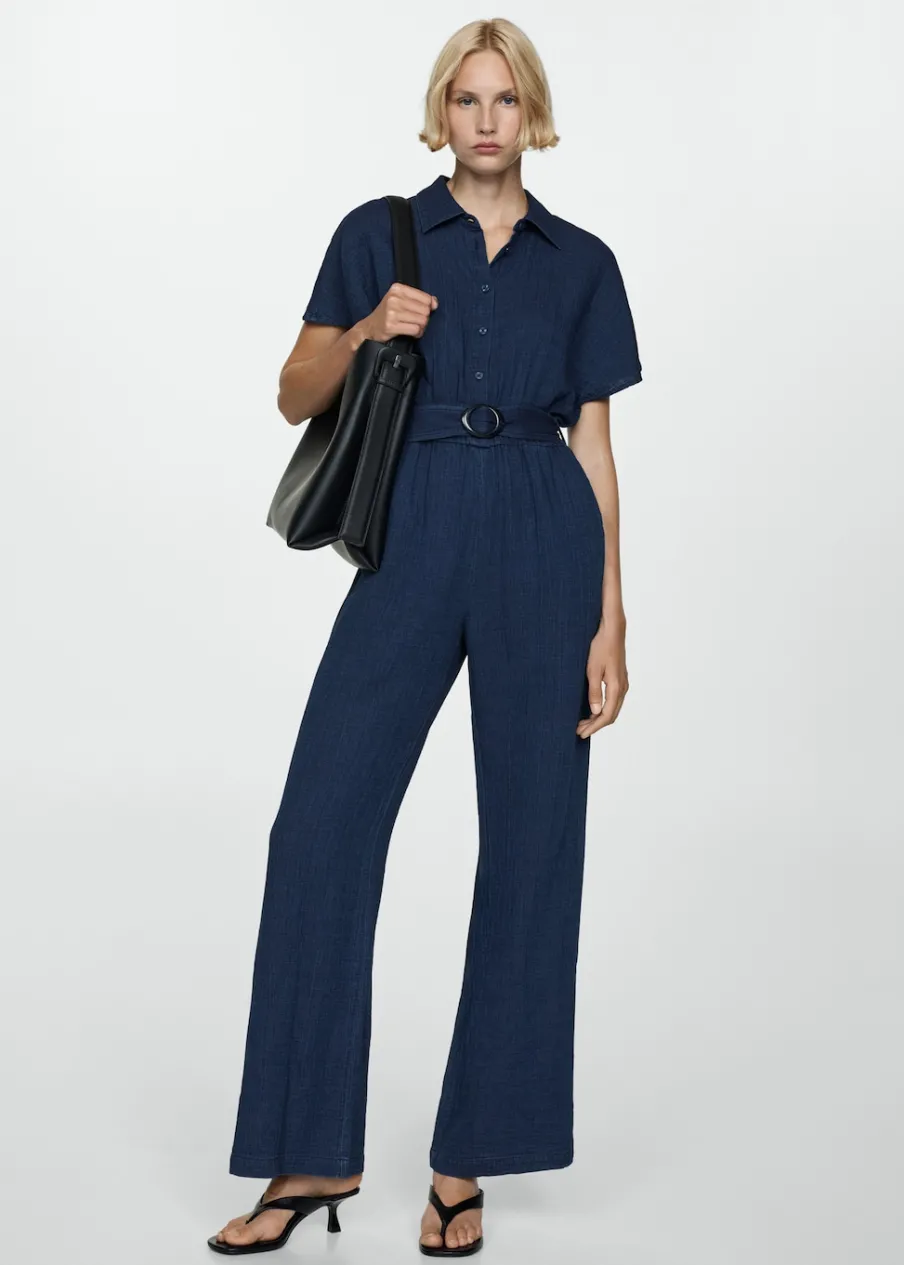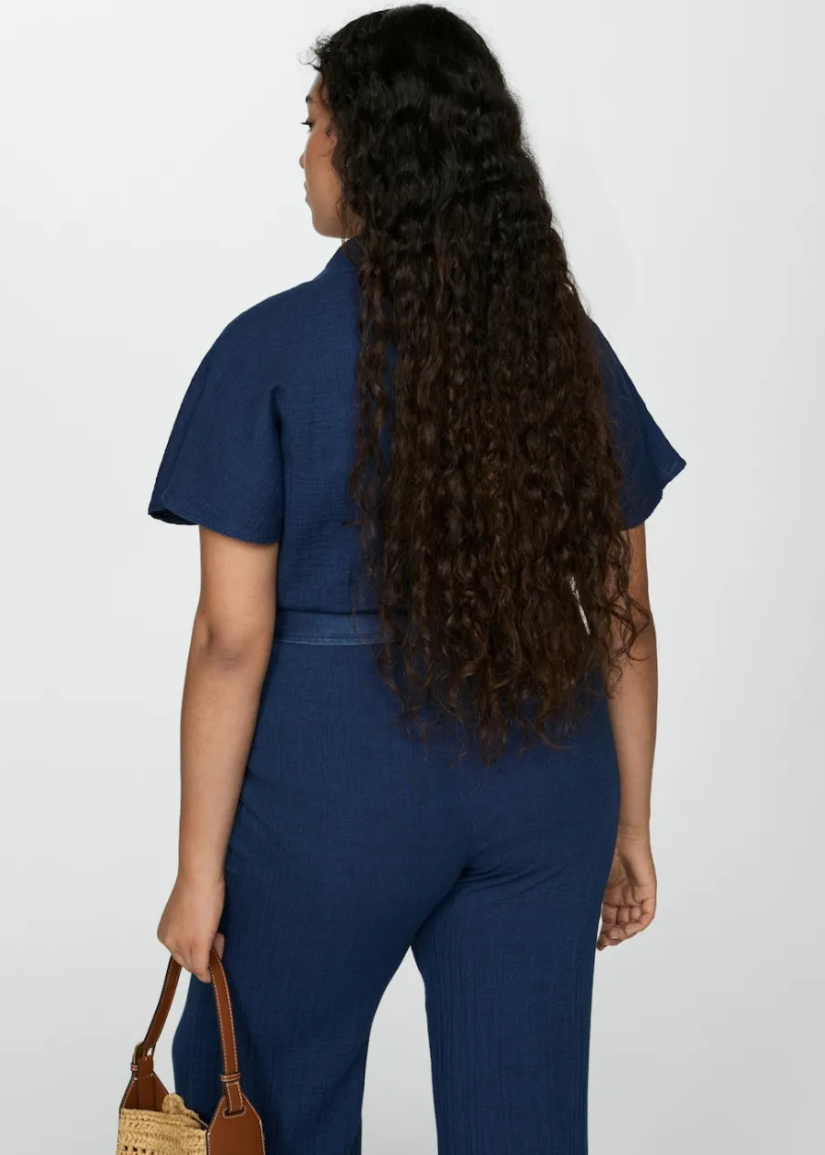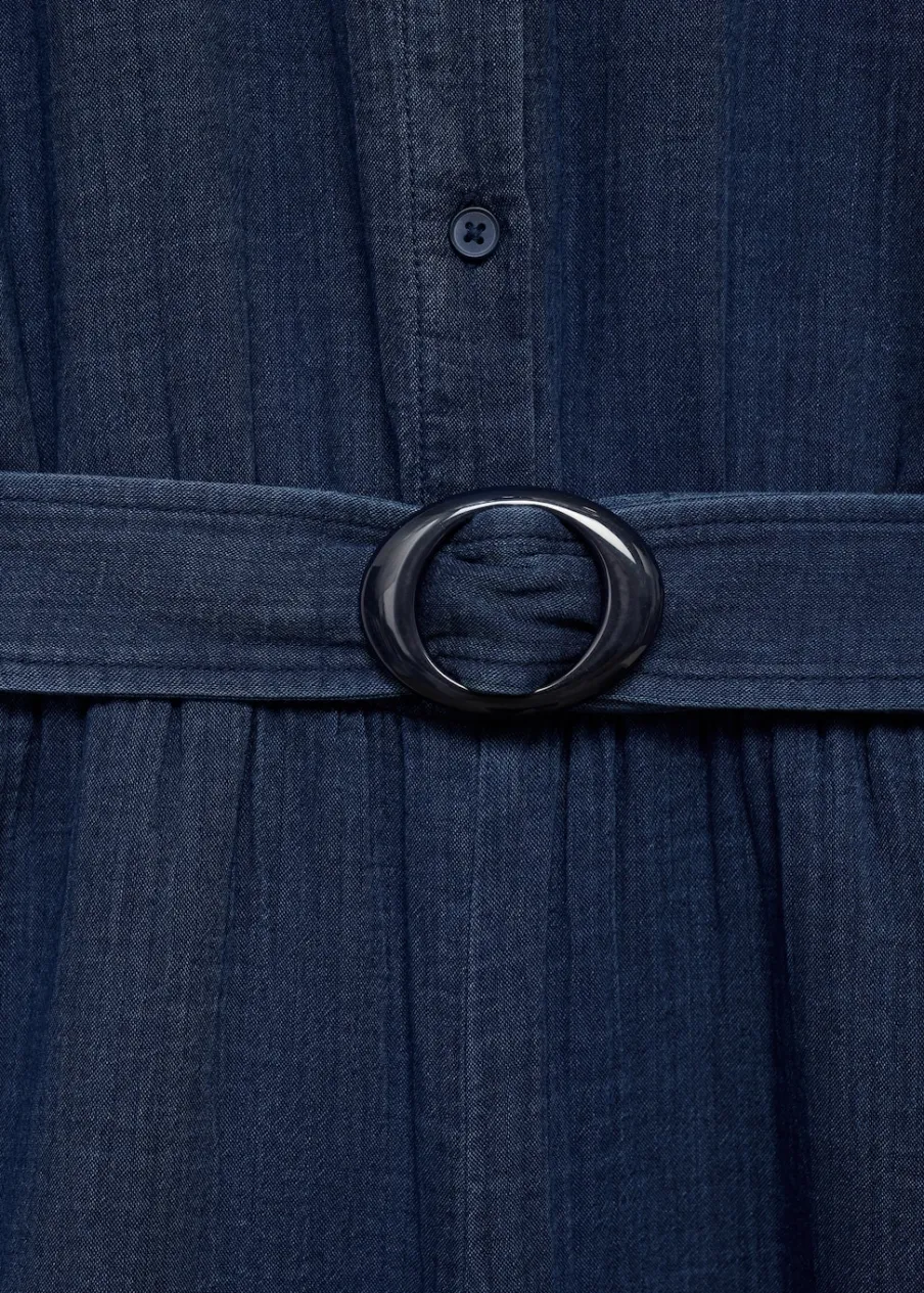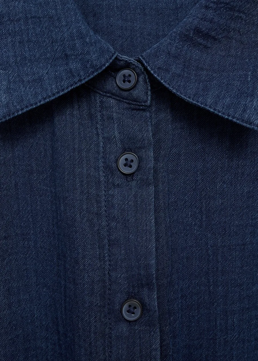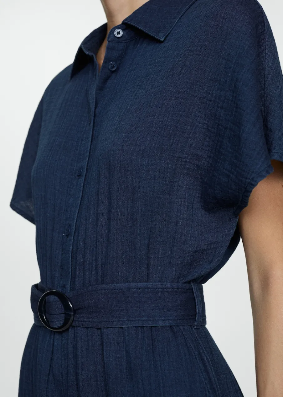 Kreszowana tkanina. Model długi. Model prosty. Koszulowy kołnierz. Krótki rękaw. Dwie kieszenie boczne. Szlufki. Regulowany pasek. Dostępne w Plus Size. Zapięcie na guziki z przodu. Tkanina z 100% bawełny.