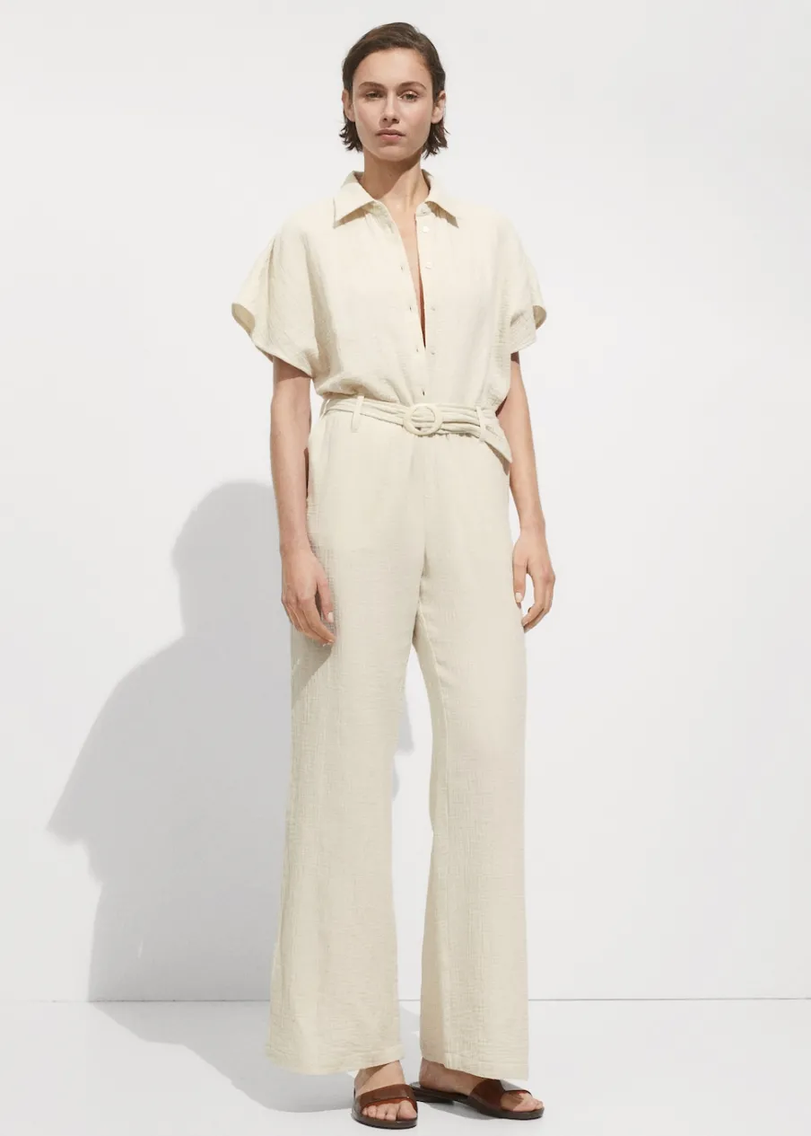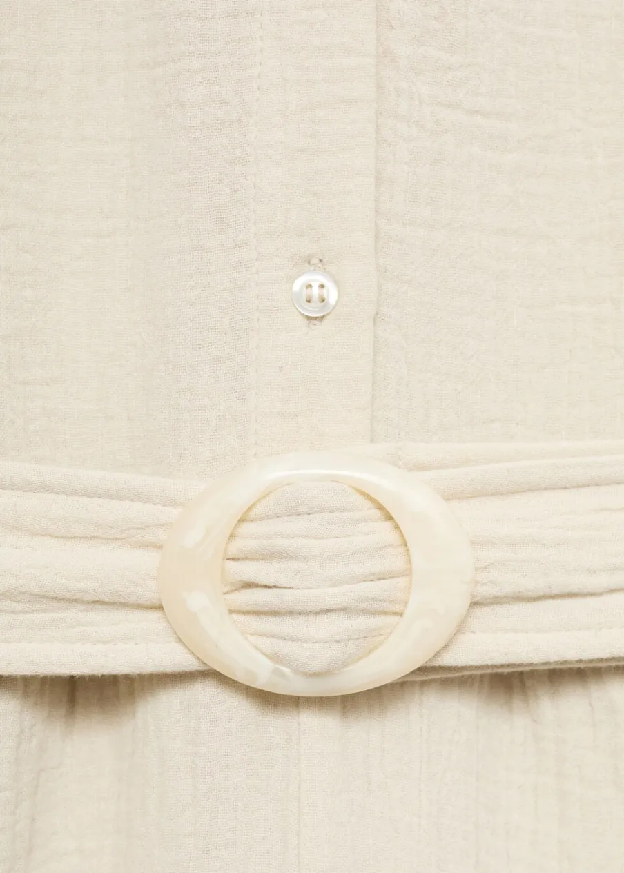 Kreszowana tkanina. Model długi. Model prosty. Koszulowy kołnierz. Krótki rękaw. Dwie kieszenie boczne. Szlufki. Regulowany pasek. Zapięcie na guziki z przodu. Tkanina z 100% bawełny.