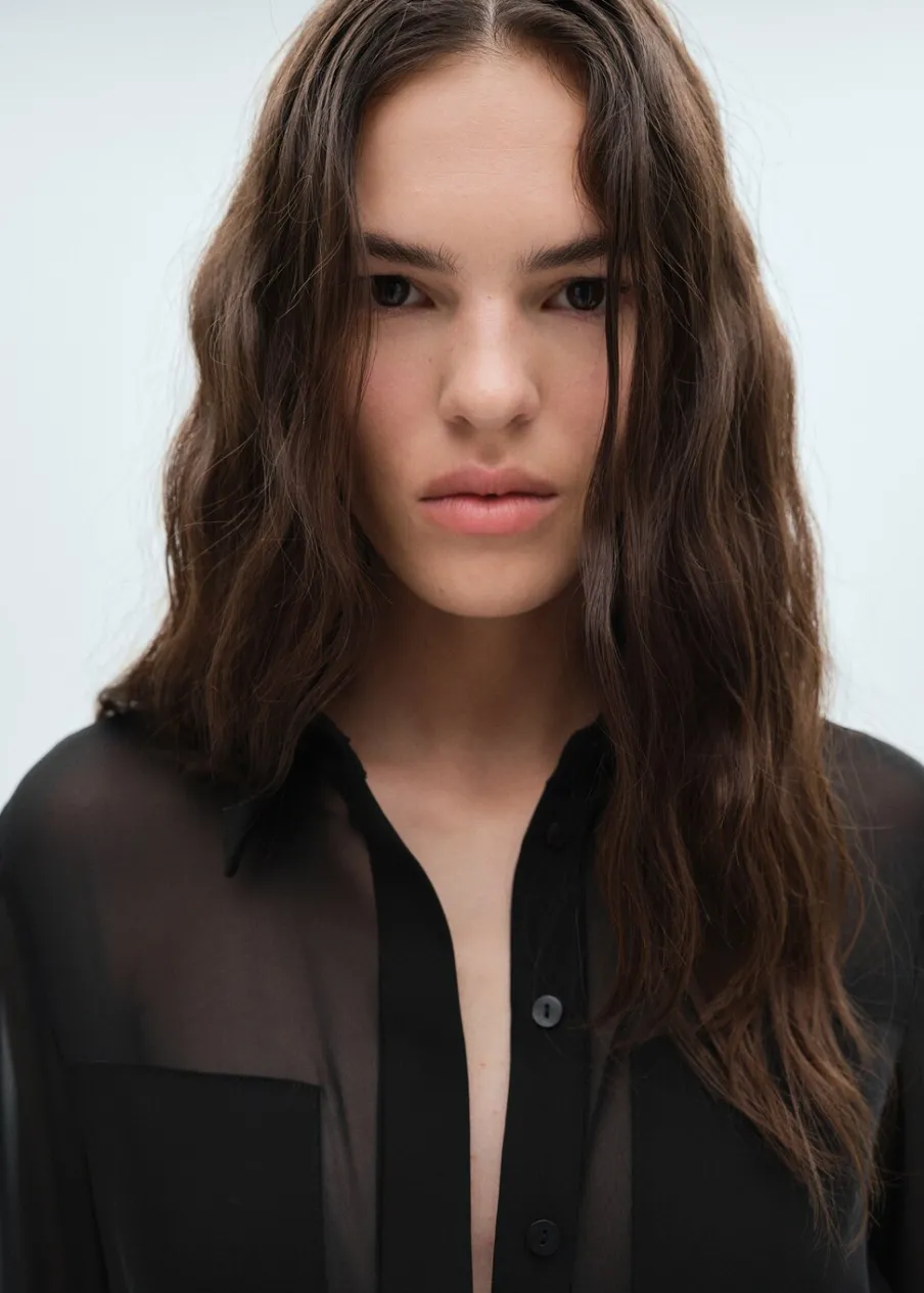 Lejąca tkanina. Półprzezroczysta tkanina. Model prosty. Koszulowy kołnierz. Długi rękaw z guzikami na mankietach. Model długi. Kolekcja wizytowa. Modelka ma 178 cm wzrostu i nosi rozmiar S/36. Kryte zapięcie na guziki z przodu.