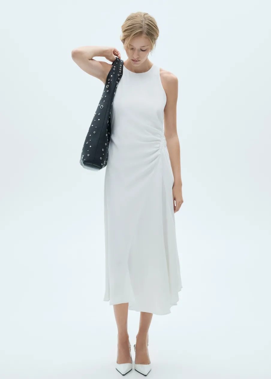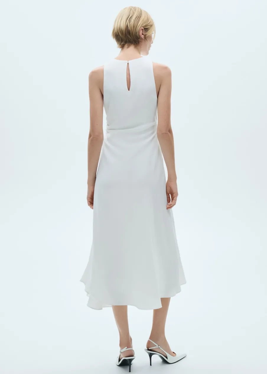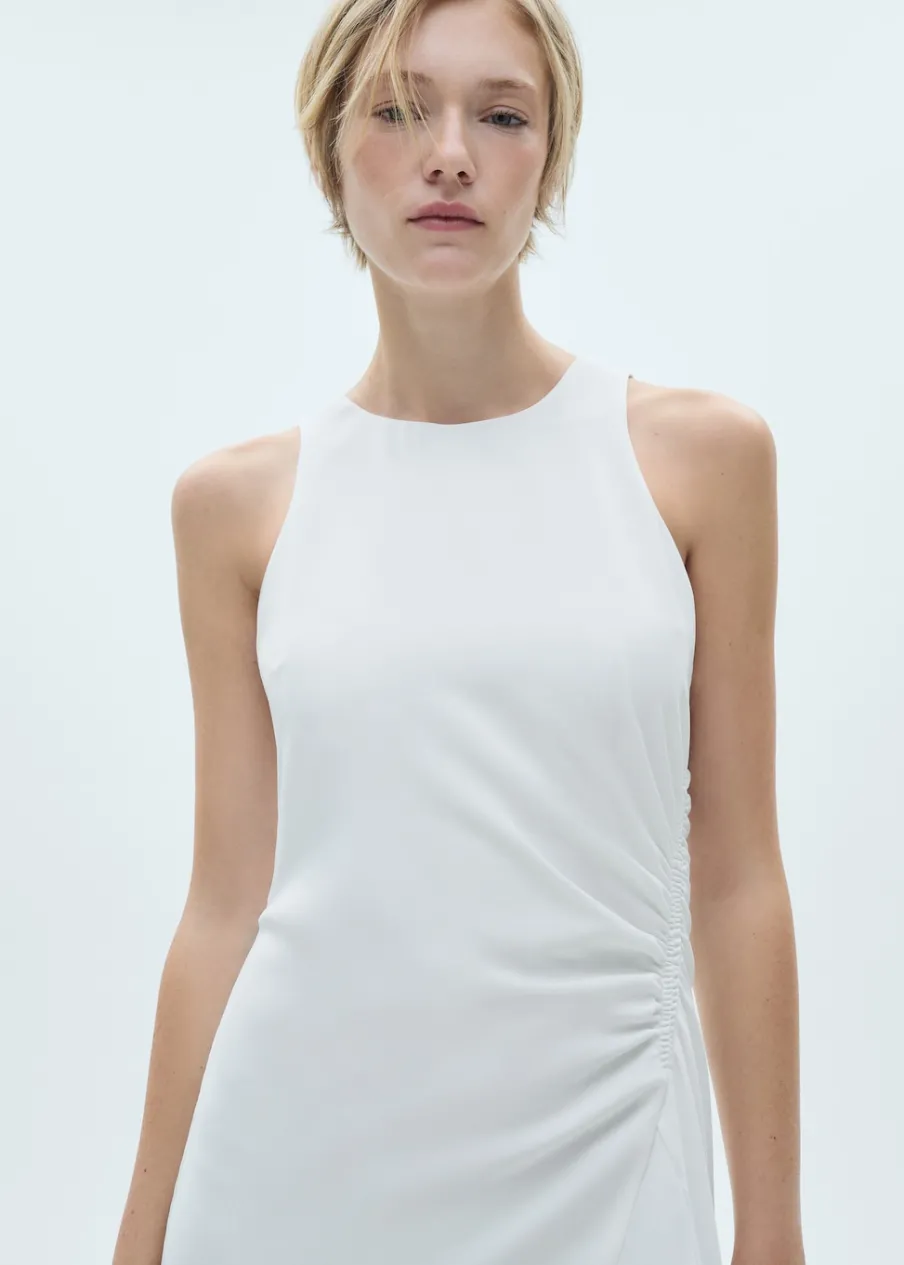 Lejąca tkanina. Krój do kolan. Model evasé. Okrągły dekolt. Bez rękawów. Zapięcie na guzik z tyłu. Marszczony detal. Wewnętrzna podszewka.