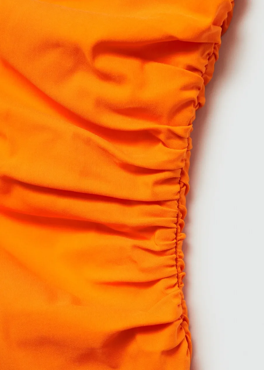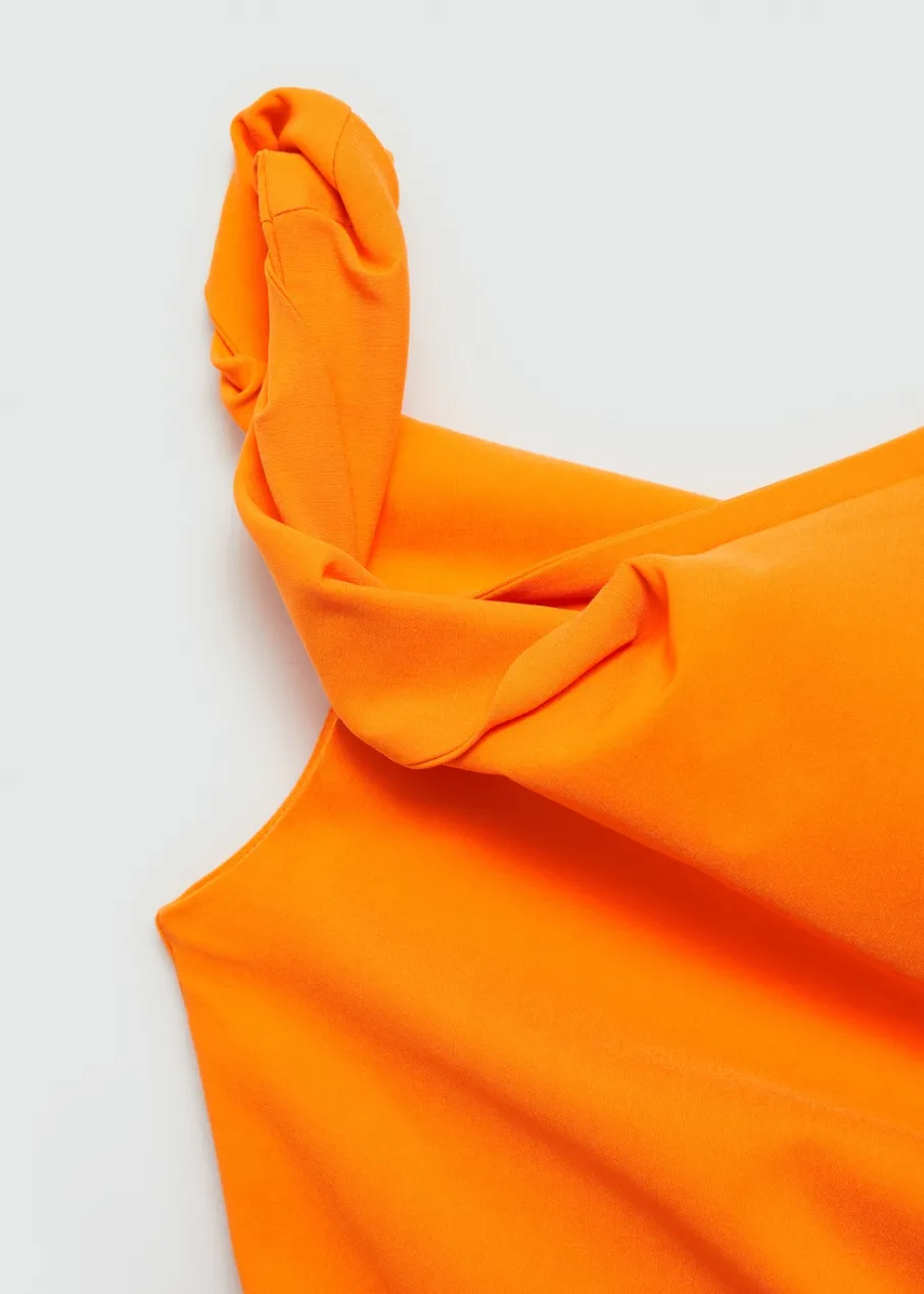 Krótki krój. Model prosty. Asymetryczny dekolt. Bez rękawów. Szerokie ramiączko. Kryte zapięcie na zamek z boku. Marszczona tekstura. Wewnętrzna podszewka.