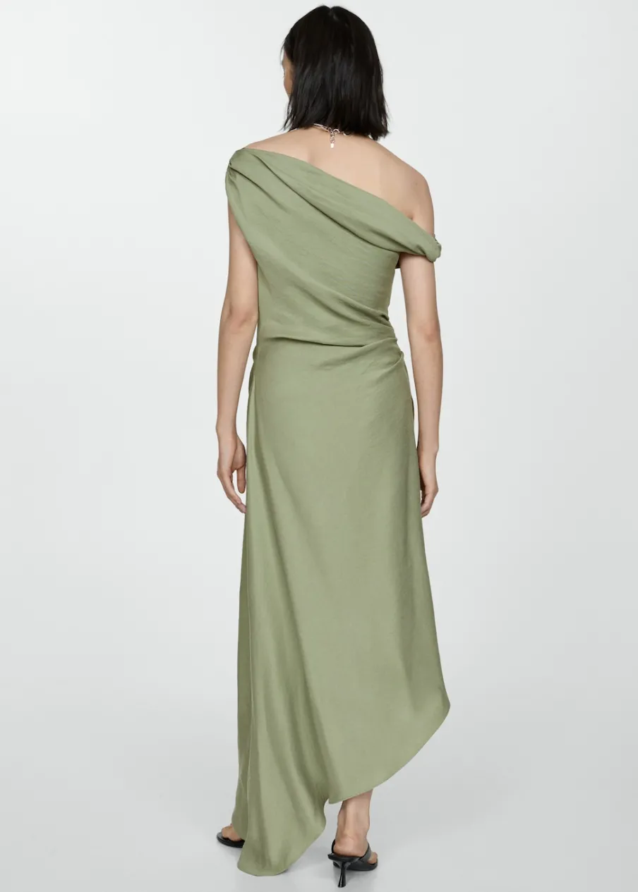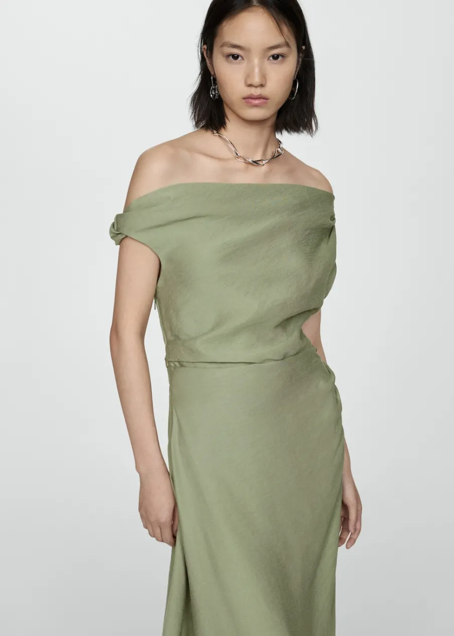 Tkanina z mieszanki modalu. Lejąca tkanina. Krój do kolan. Model prosty. Marszczenie na dekolcie. Bez rękawów. Szerokie ramiączka. Kryte zapięcie na zamek z boku. Asymetryczny dół. Kolekcja wizytowa.