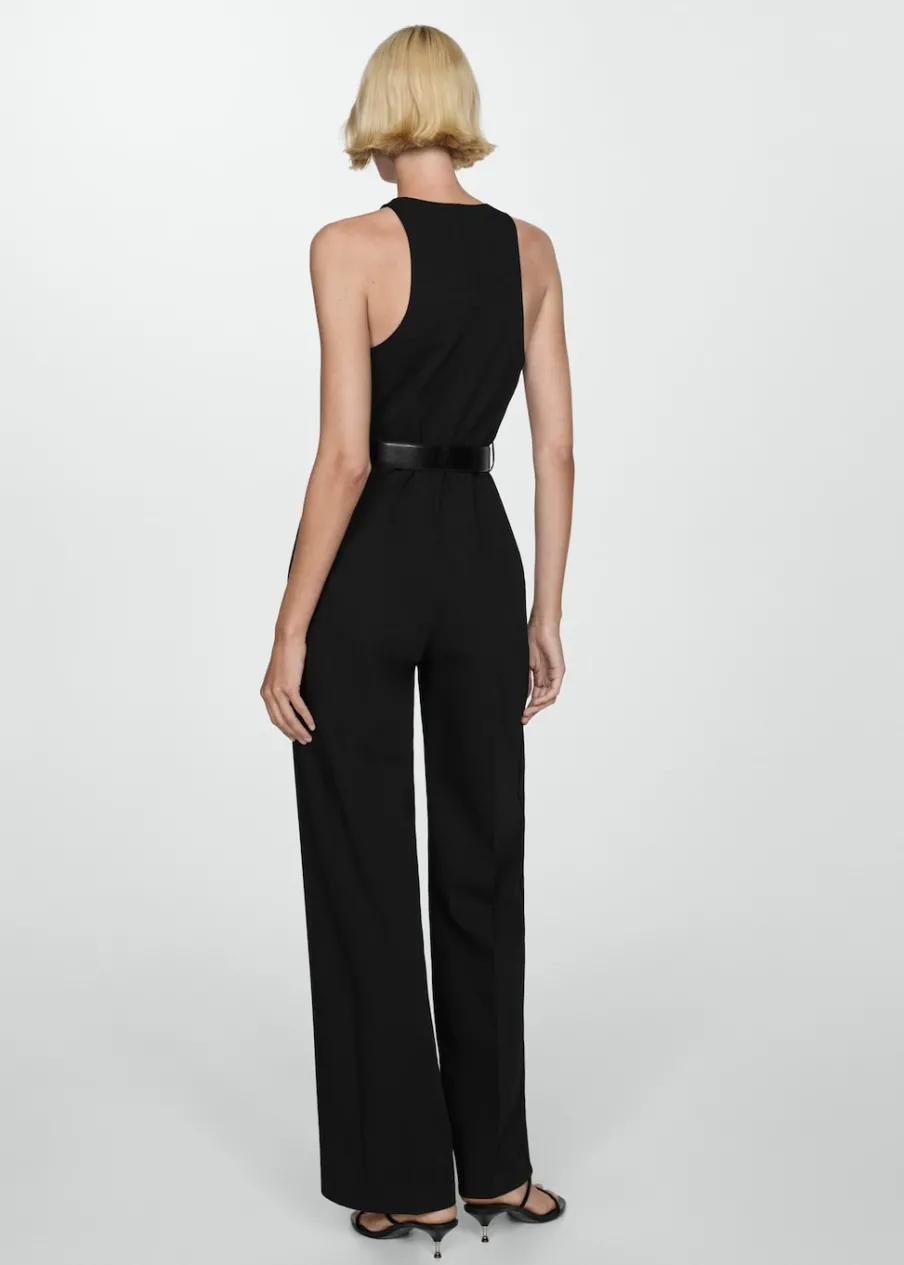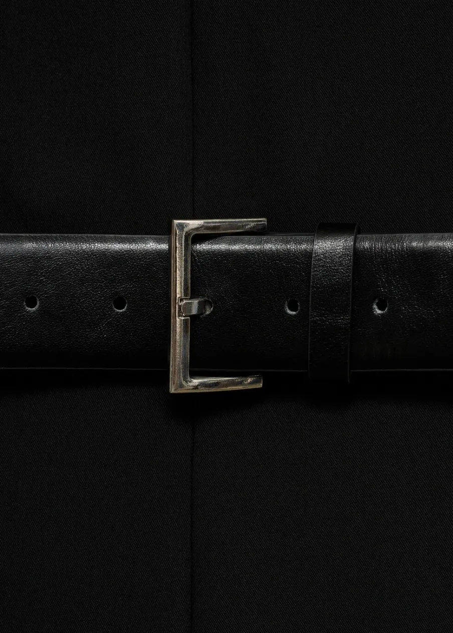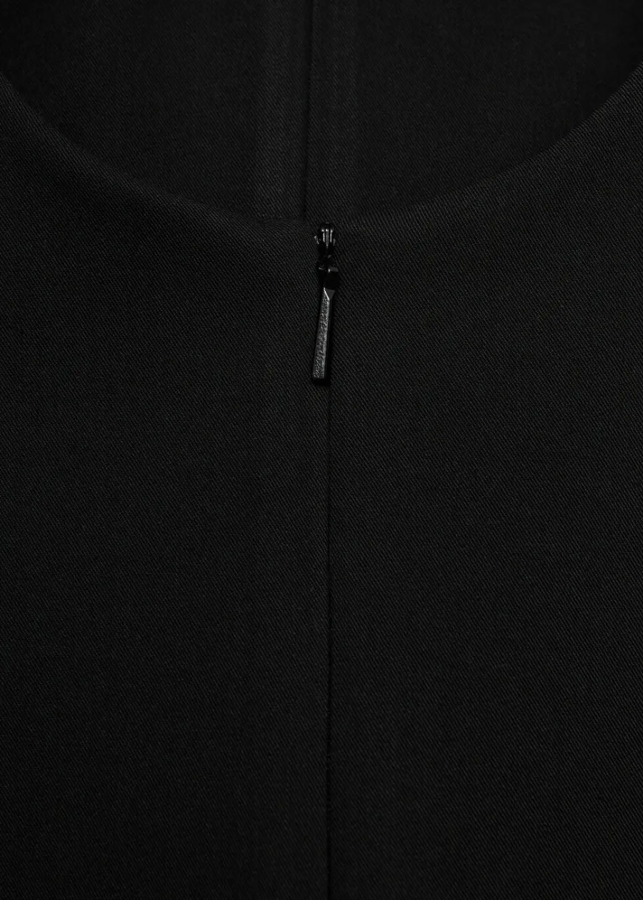 Lejąca tkanina. Model długi. Model prosty. Okrągły dekolt. Bez rękawów. Szlufki. Odpinany pasek. Kryte zapięcie na zamek z przodu.