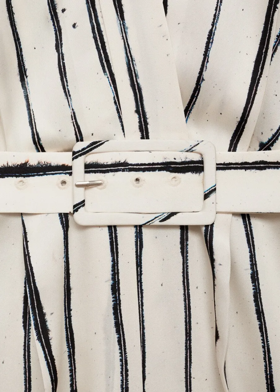 Satynowa tkanina. Lejąca tkanina. Model długi. Model prosty. Struktura w pasy. Zakładany dekolt V. Bez rękawów. Odpinany pasek. Szlufki. Zapięcie z tyłu na kryty suwak.