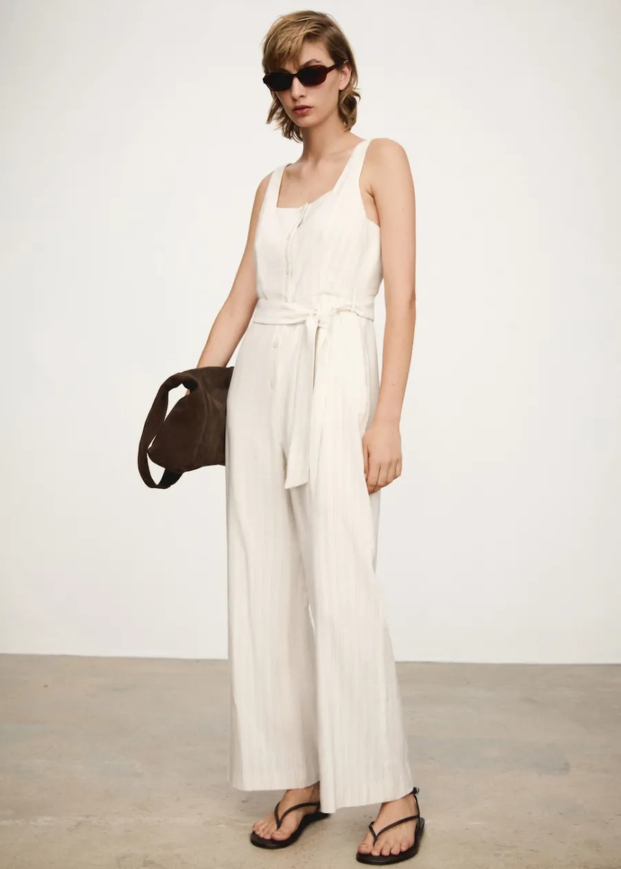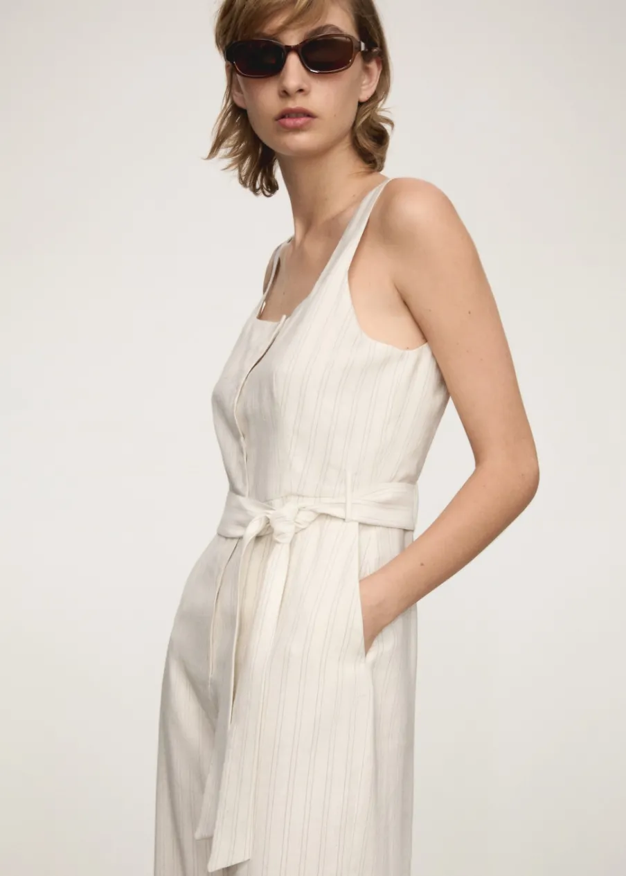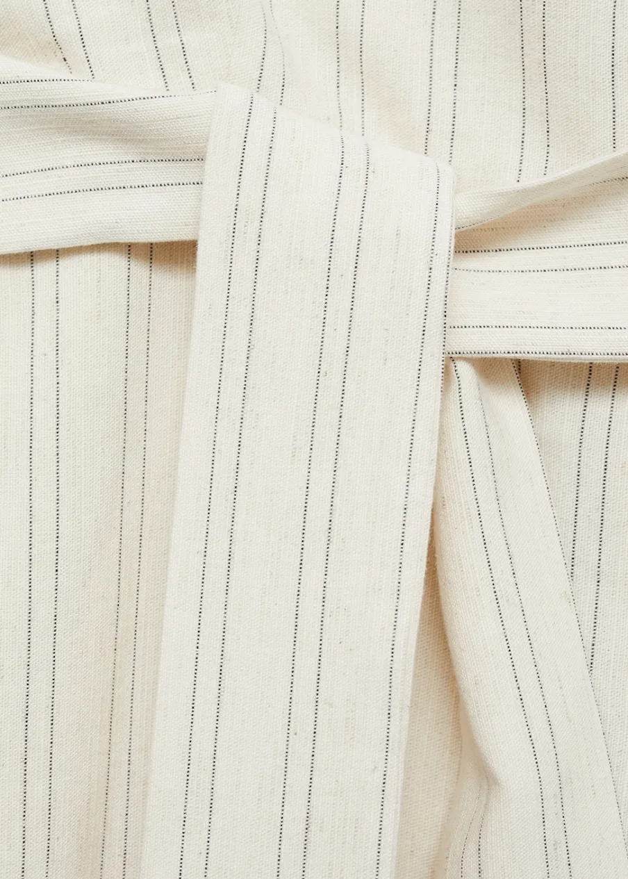 Tkanina mieszanka bawełny i lnu. Model długi. Model prosty. Okrągły dekolt. Szerokie ramiączka. Szlufki. Regulowane wiązanie w talii. Wzór w paski. Zapięcie na guziki z przodu.