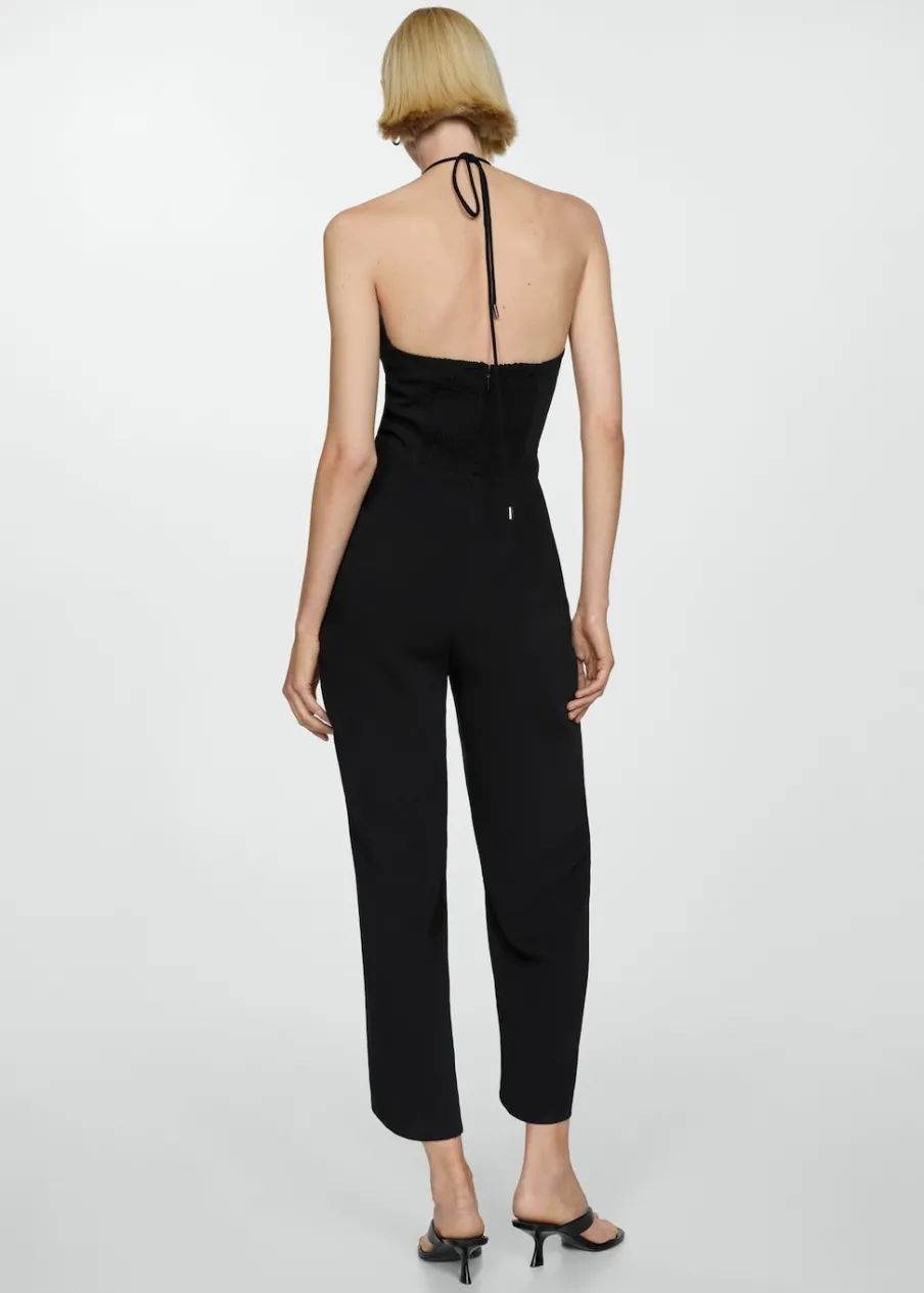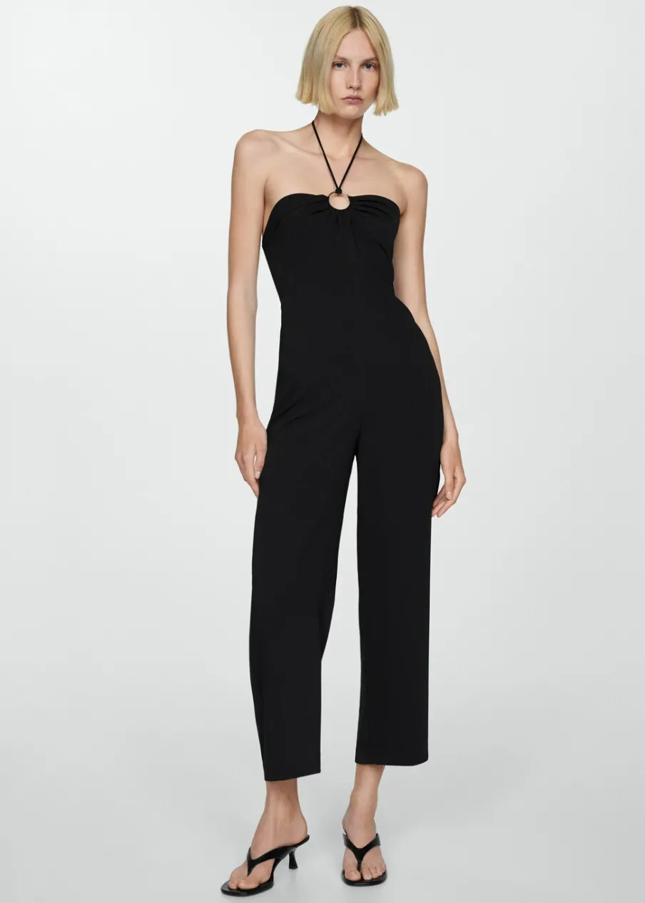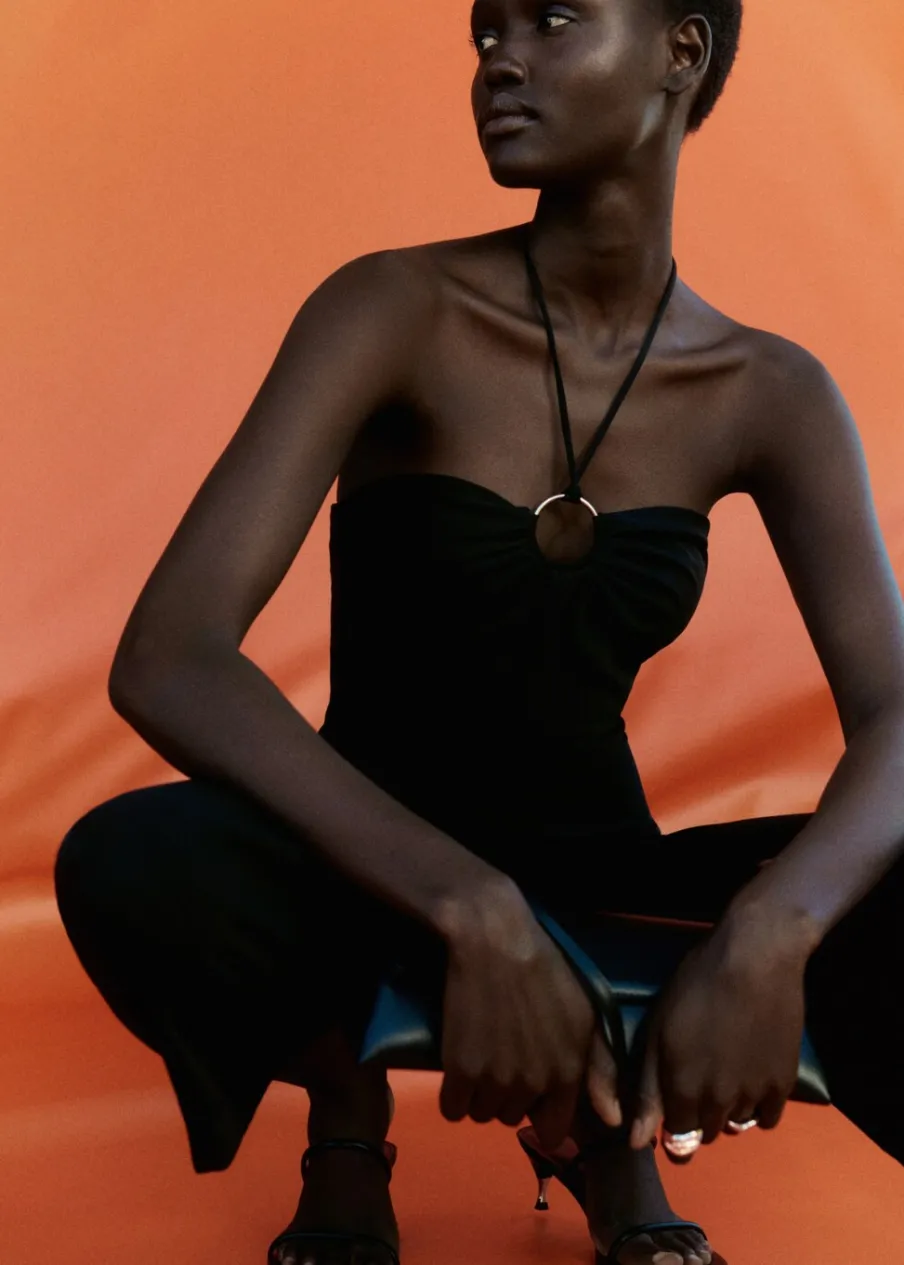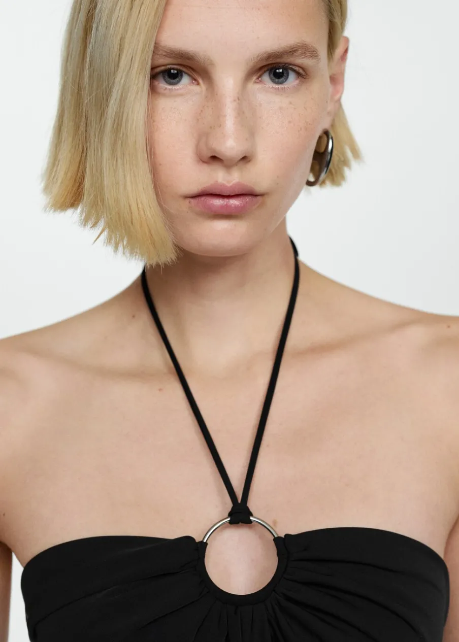 Lejąca tkanina. Model długi. Model prosty. Dekolt w stylu halter. Bez rękawów. Cienkie ramiączka. Zapięcie z tyłu na suwak. Wiązanie na szyi. Metalowe kółko.