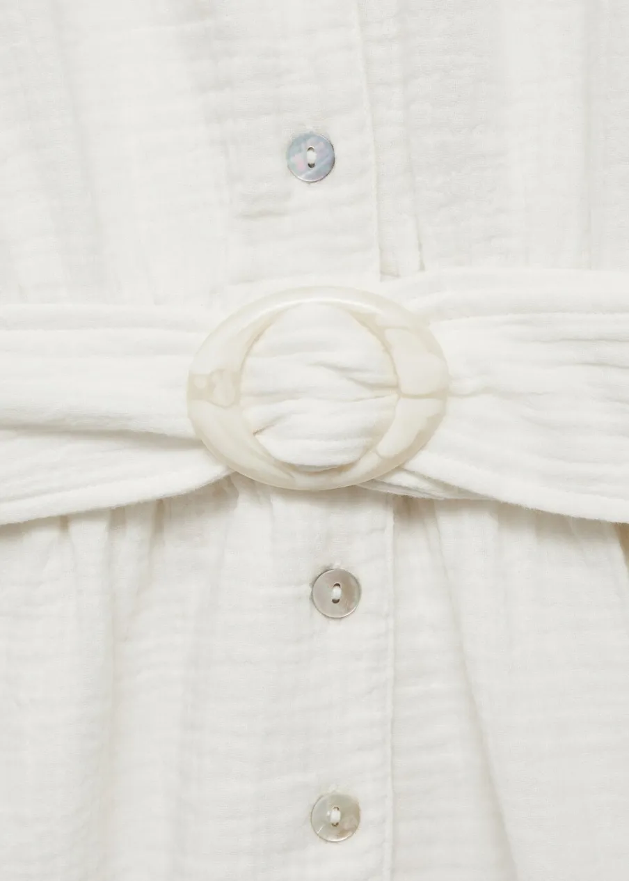 Kreszowana tkanina. Krótki krój. Model prosty. Dekolt V. Krótki rękaw. Dekoracyjny pasek. Postrzępione nogawki. Tkanina z 100% bawełny. Zapięcie na guziki z przodu.