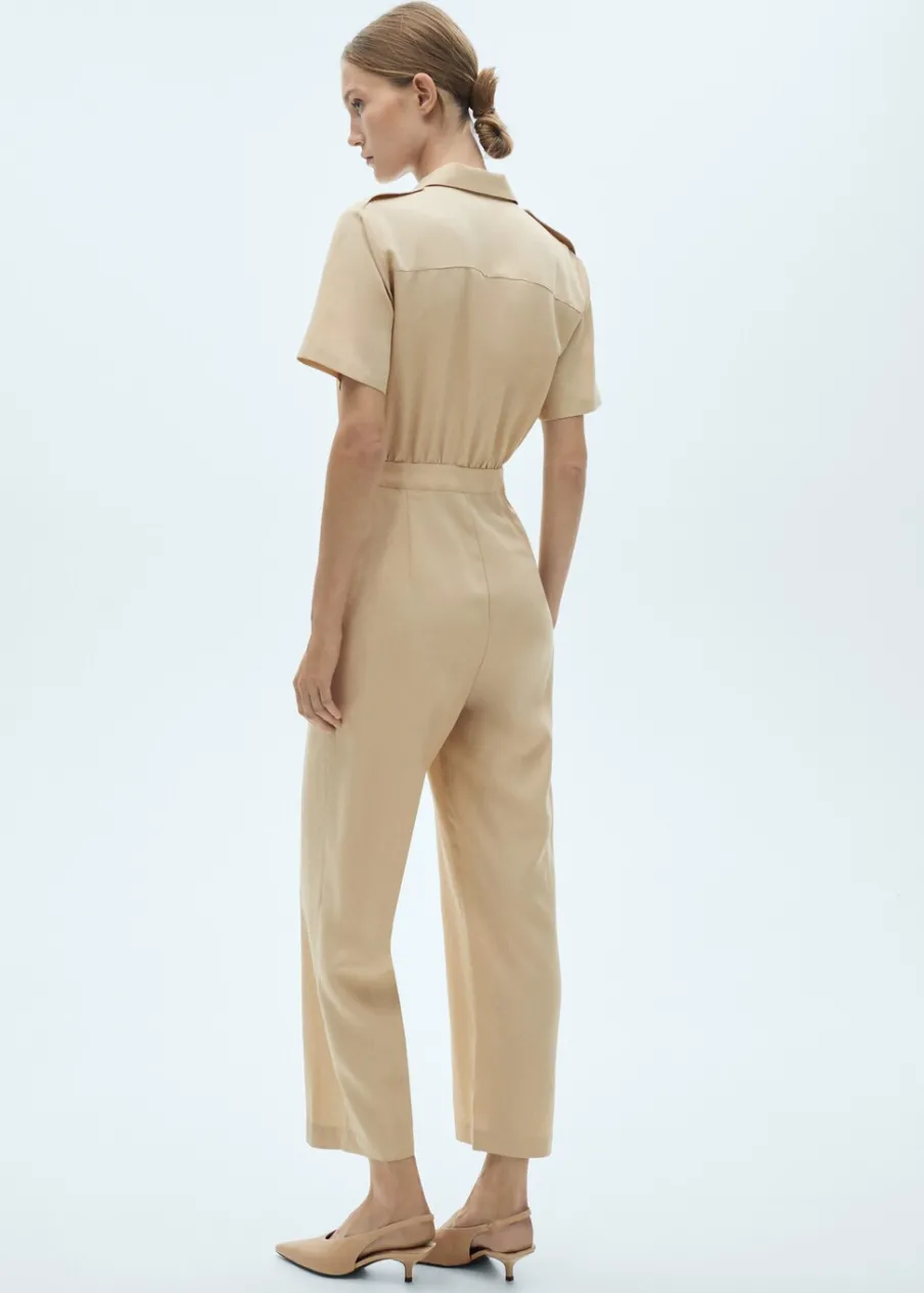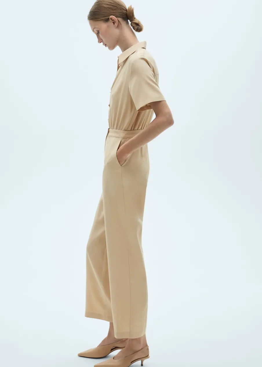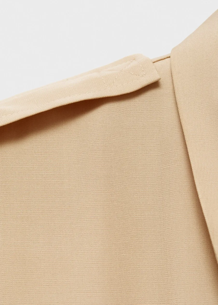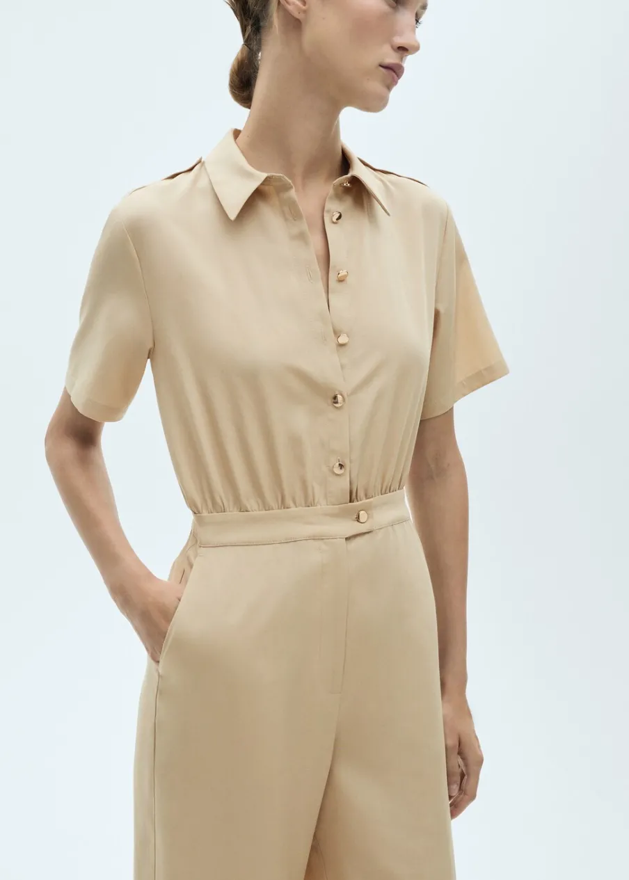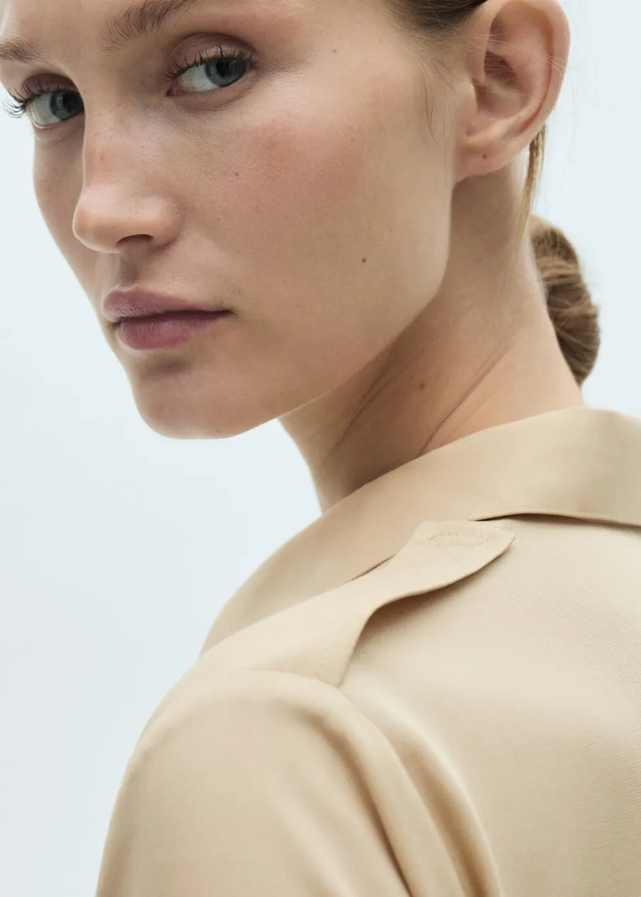Tkanina mieszana z lyocellem. Lejąca tkanina. Model długi. Zapięcie z przodu na guziki. Metalowe guziki. Zapięcie na suwak i guzik. Model prosty. Modelka ma 177 cm wzrostu i nosi rozmiar S/36. Koszulowy kołnierz. Krótki rękaw.