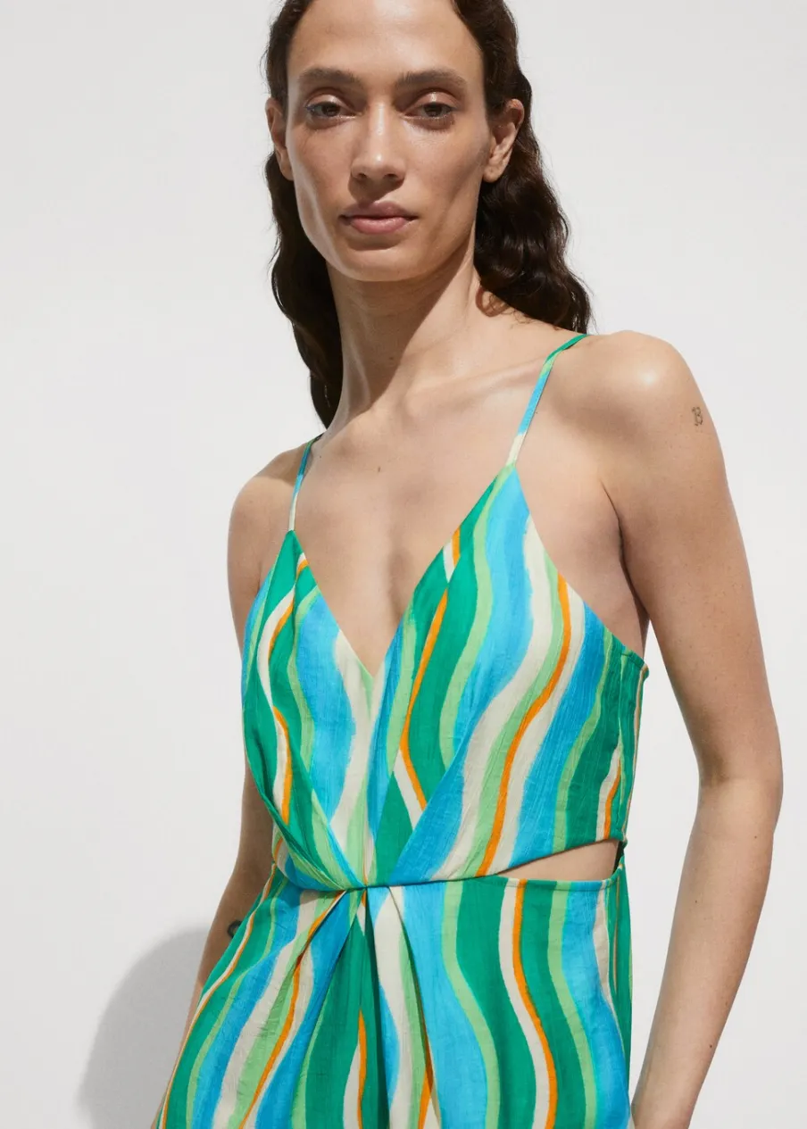 Lejąca tkanina. Model długi. Model prosty. Wycięcie. Cienkie ramiączka. Dekolt V. Bez rękawów. Zapięcie z tyłu na kryty suwak. Drapowane detale. Rozcięcia po bokach. Sezon festiwalowy. Nadruk.