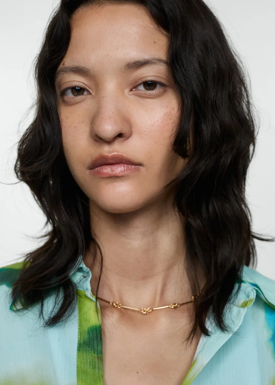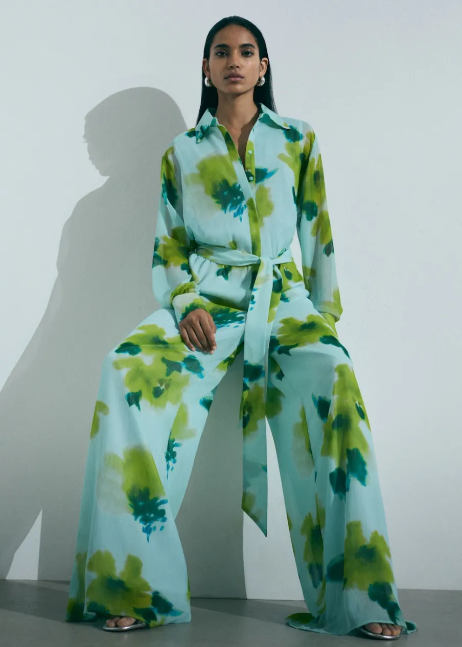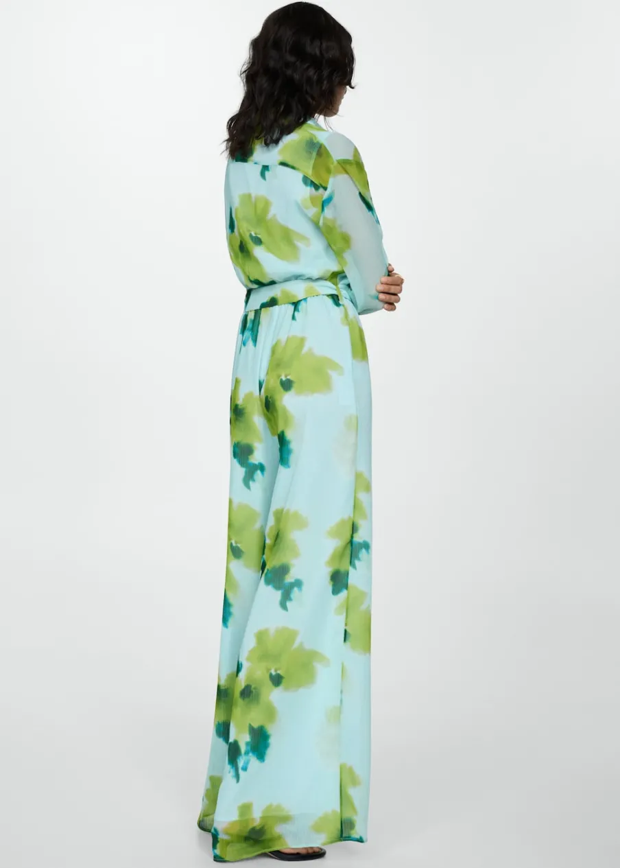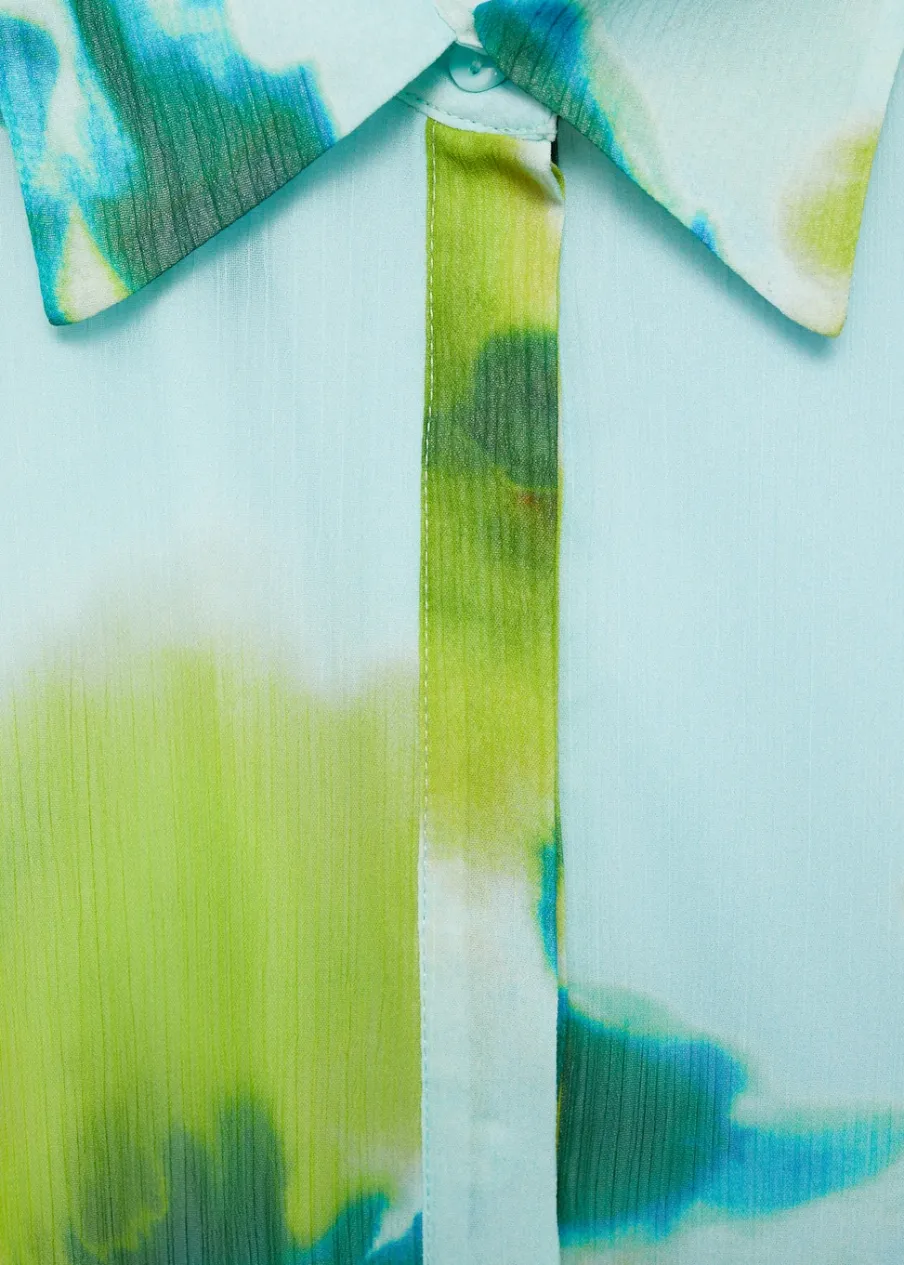 Lejąca tkanina. Model długi. Model prosty. Koszulowy kołnierz. Długi rękaw. Wiązanie z przodu. Wewnętrzna podszewka. Nadruk. Zapięcie na guziki z przodu.