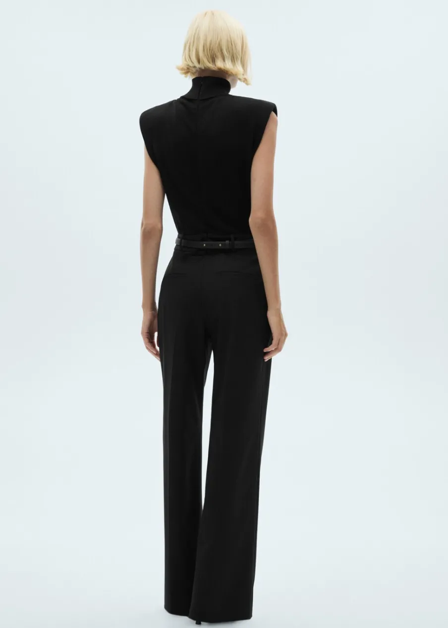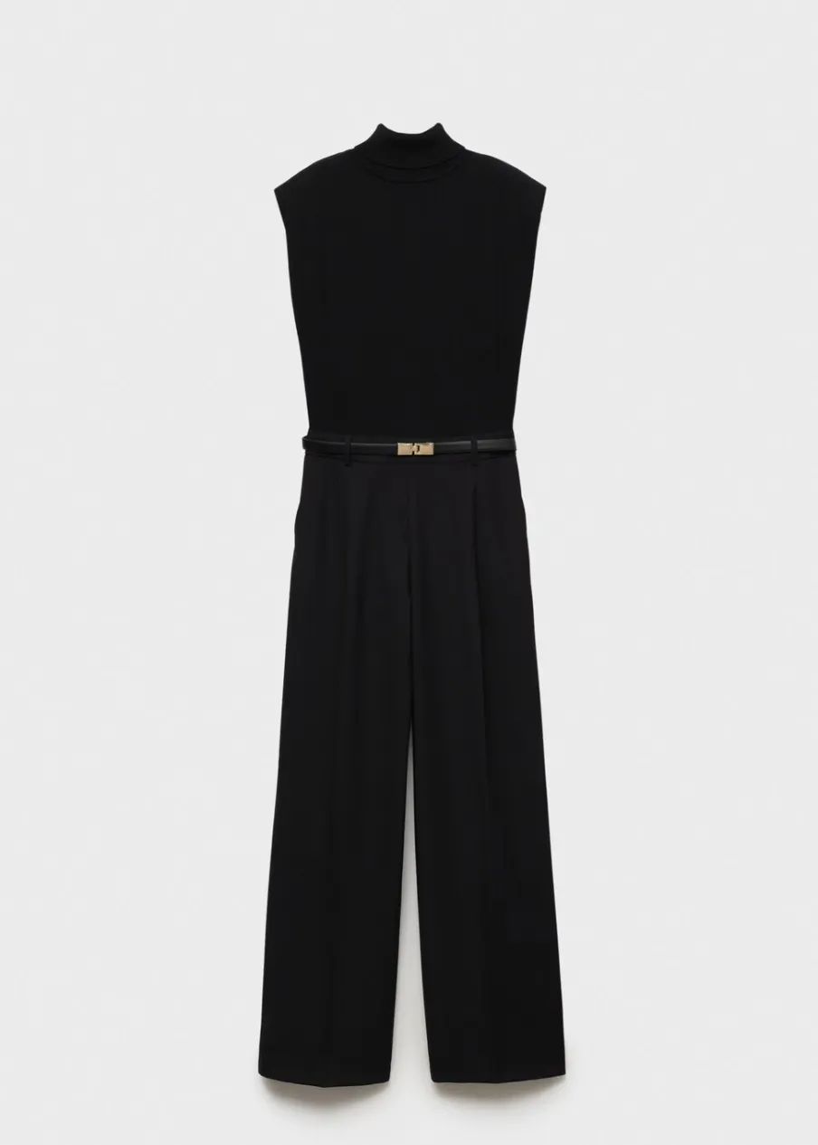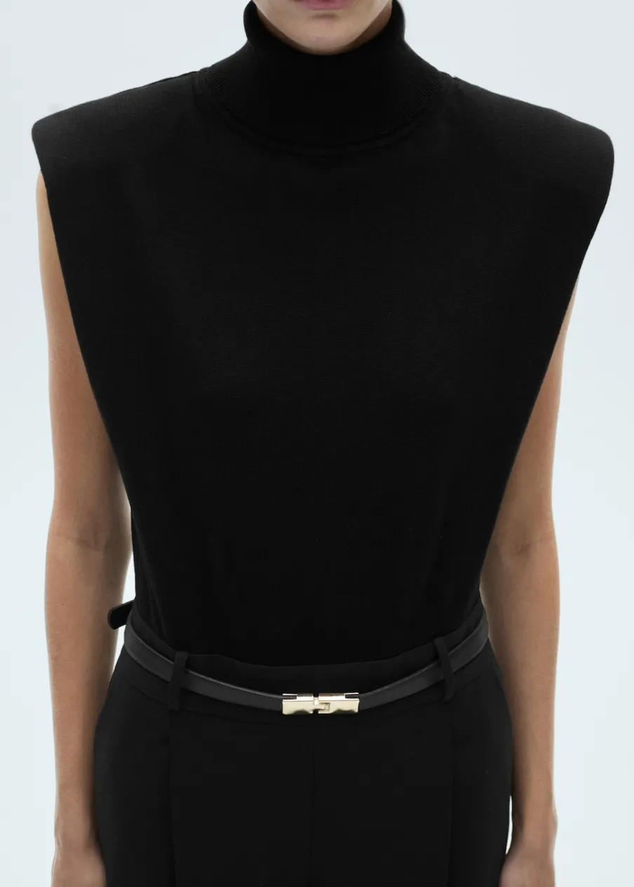 Tkanina z 100% bawełny. Model prosty. Model długi. Model łączony. Golf. Poduszki na ramionach. Bez rękawów. Kieszenie boczne. Dekoracyjny pasek. Modelka ma 178 cm wzrostu i nosi rozmiar S/36.