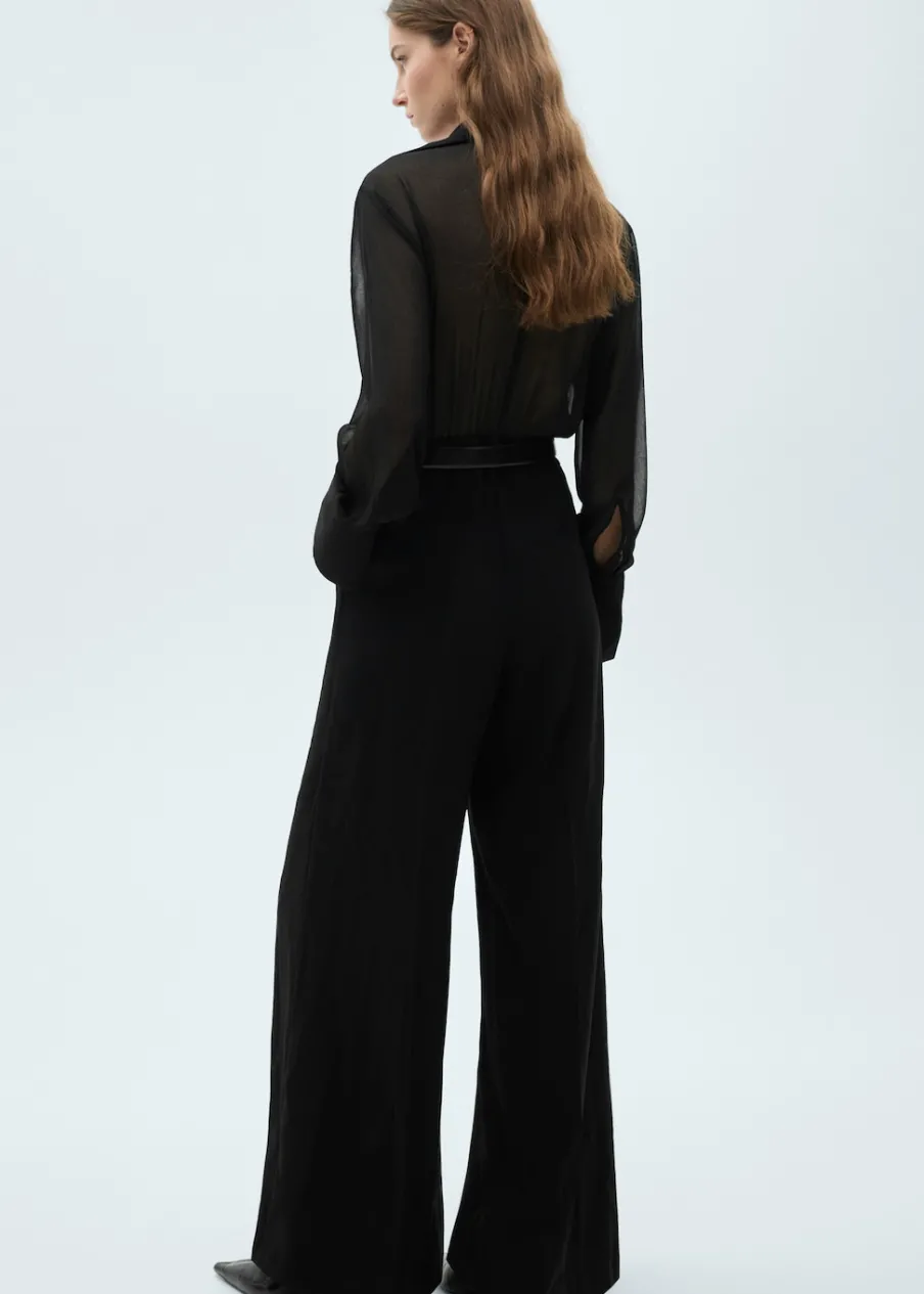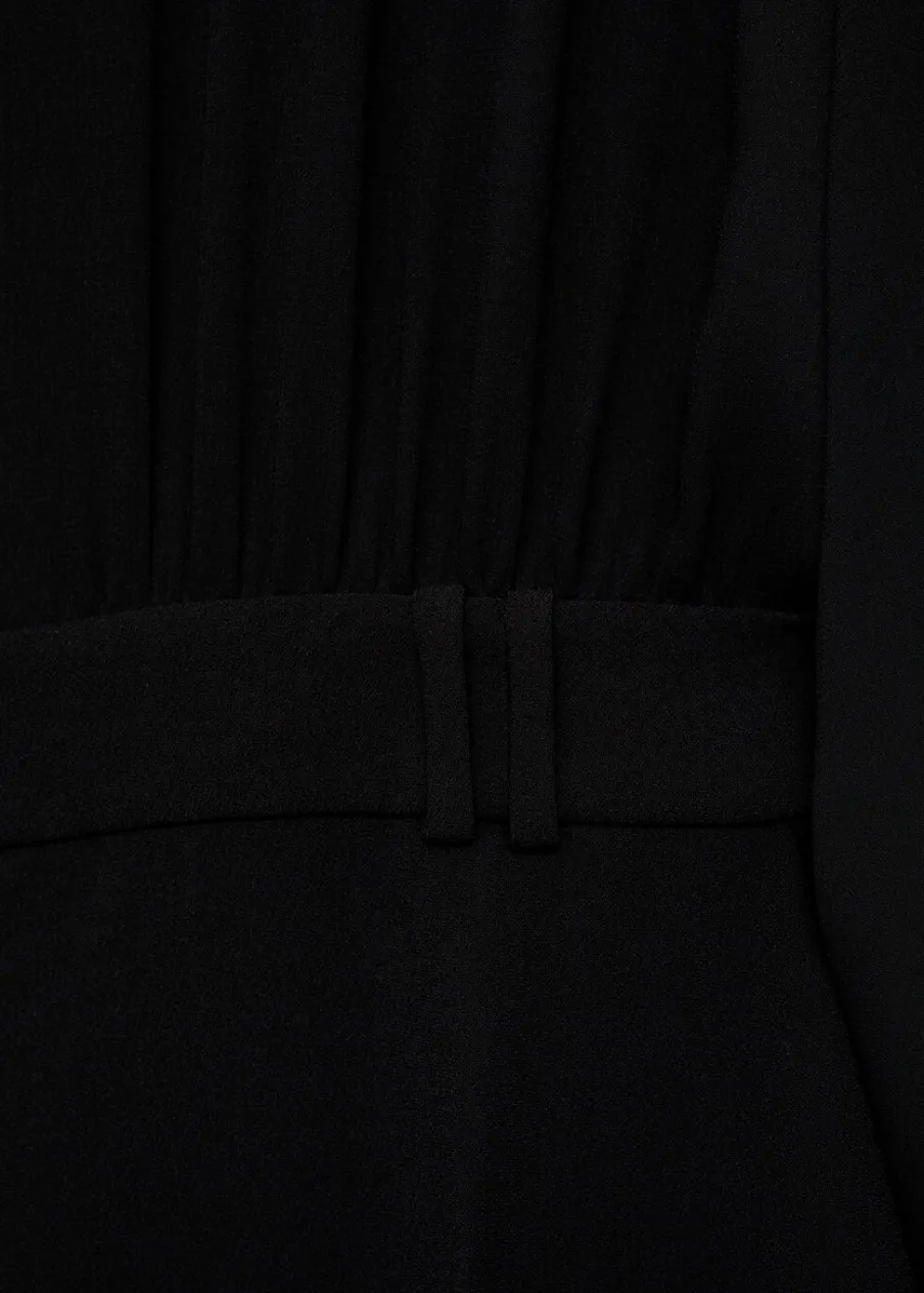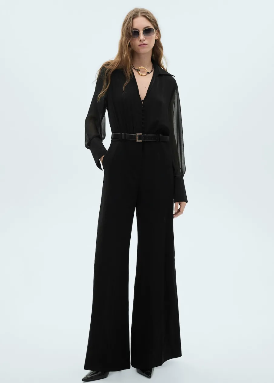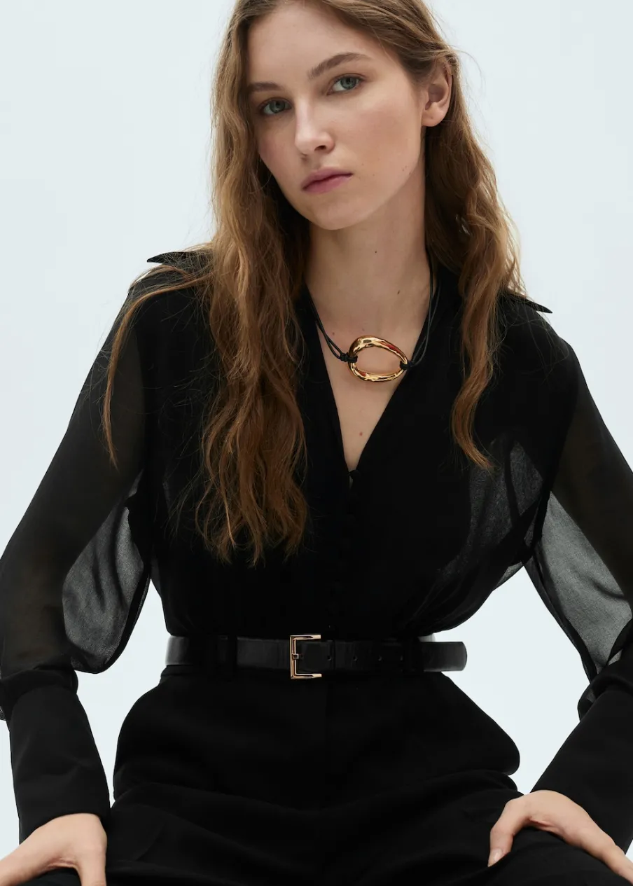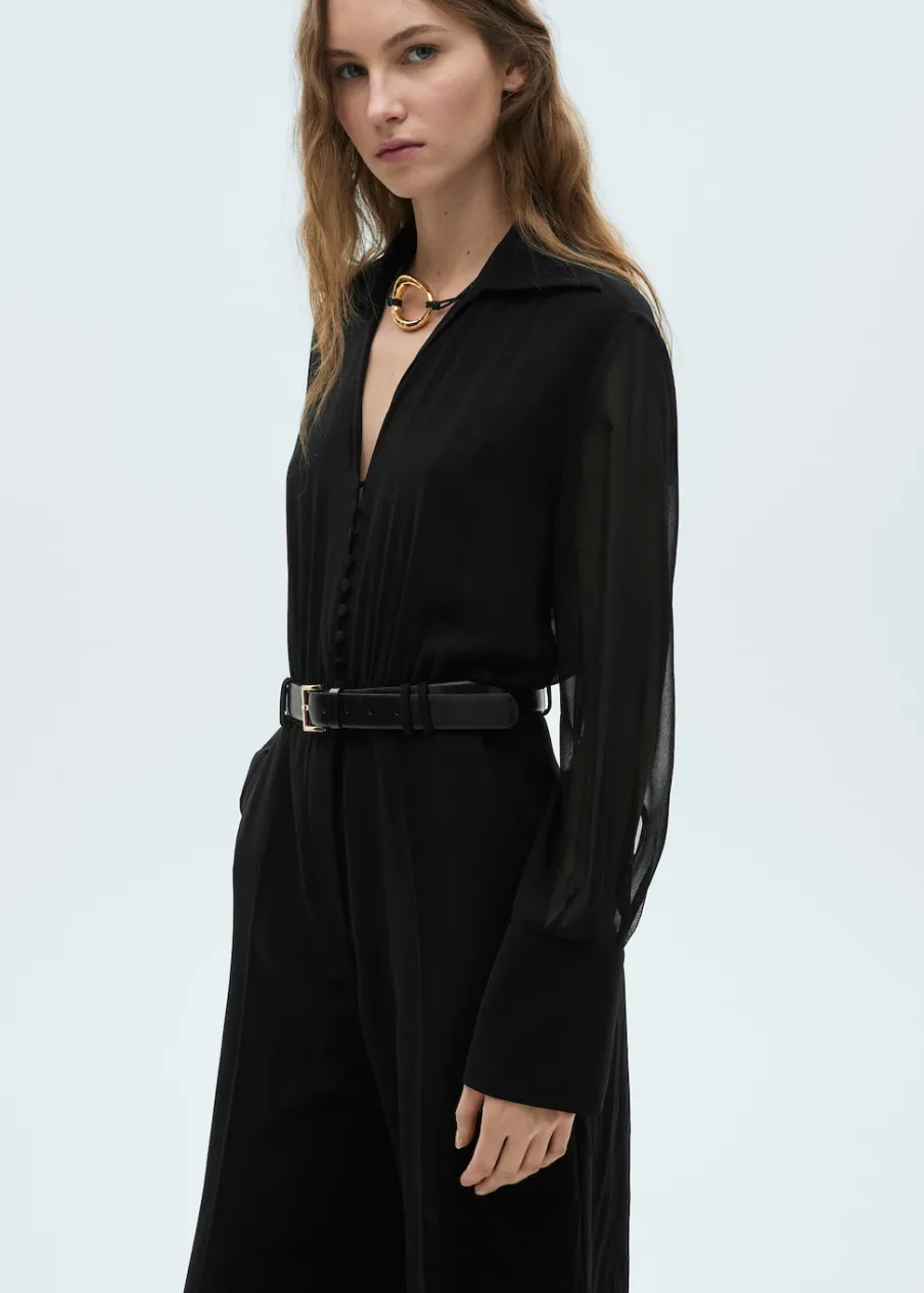 Cienka tkanina. Model długi. Dekolt V. Koszulowy kołnierz. Długi rękaw. Półprzezroczyste rękawy. Zapinane mankiety. Zapięcie z przodu. Szlufki. Regulowany pasek. Wewnętrzna podszewka.