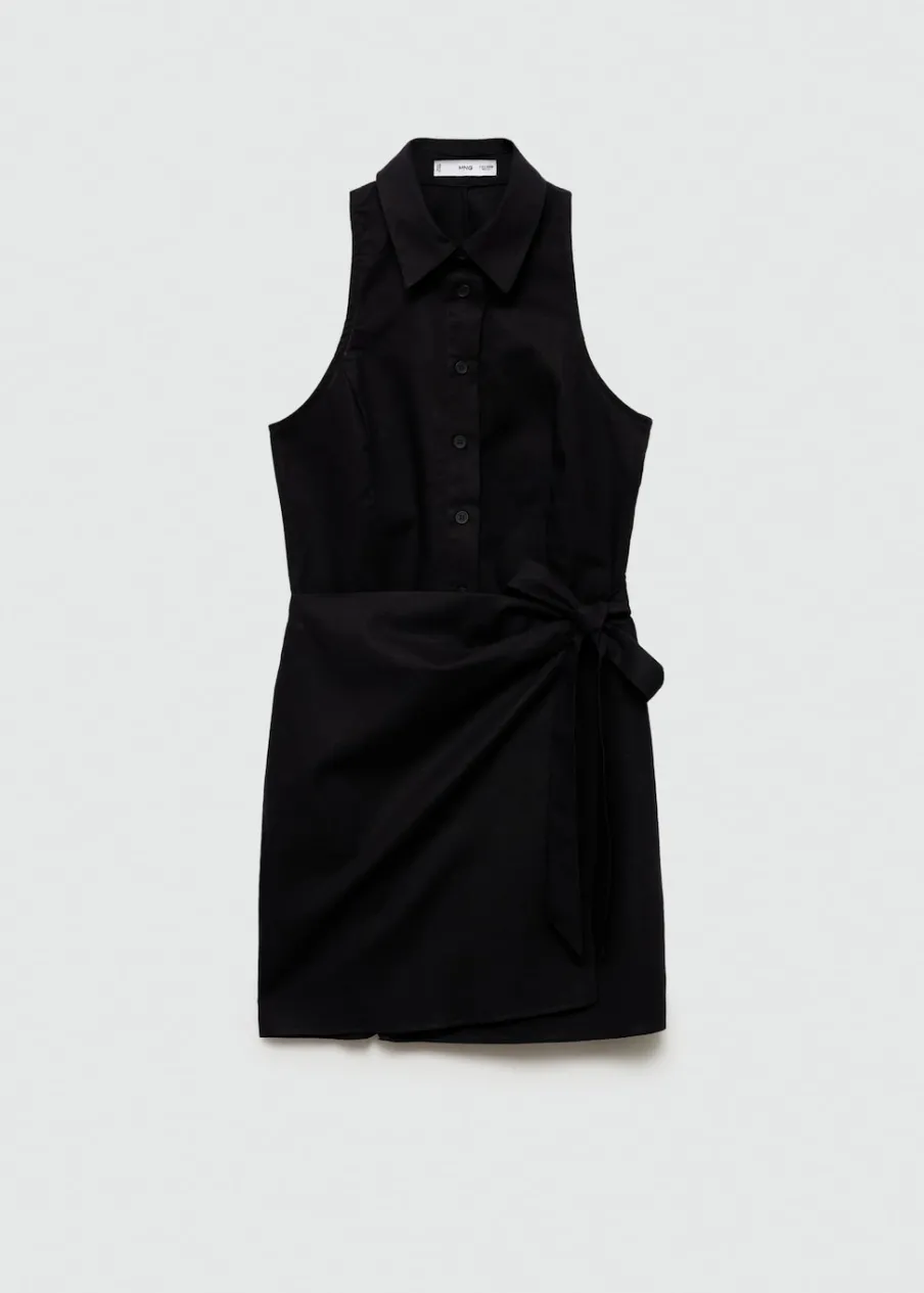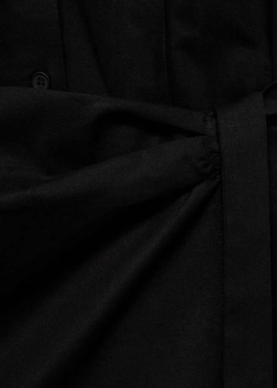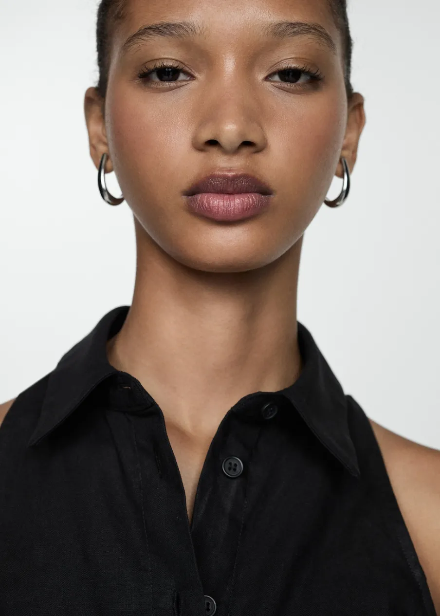 Tkanina mieszana z ramii i bawełny. Krótki krój. Model prosty. Model zakładany. Koszulowy kołnierz. Bez rękawów. Zapięcie na węzełek. Zapięcie na guziki z przodu. Wzór w paski.