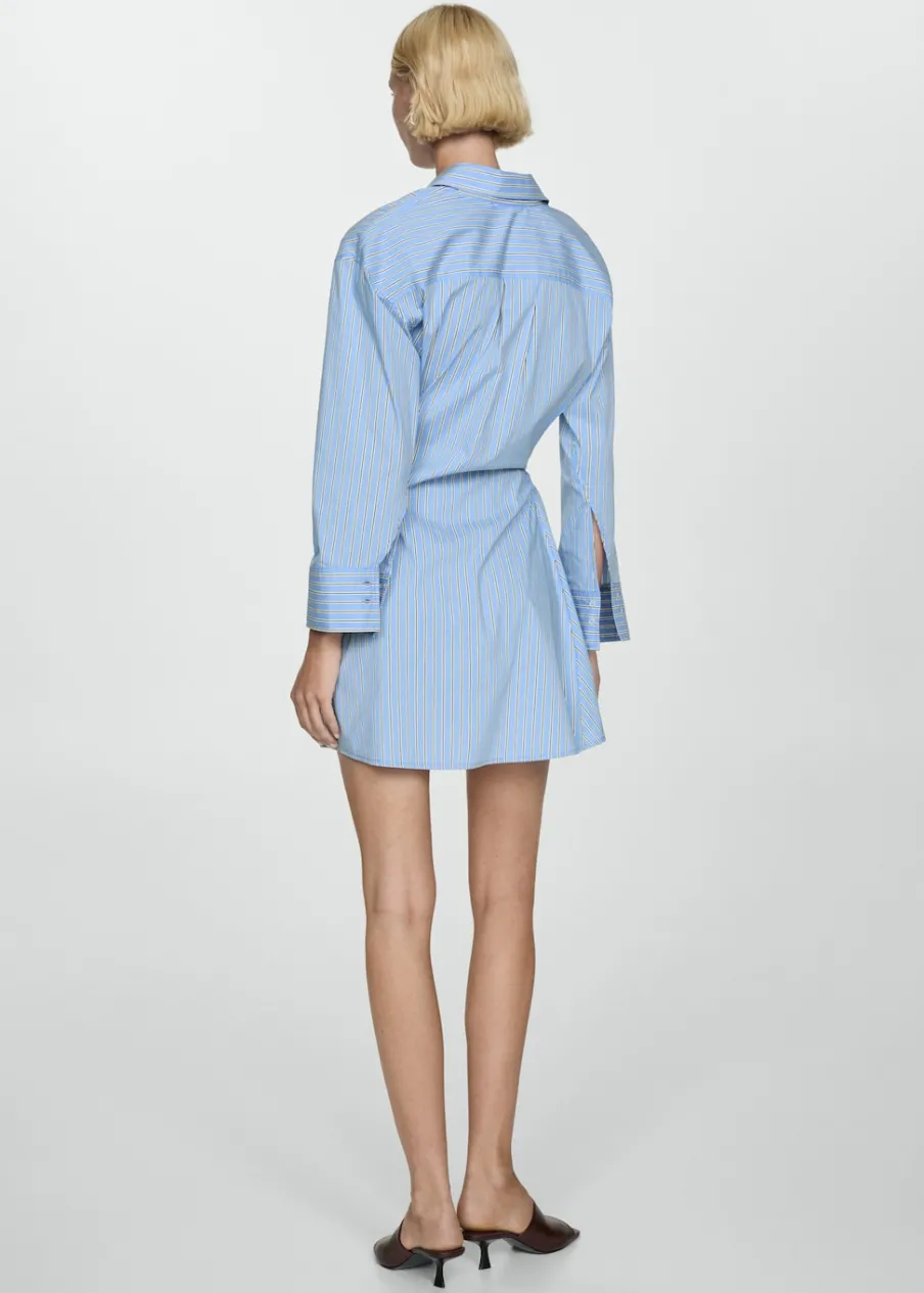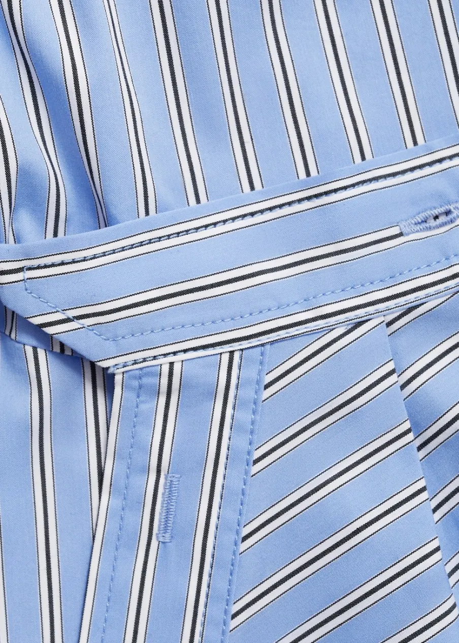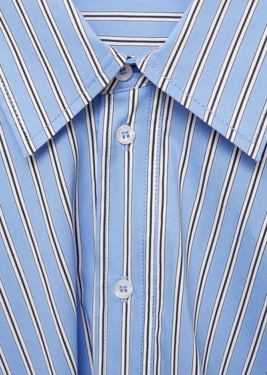 Krótki krój. Wzór w pasy. Koszulowy kołnierz. Długi rękaw z guzikami na mankietach. Dwurzędowe zapięcie na guziki z przodu. Model wcięty. Tkanina z 100% bawełny.