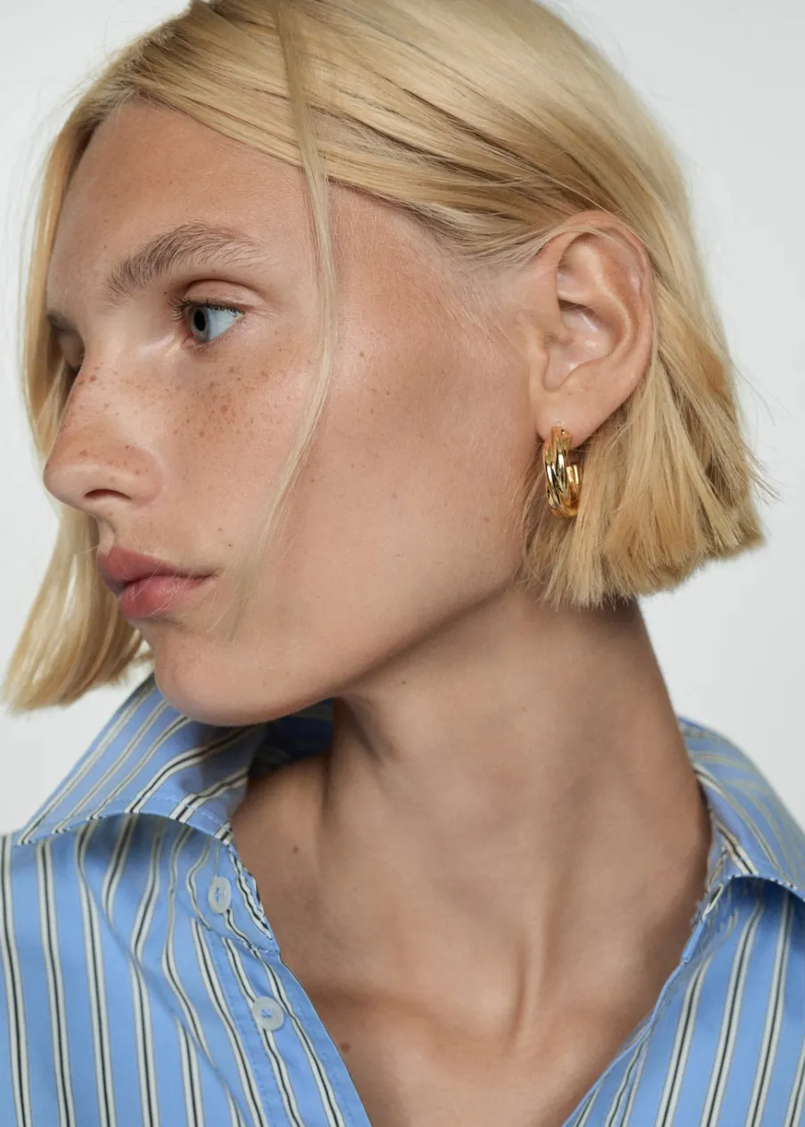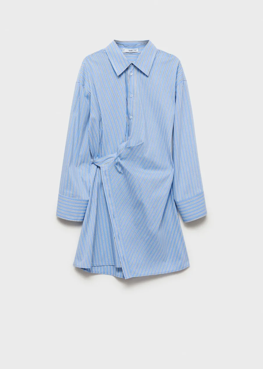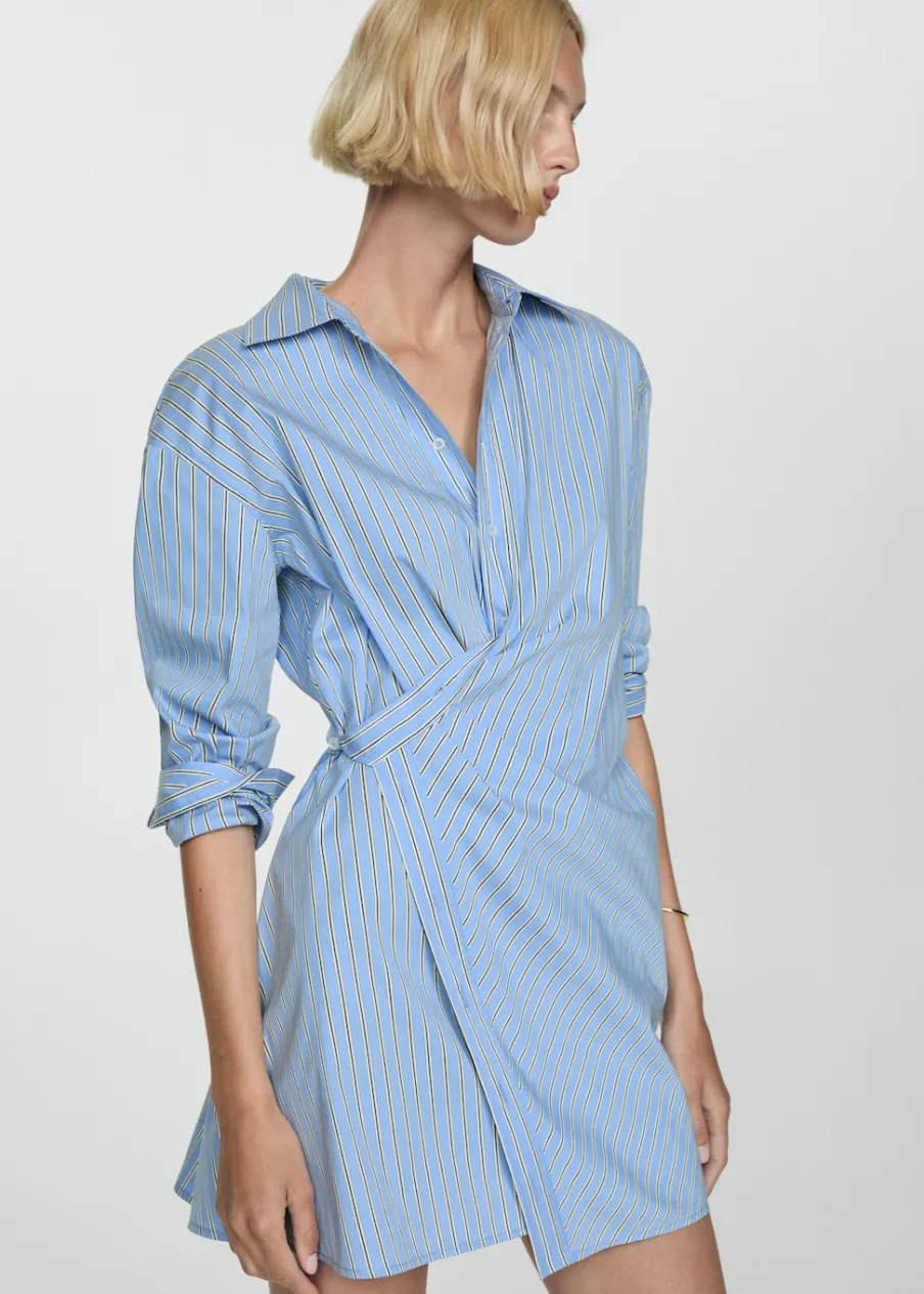 Krótki krój. Wzór w pasy. Koszulowy kołnierz. Długi rękaw z guzikami na mankietach. Dwurzędowe zapięcie na guziki z przodu. Model wcięty. Tkanina z 100% bawełny.