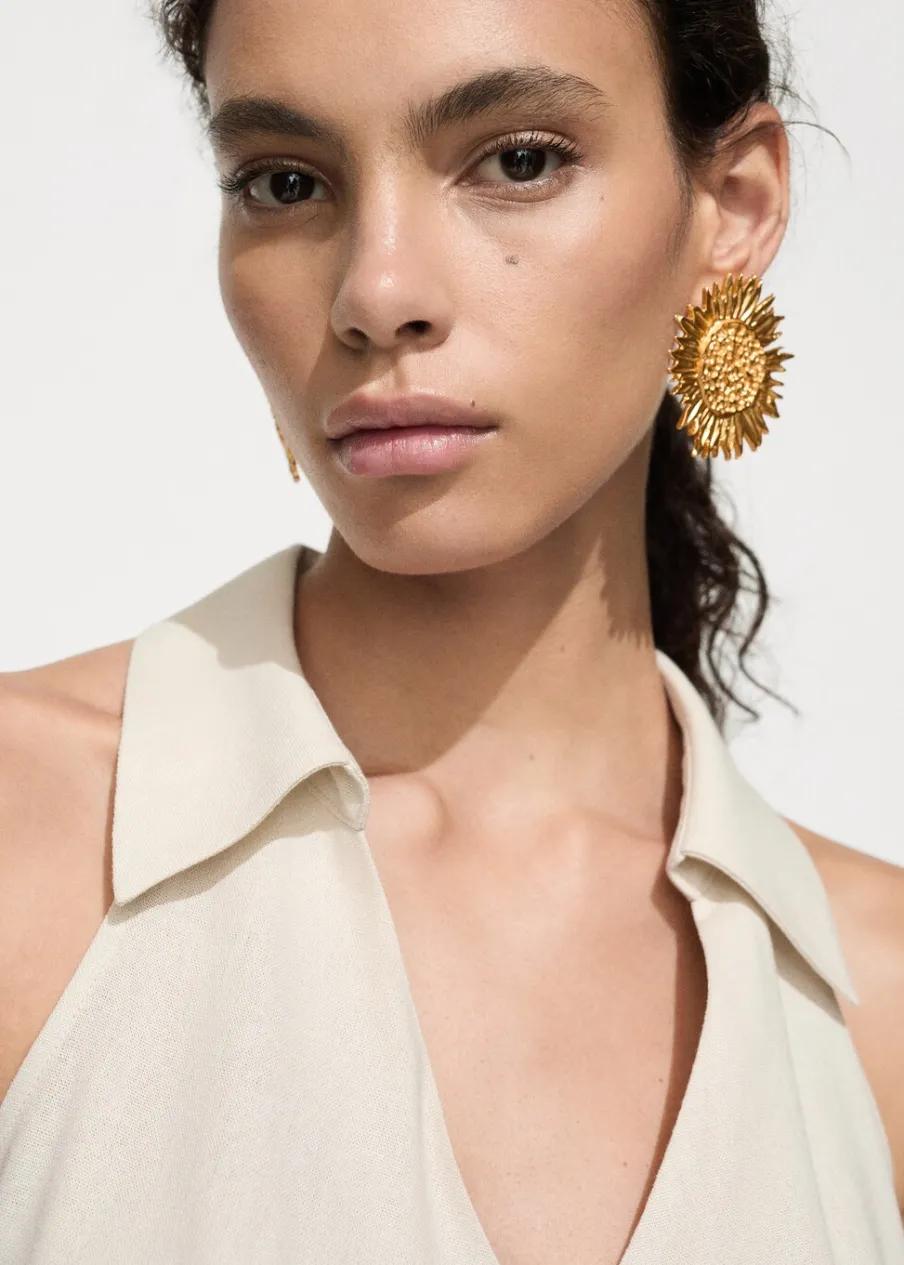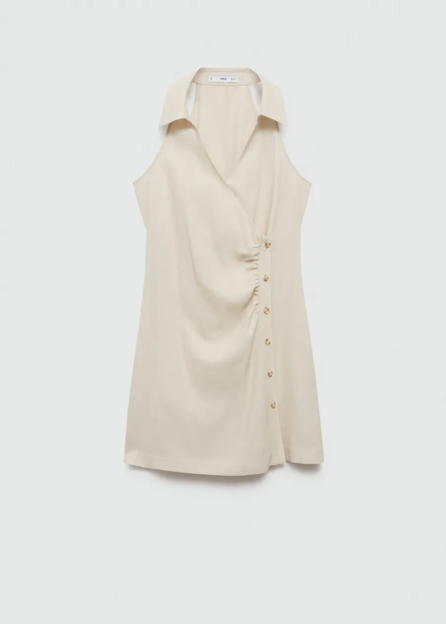 Krótki krój. Koszulowy kołnierz. Zakładany dekolt V. Bez rękawów. Drapowane detale. Bez podszewki. Tkanina mieszana z lyocellu, bawełny i lnu. Zapięcie na guziki z przodu. Model wcięty.
