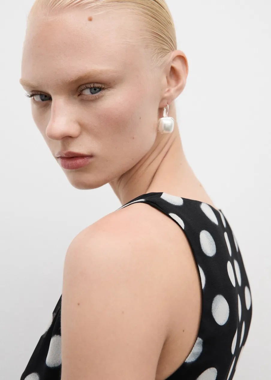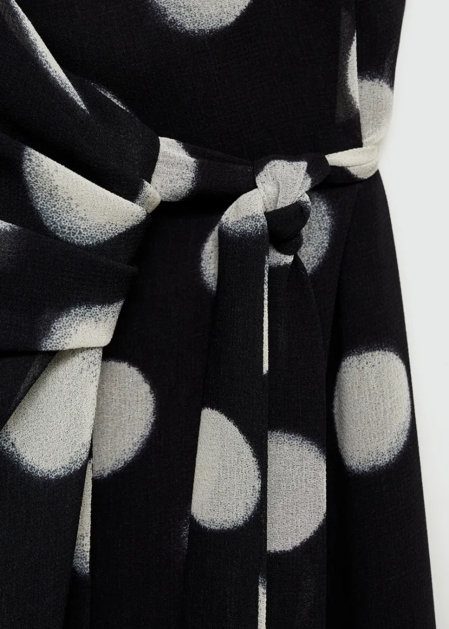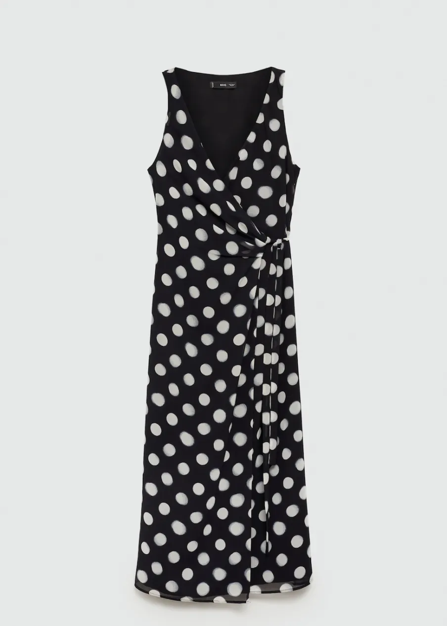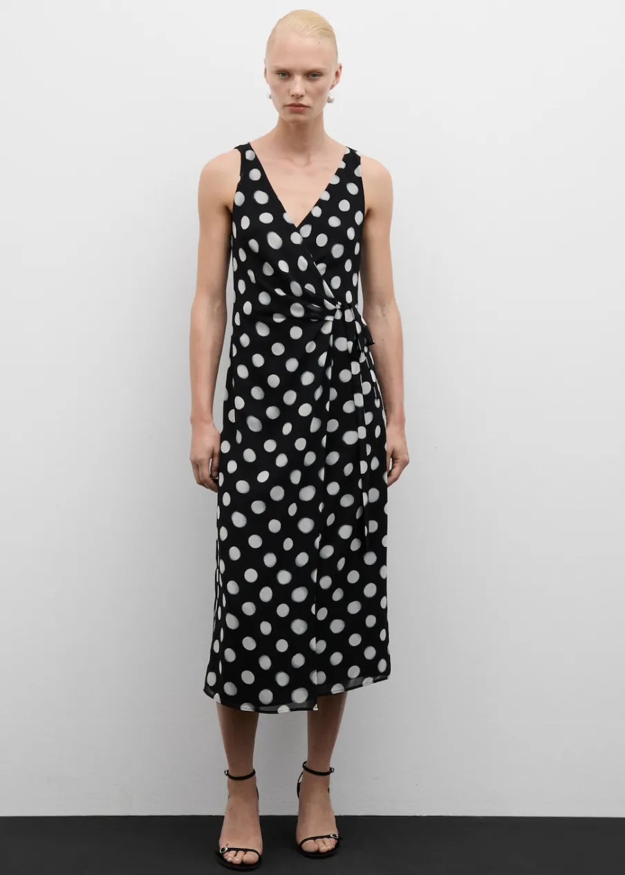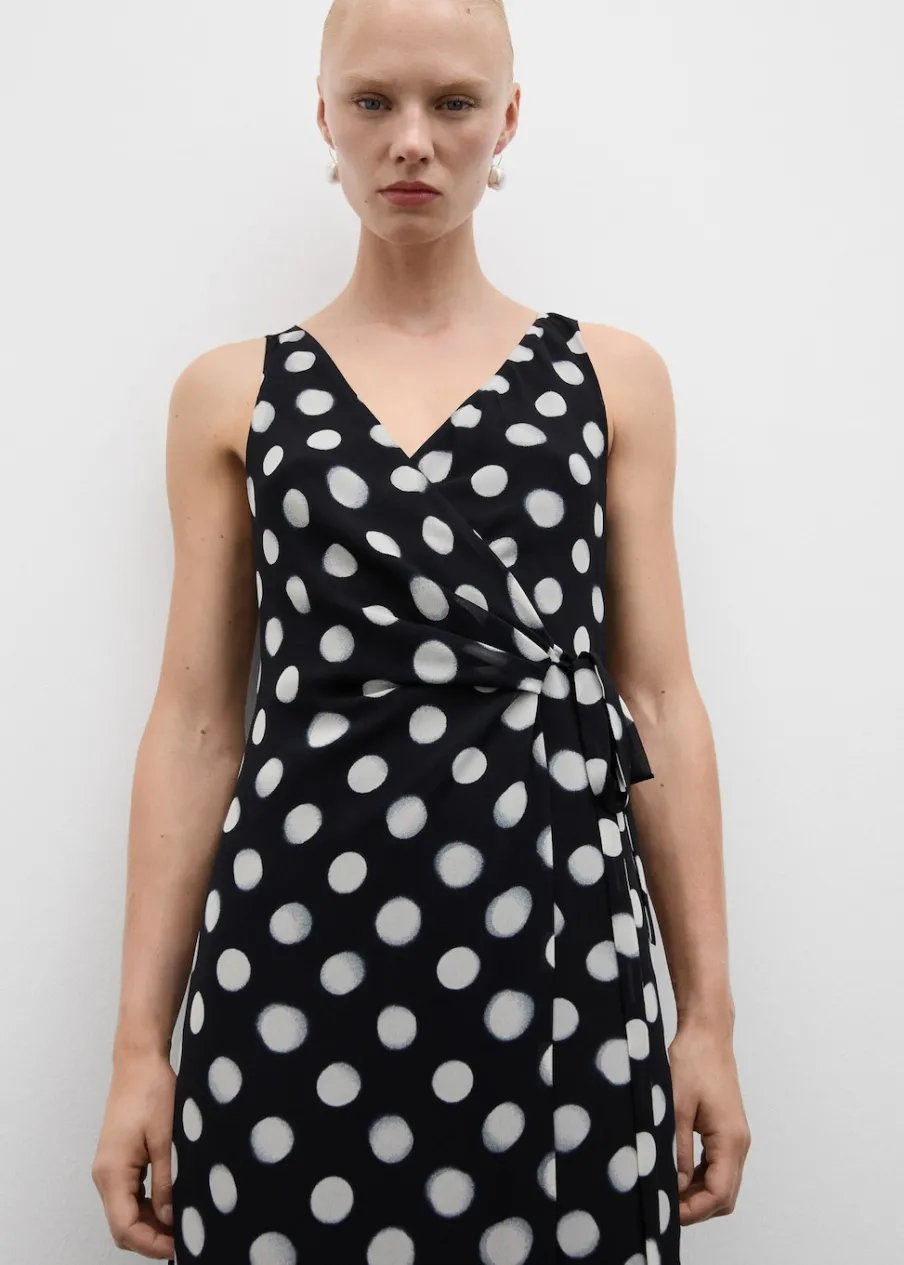 Lejąca tkanina. Model długi. Model prosty. Model zakładany. Wzór w groszki. Dekolt V. Bez rękawów. Szerokie ramiączka. Wiązanie z boku. Wewnętrzna podszewka. Kolekcja wizytowa.
