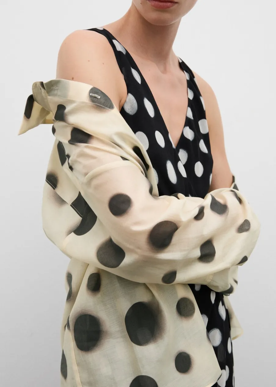 OpisLejąca tkanina. Model długi. Model prosty. Model zakładany. Wzór w groszki. Dekolt V. Bez rękawów. Szerokie ra…