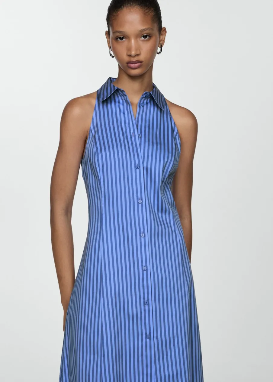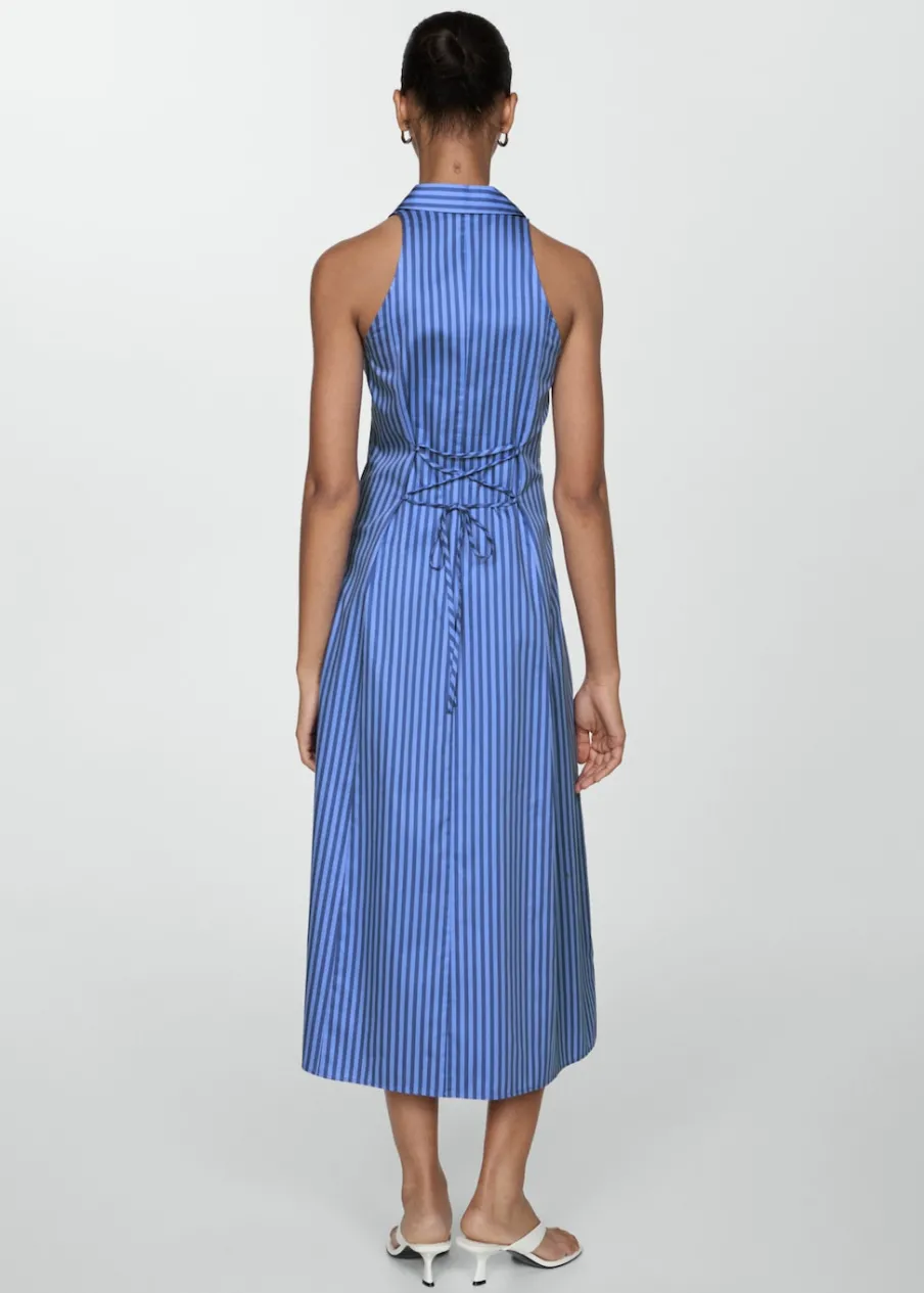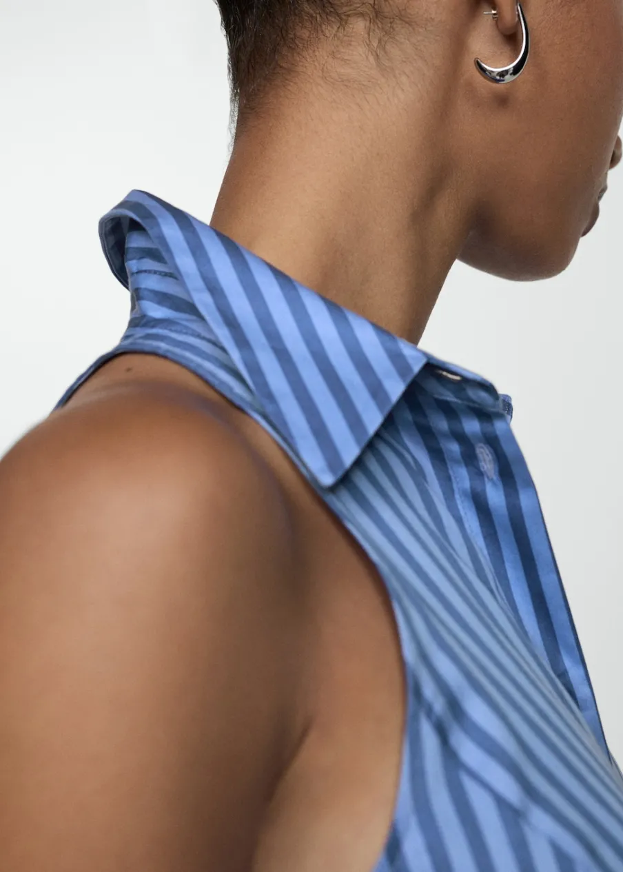 Model prosty. Krój do kolan. Wzór w pasy. Koszulowy kołnierz. Bez rękawów. Regulowane wiązanie na plecach. Zapięcie na guziki z przodu. Tkanina z 100% bawełny.