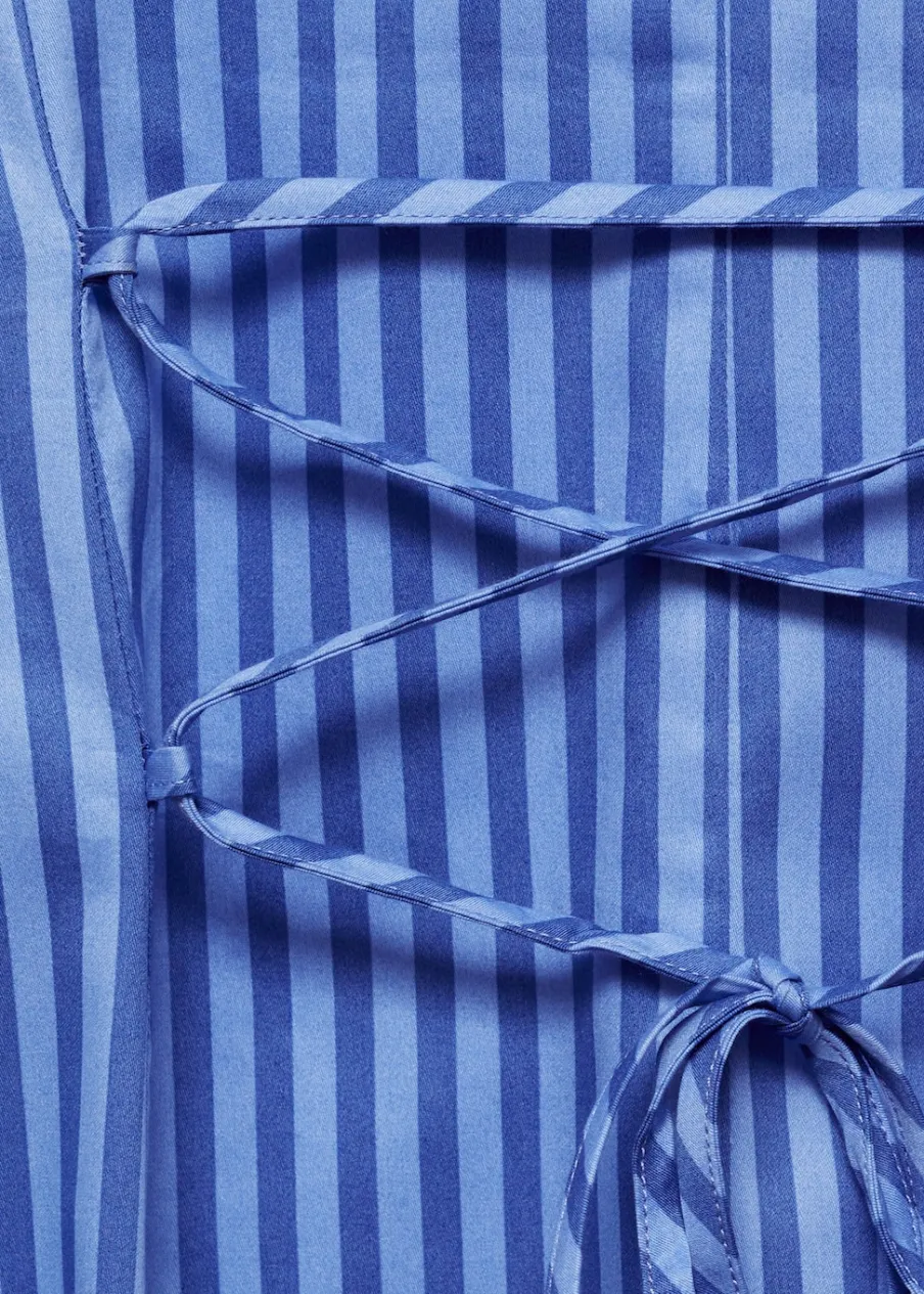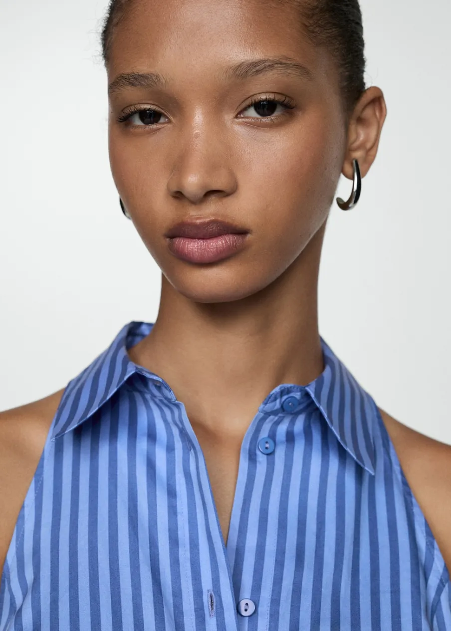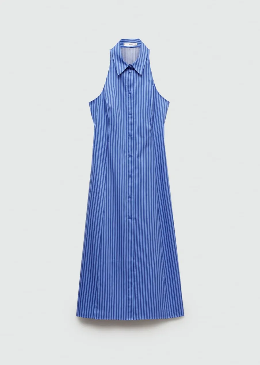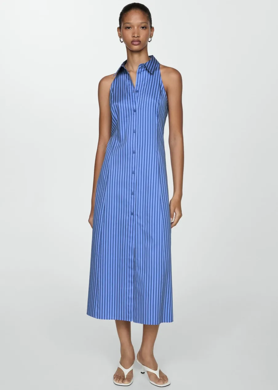 Model prosty. Krój do kolan. Wzór w pasy. Koszulowy kołnierz. Bez rękawów. Regulowane wiązanie na plecach. Zapięcie na guziki z przodu. Tkanina z 100% bawełny.