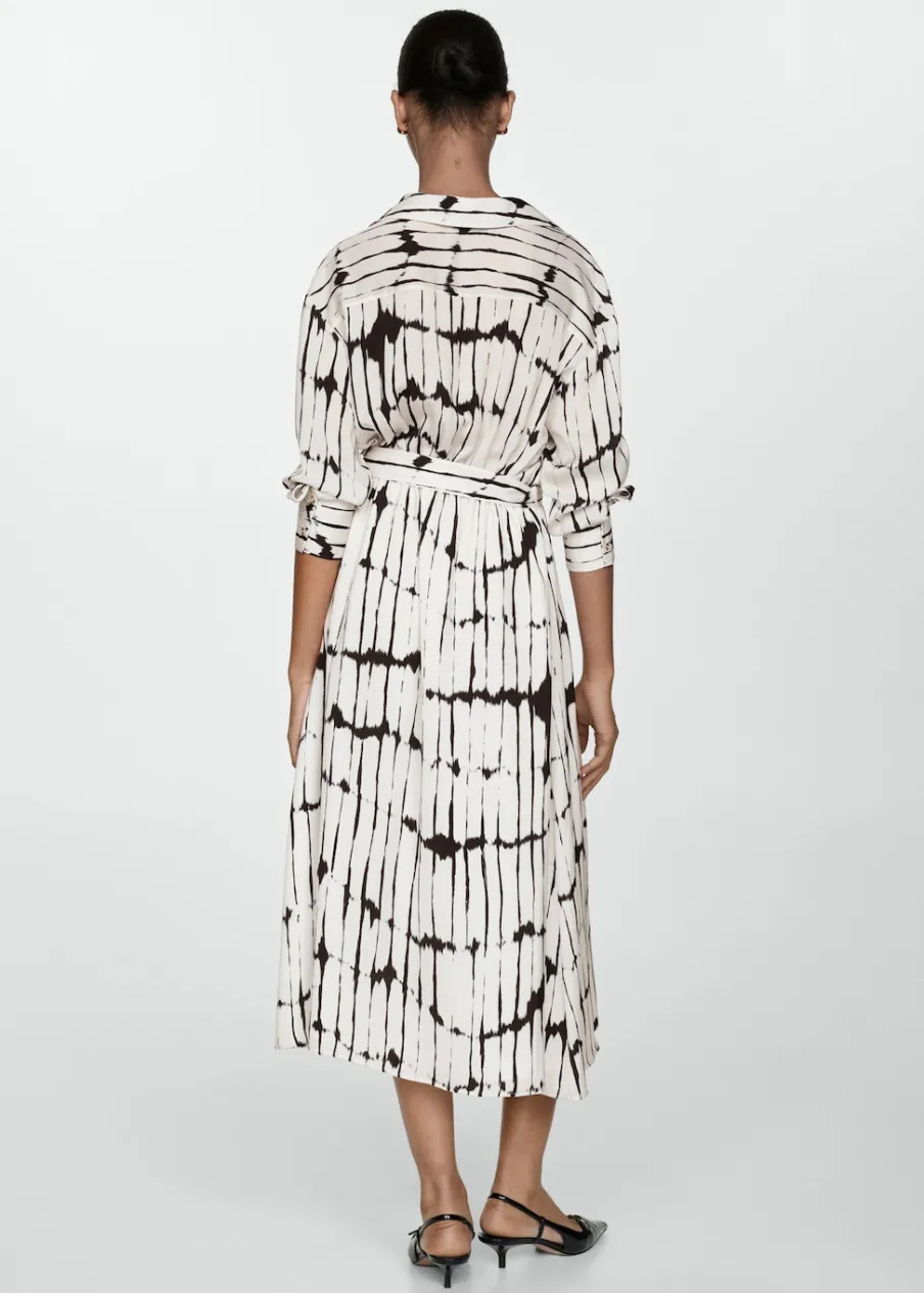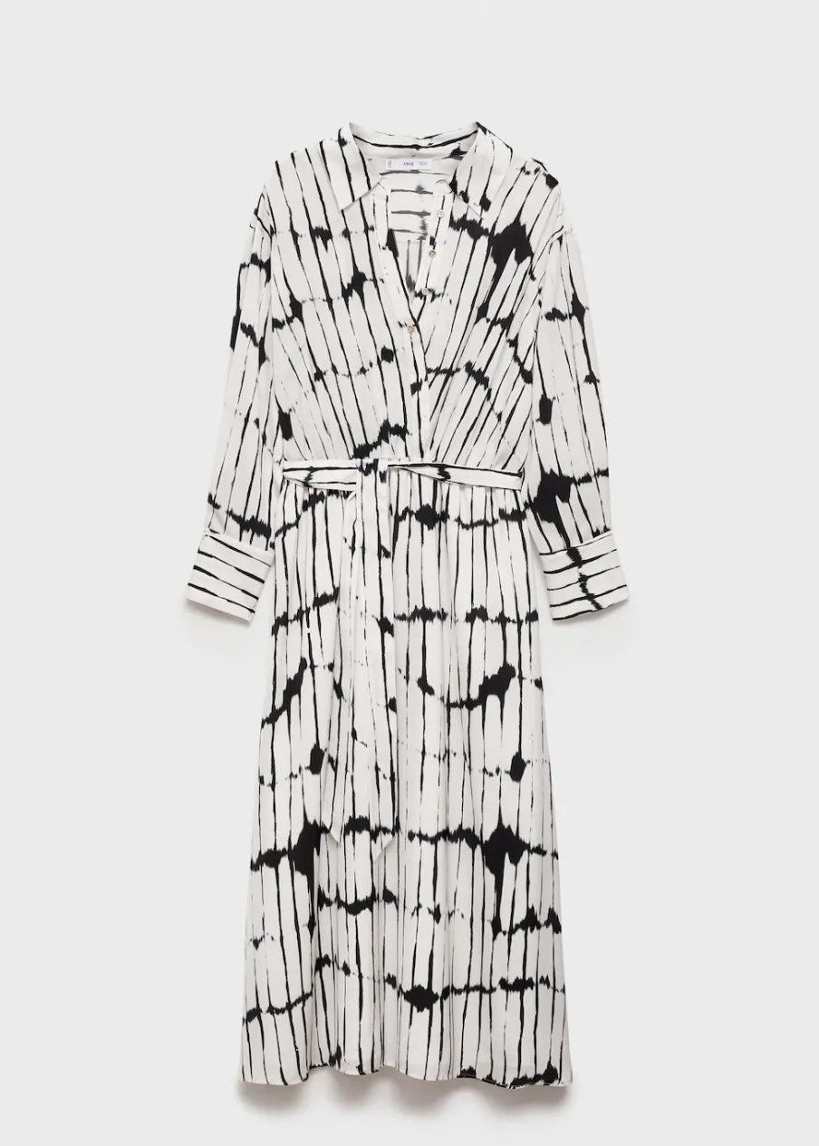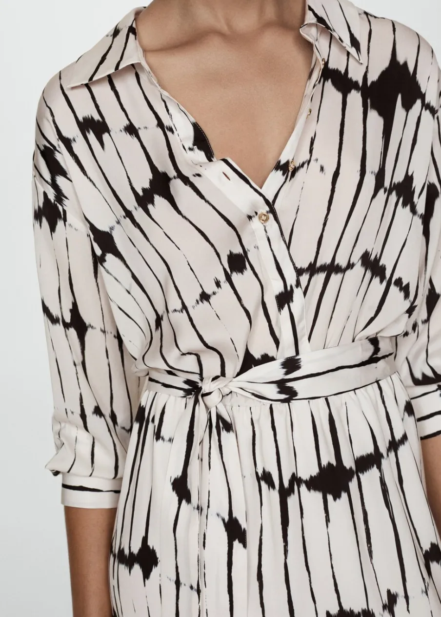 Lejąca tkanina. Krój do kolan. Model evasé. Koszulowy kołnierz. Długi rękaw z guzikami na mankietach. Odpinany pasek. Szlufki. Zapięcie z przodu na guziki. Nadruk.