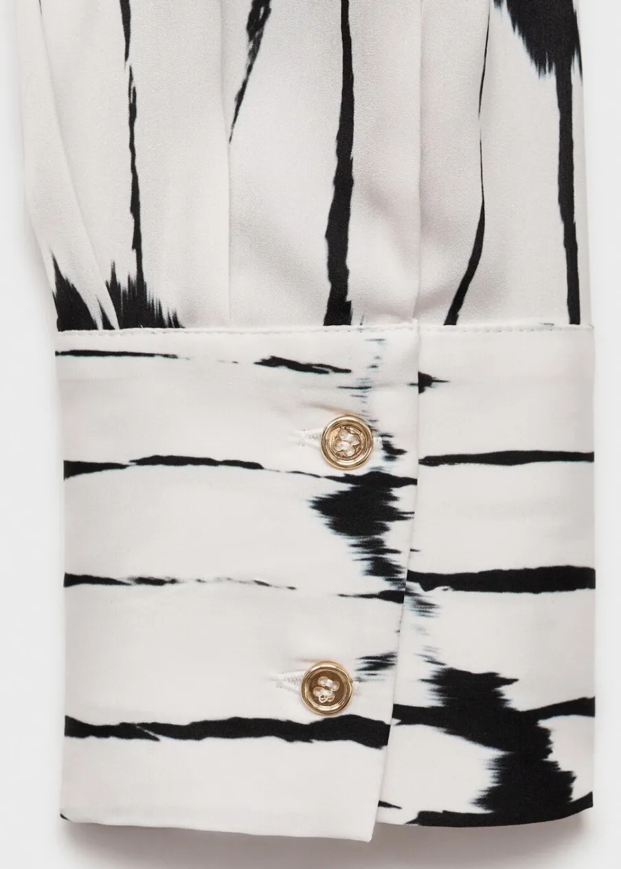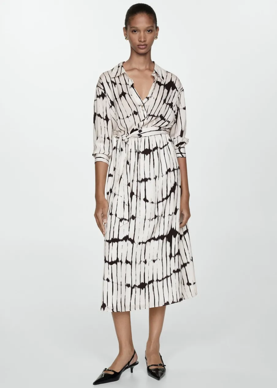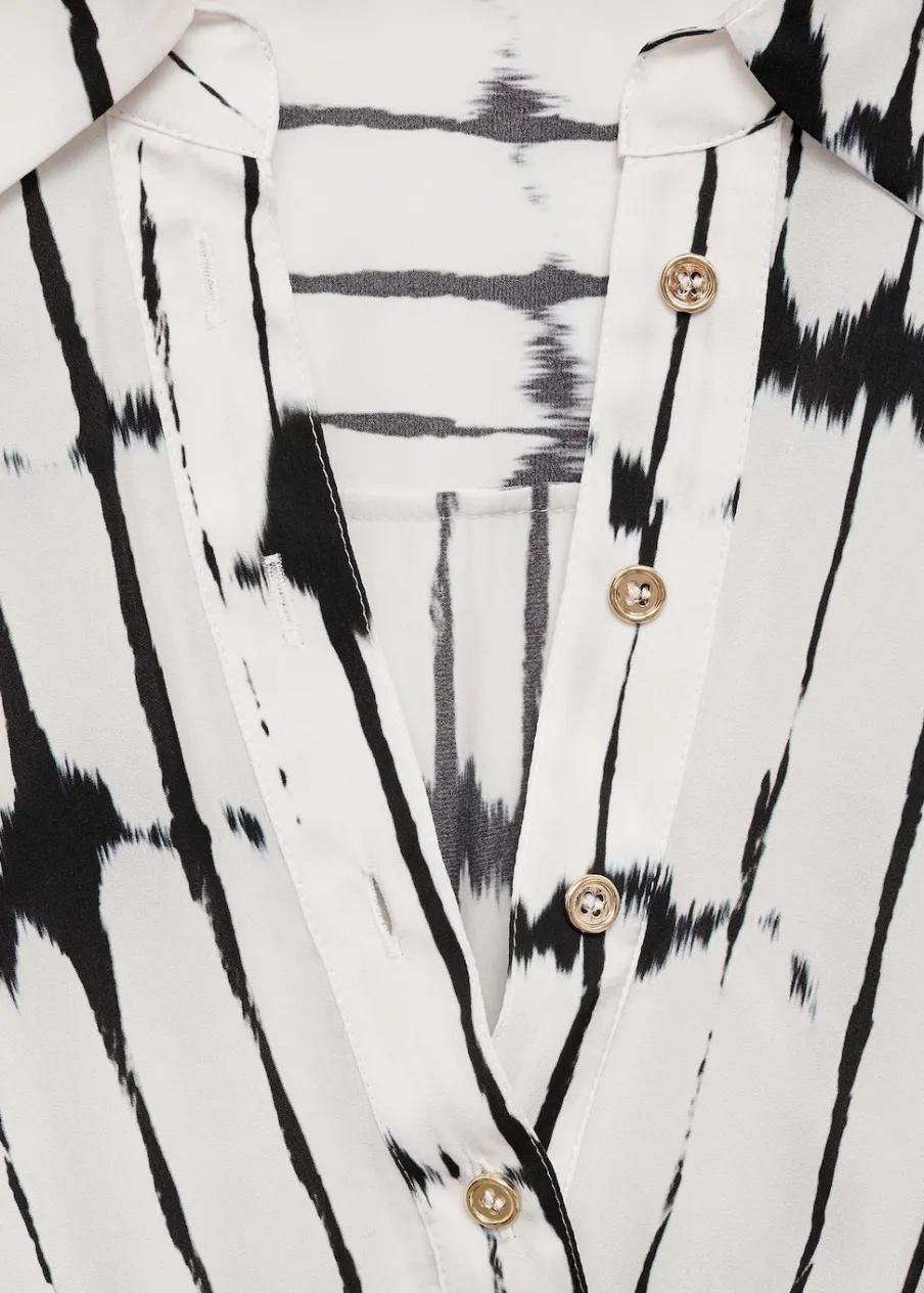 Lejąca tkanina. Krój do kolan. Model evasé. Koszulowy kołnierz. Długi rękaw z guzikami na mankietach. Odpinany pasek. Szlufki. Zapięcie z przodu na guziki. Nadruk.