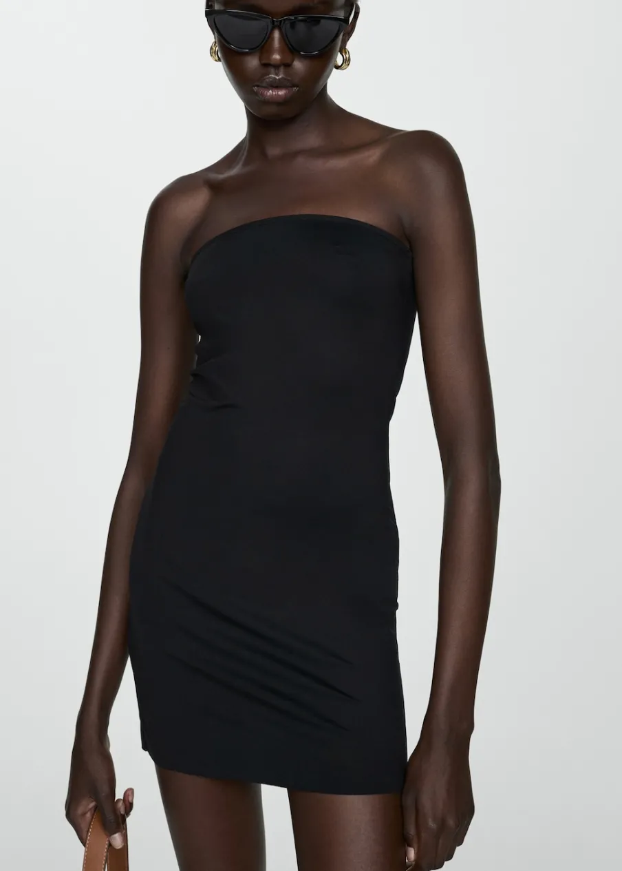 Elastyczna tkanina. Krótki krój. Fason z odkrytymi ramionami. Dekolt bez ramiączek. Bez rękawów. Bez zapięcia. Model wcięty.