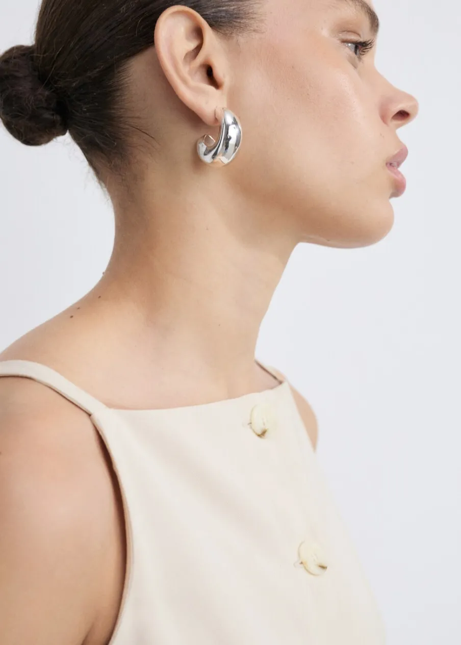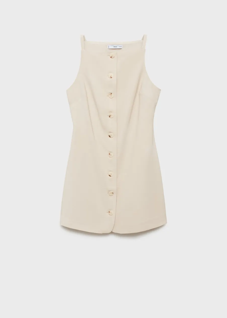 Lejąca tkanina. Model prosty. Krótki krój. Kwadratowy dekolt. Bez rękawów. Cienkie ramiączka. Wewnętrzna podszewka. Zapięcie na guziki z przodu.