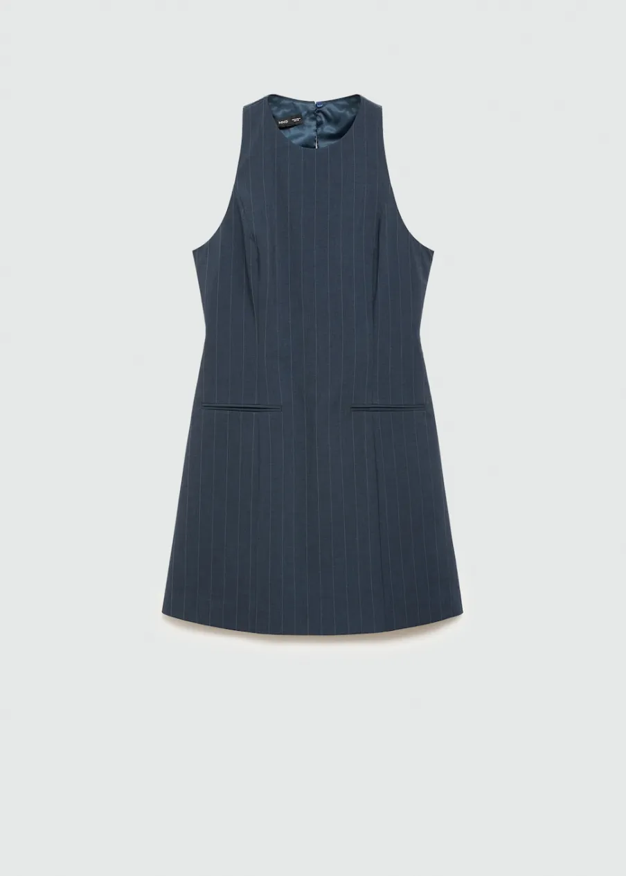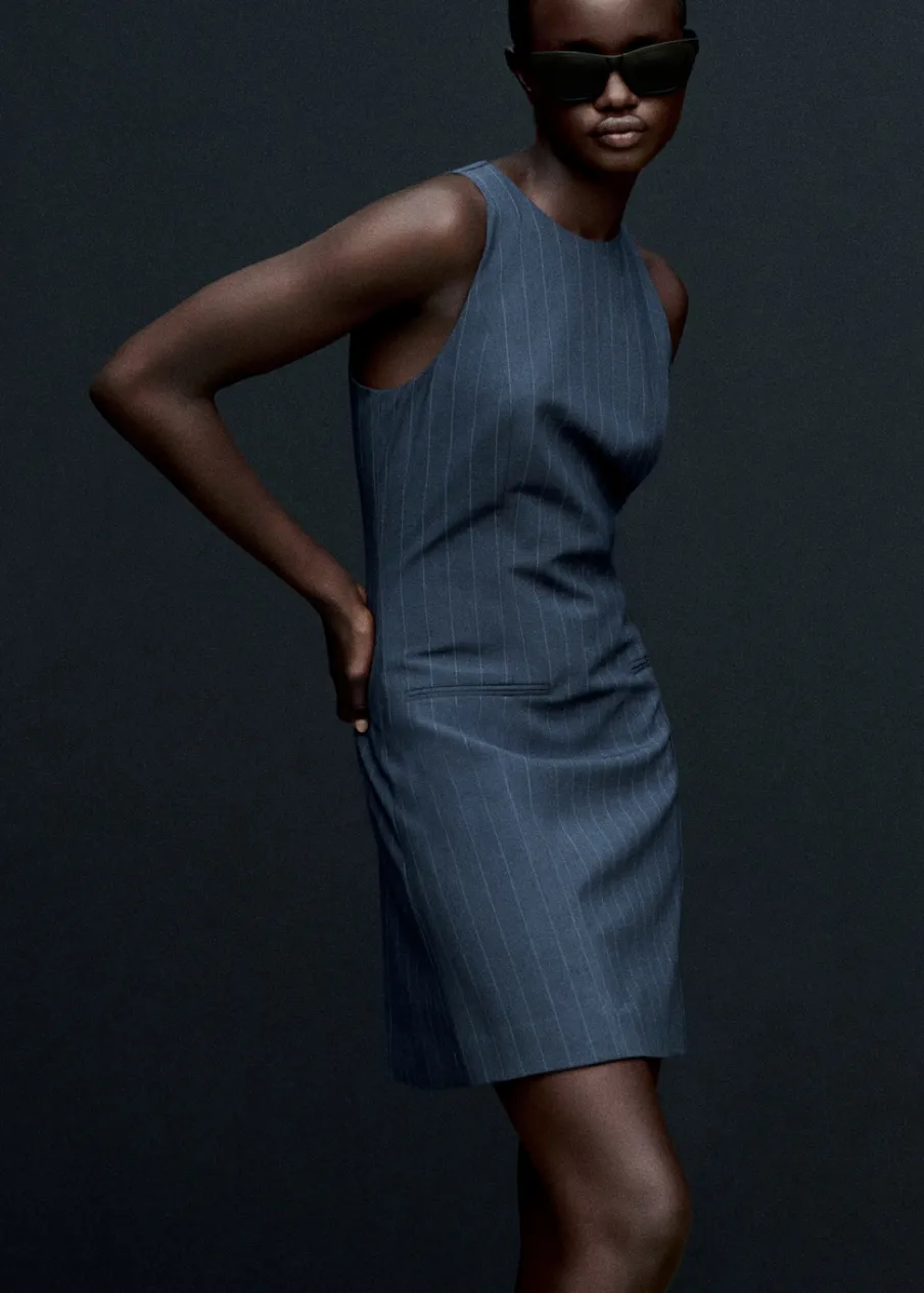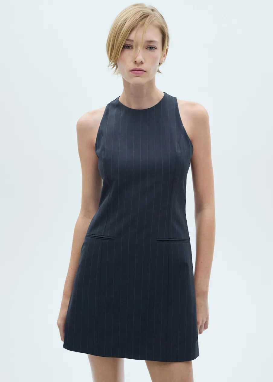 Wzór w prążki. Okrągły dekolt. Bez rękawów. Zapięcie z tyłu na kryty suwak. Zapięcie na guzik z tyłu. Dwie wpuszczene kieszenie z przodu. Detal z zakładkami. Modelka ma 181 cm wzrostu i nosi rozmiar S/36. Krótki krój. Model evasé.