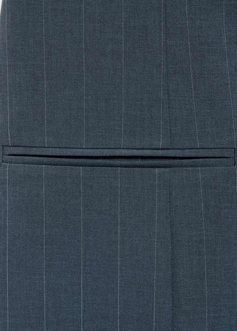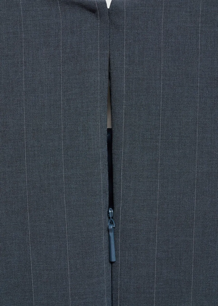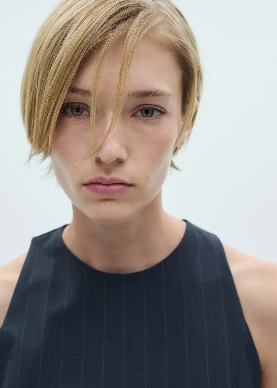 Wzór w prążki. Okrągły dekolt. Bez rękawów. Zapięcie z tyłu na kryty suwak. Zapięcie na guzik z tyłu. Dwie wpuszczene kieszenie z przodu. Detal z zakładkami. Modelka ma 181 cm wzrostu i nosi rozmiar S/36. Krótki krój. Model evasé.