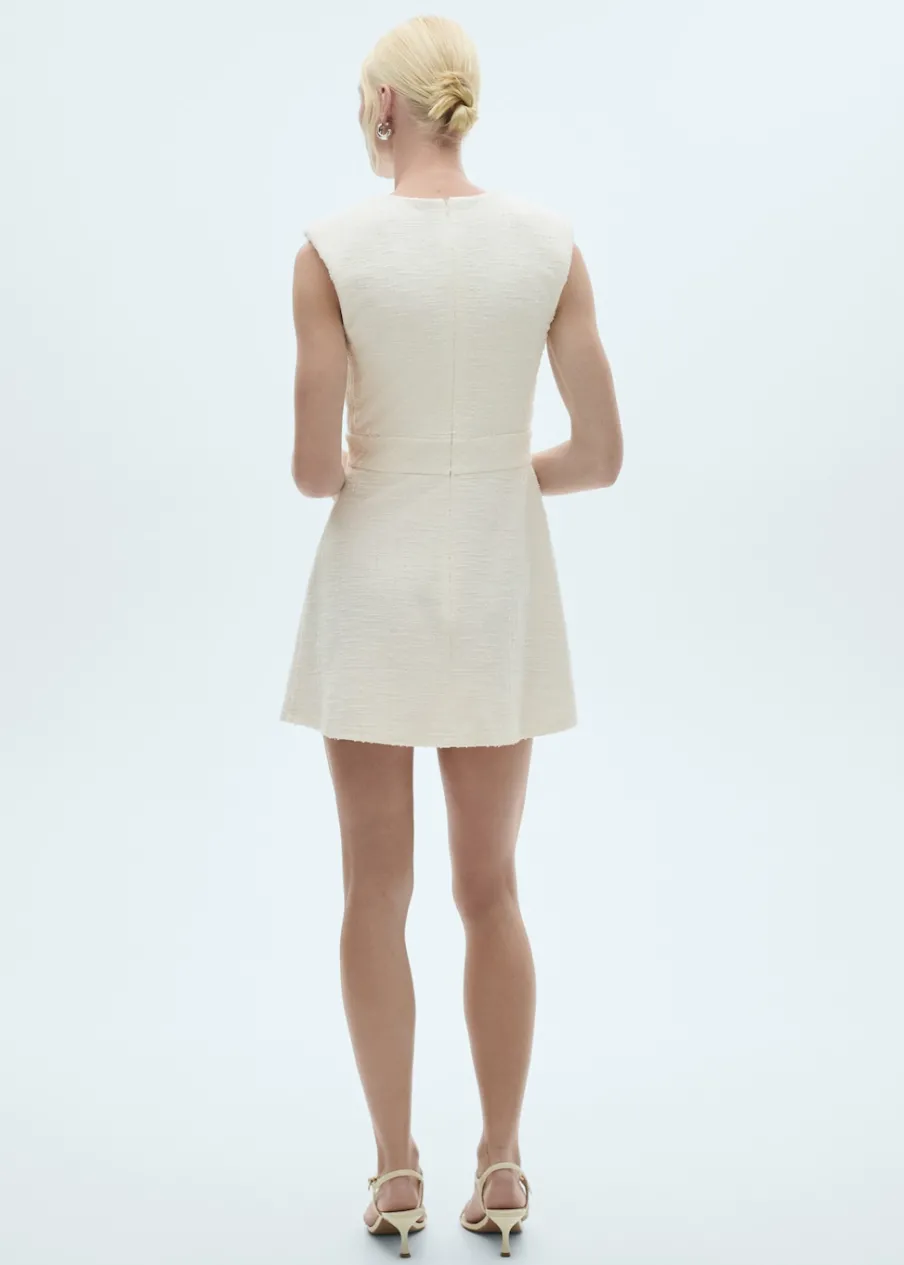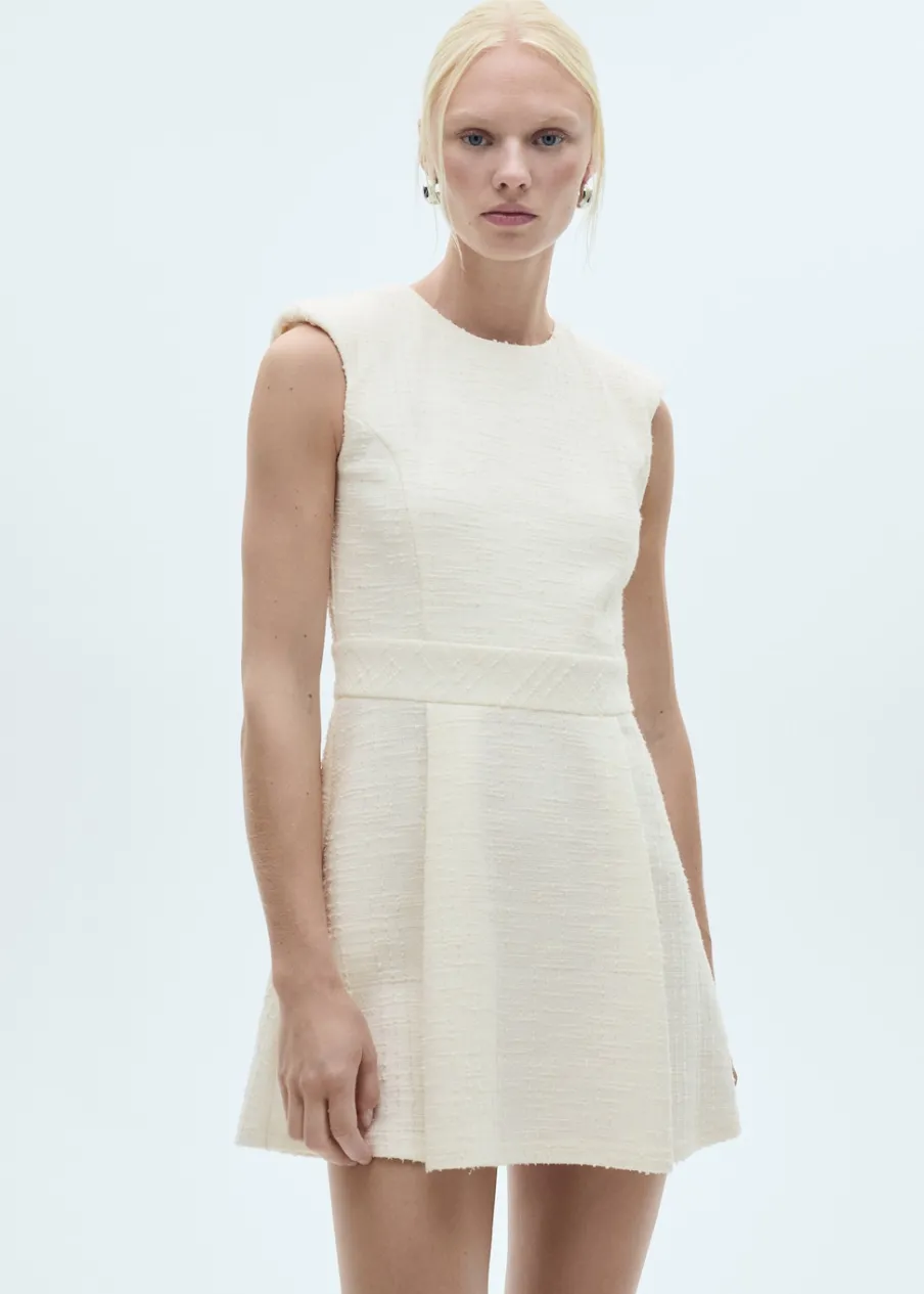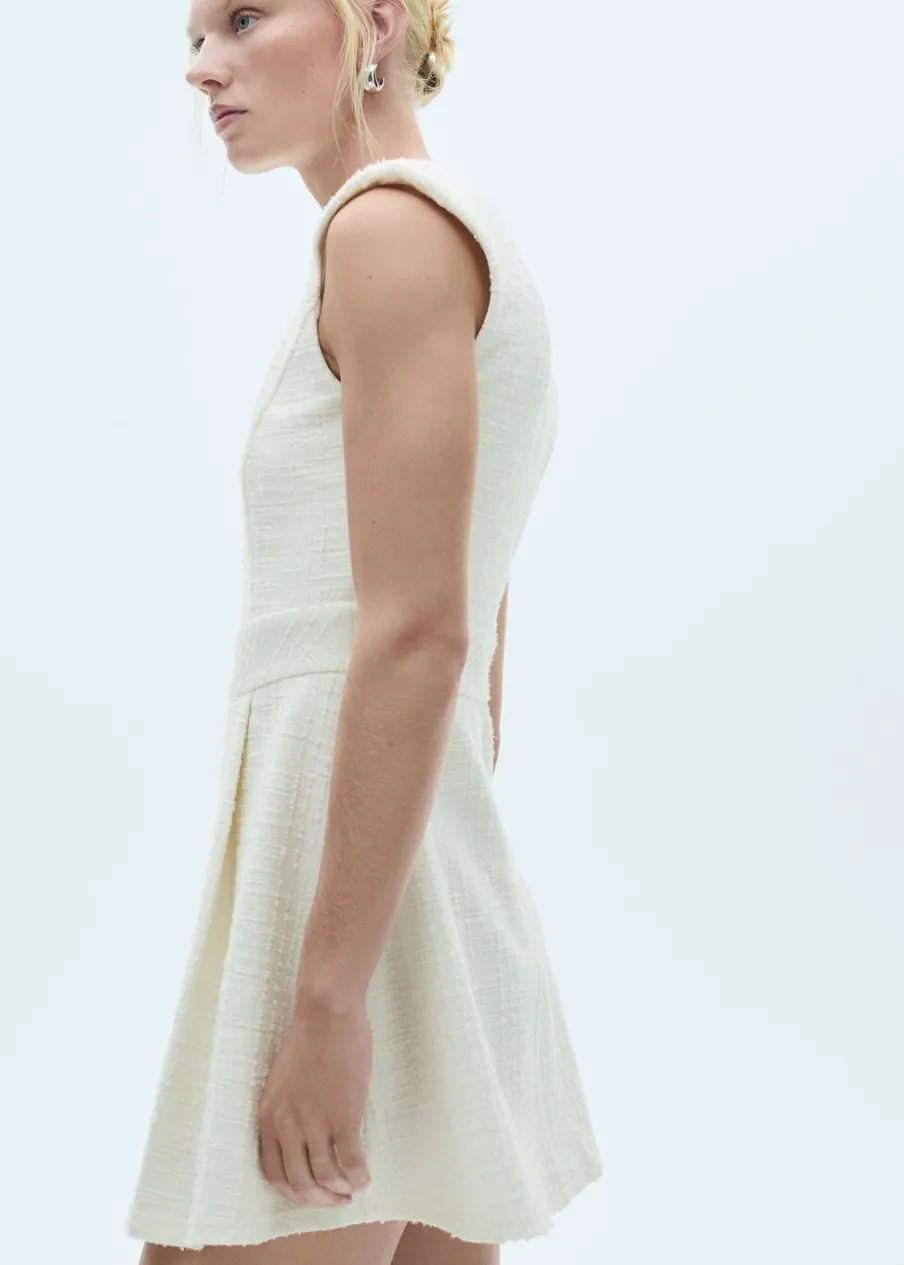 Bez rękawów. Model evasé. Okrągły dekolt. Zapięcie z tyłu na suwak. Wewnętrzna podszewka. Krótki krój. Total look. Tkanina mieszanka bawełny. Teksturowana tkanina. Szerokie ramiączka. Modelka ma 178 cm wzrostu i nosi rozmiar S/36.