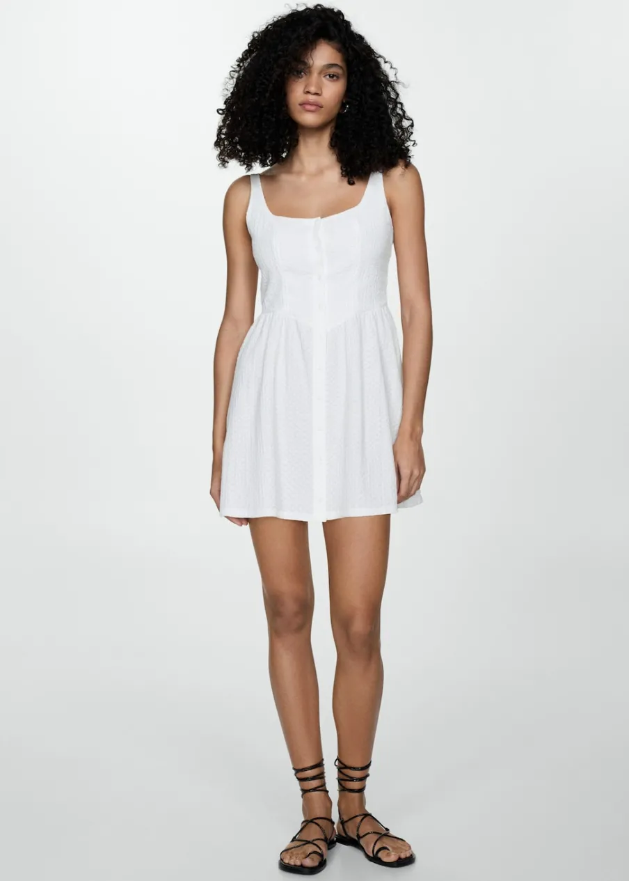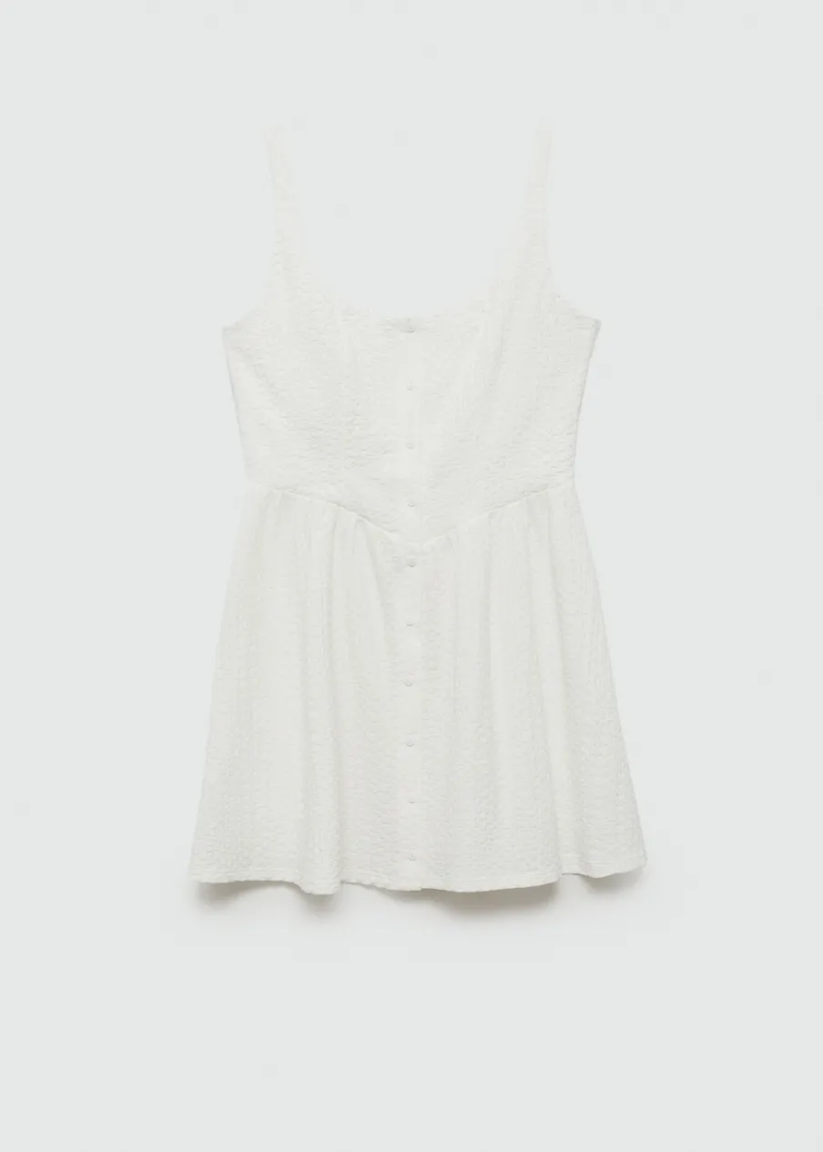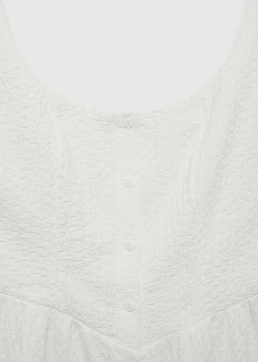 Lejąca tkanina. Teksturowana tkanina. Model evasé. Krótki krój. Kwadratowy dekolt. Bez rękawów. Cienkie ramiączka. Zapięcie na guziki z przodu.