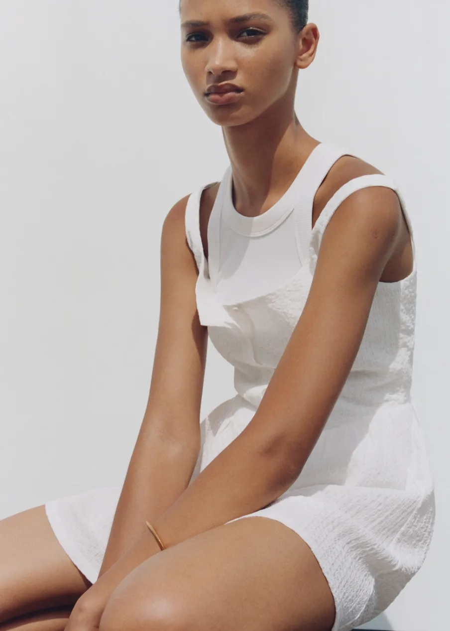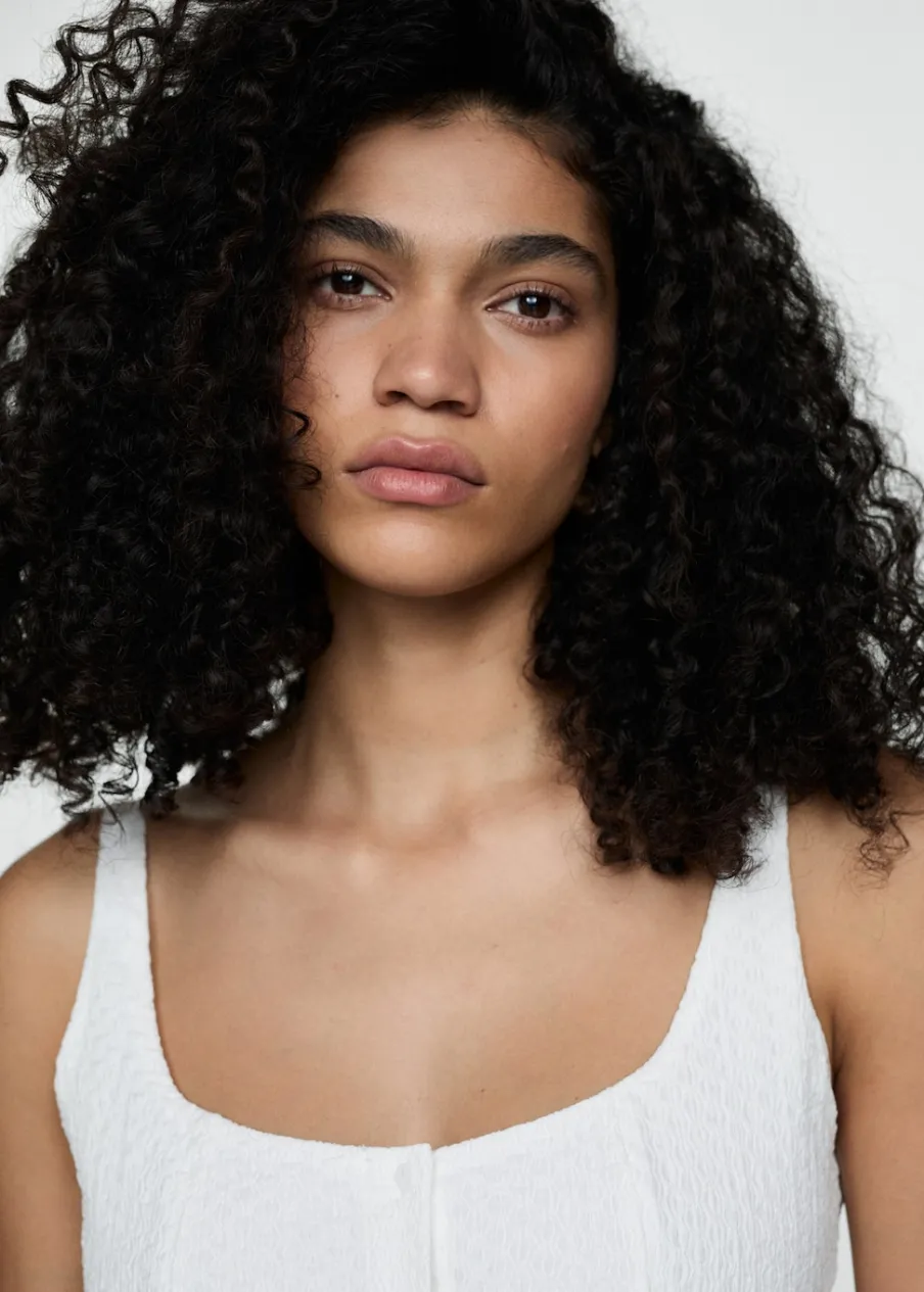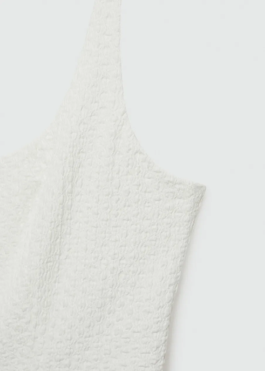Lejąca tkanina. Teksturowana tkanina. Model evasé. Krótki krój. Kwadratowy dekolt. Bez rękawów. Cienkie ramiączka. Zapięcie na guziki z przodu.