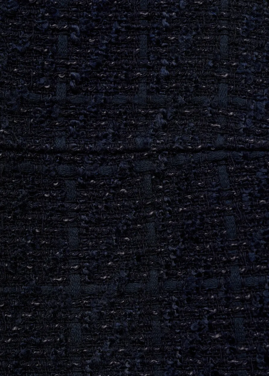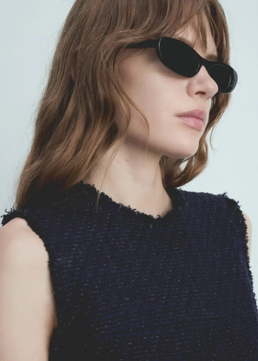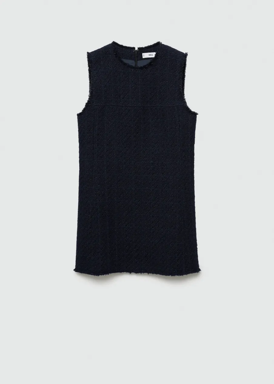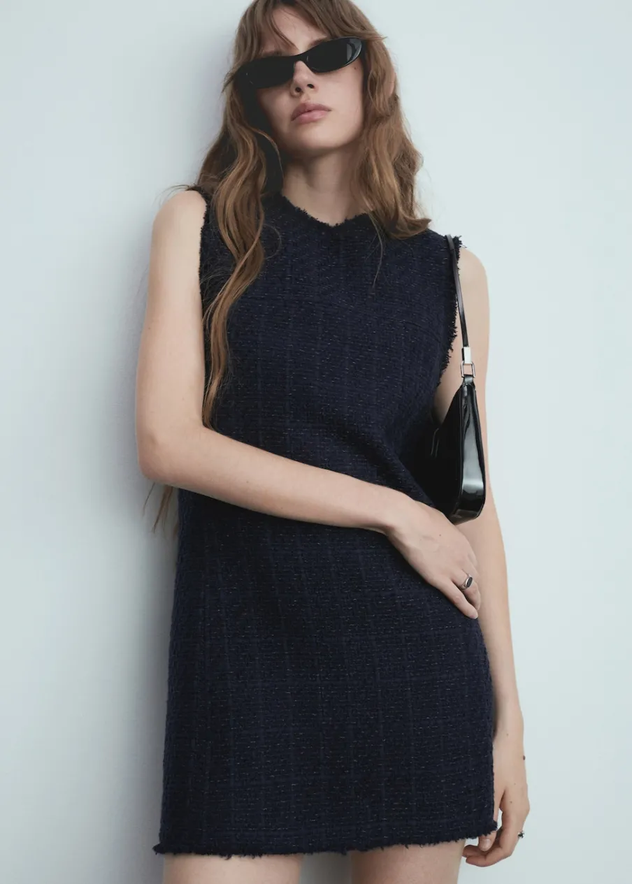Tkanina tweedowa. Model prosty. Krótki krój. Okrągły dekolt. Szerokie ramiączka. Bez rękawów. Zapięcie z tyłu na suwak. Wewnętrzna podszewka. Postrzępione wykończenia.