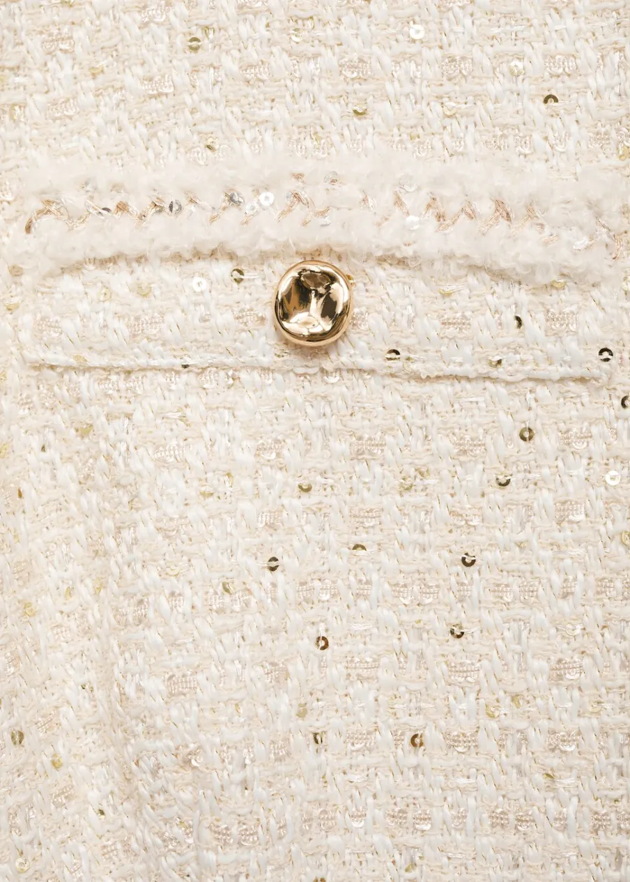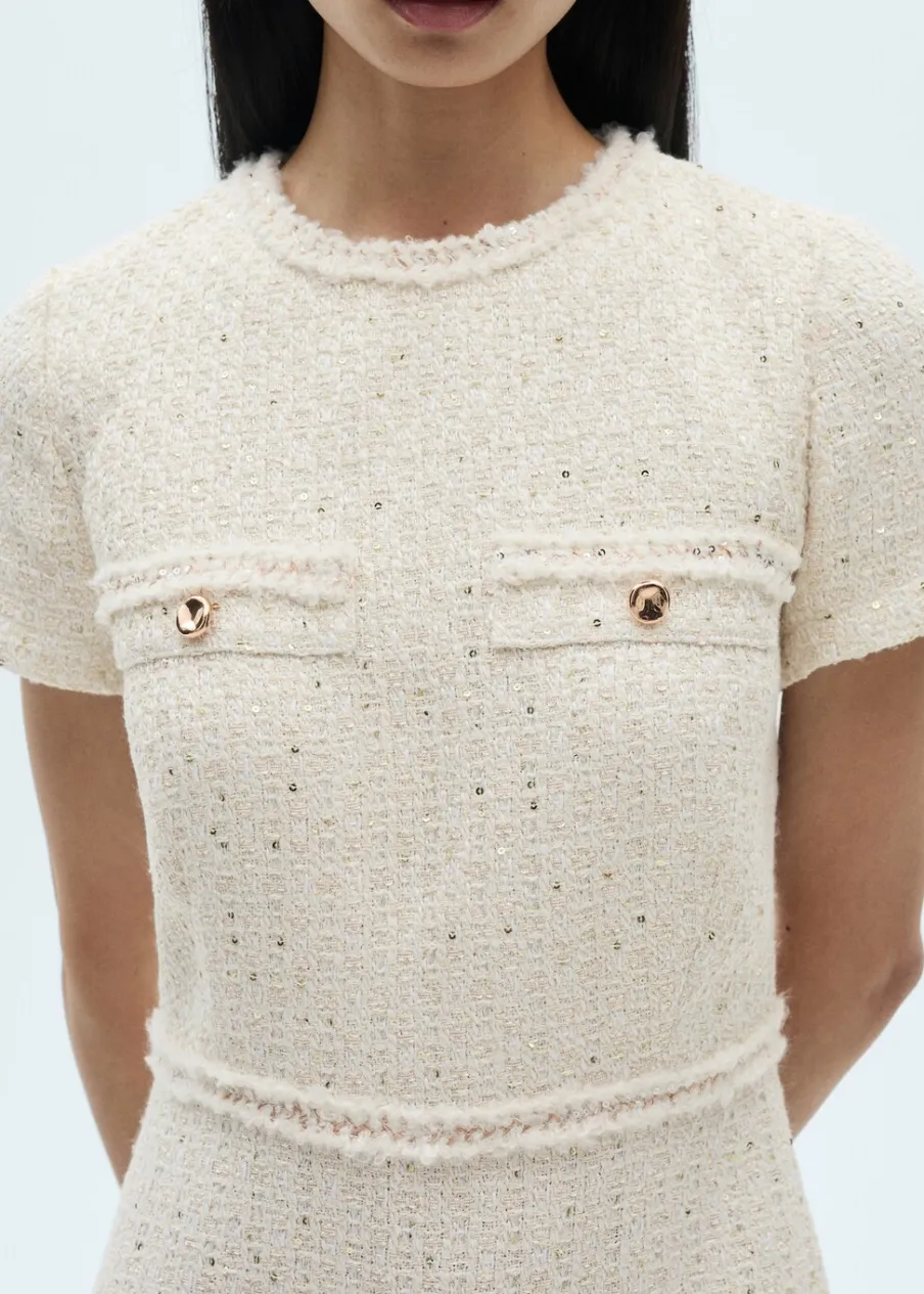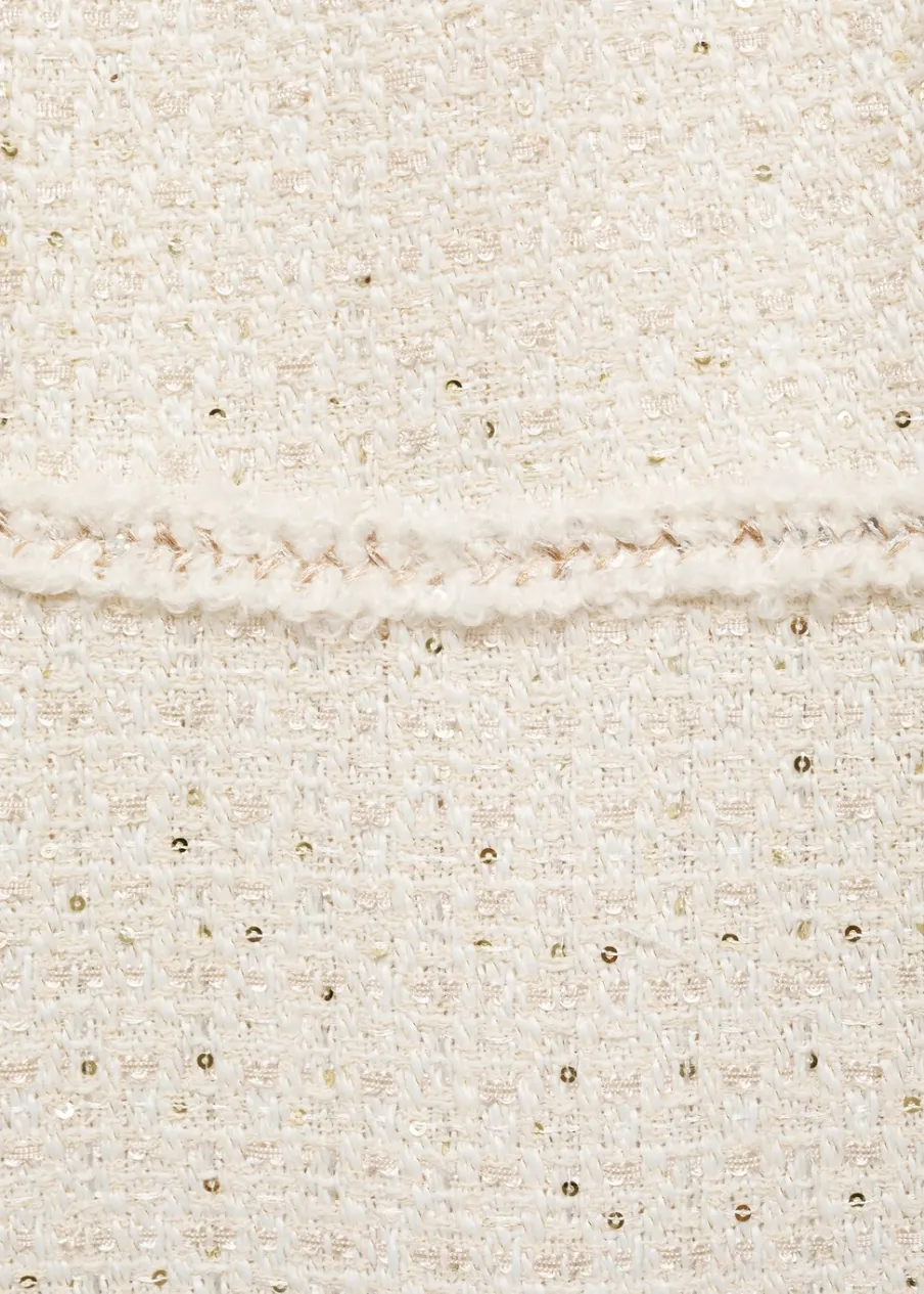 Tkanina tweedowa. Model prosty. Krótki krój. Okrągły dekolt. Krótki rękaw. Dwie wpuszczane kieszenie z patkami na piersi. Zapięcie z tyłu na suwak. Szew w talii. Wewnętrzna podszewka.